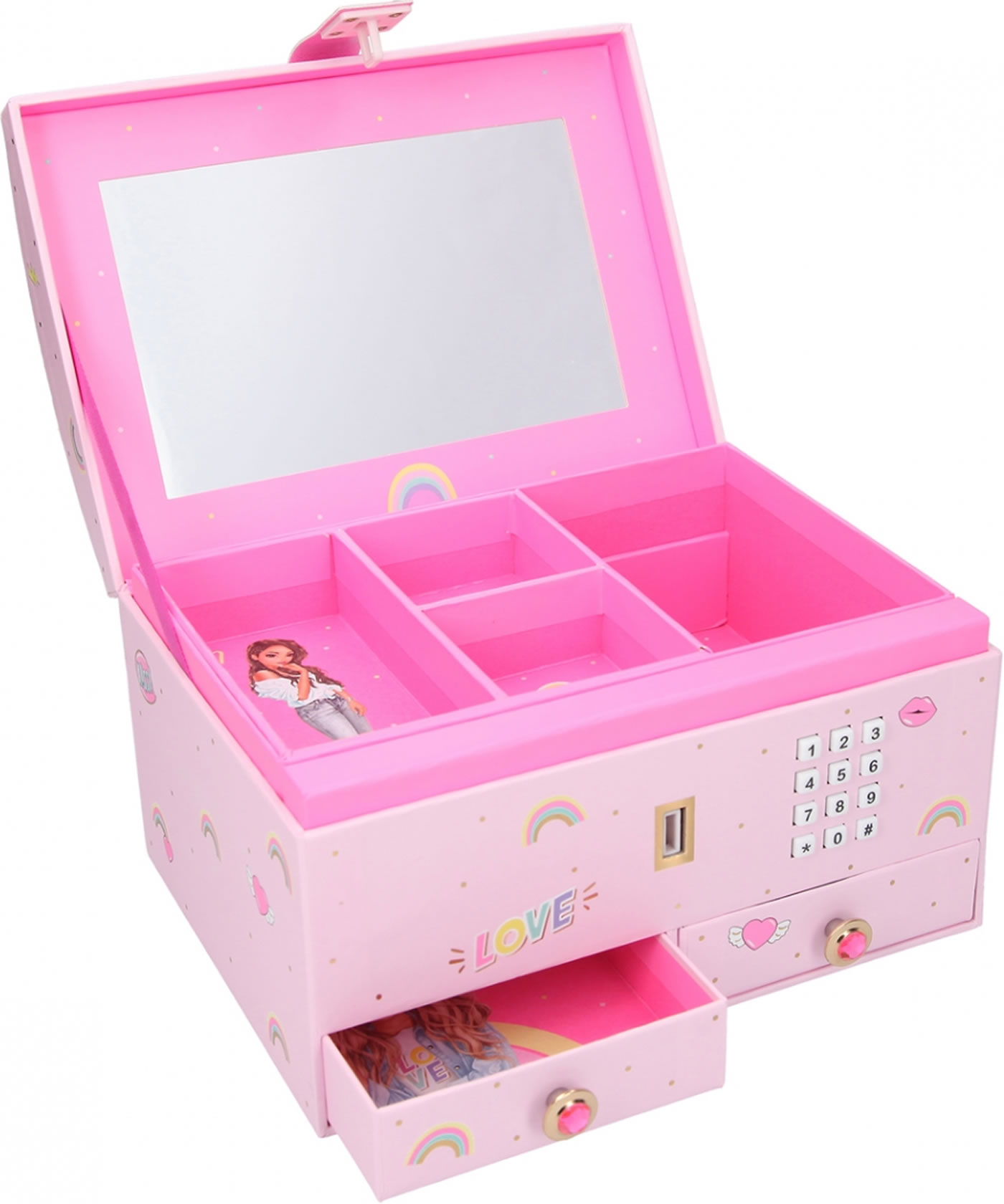 Das hübsche TopModel Schmuckkästchen eignet sich perfekt als Aufbewahrungsmöglichkeit für deinen Schmuck. Es besitzt ein großes Hauptfach und ein kleines herausnehmbares Fach mit 3 Unterteilungen. Außerdem gibt es einen Spiegel im Deckel.