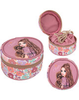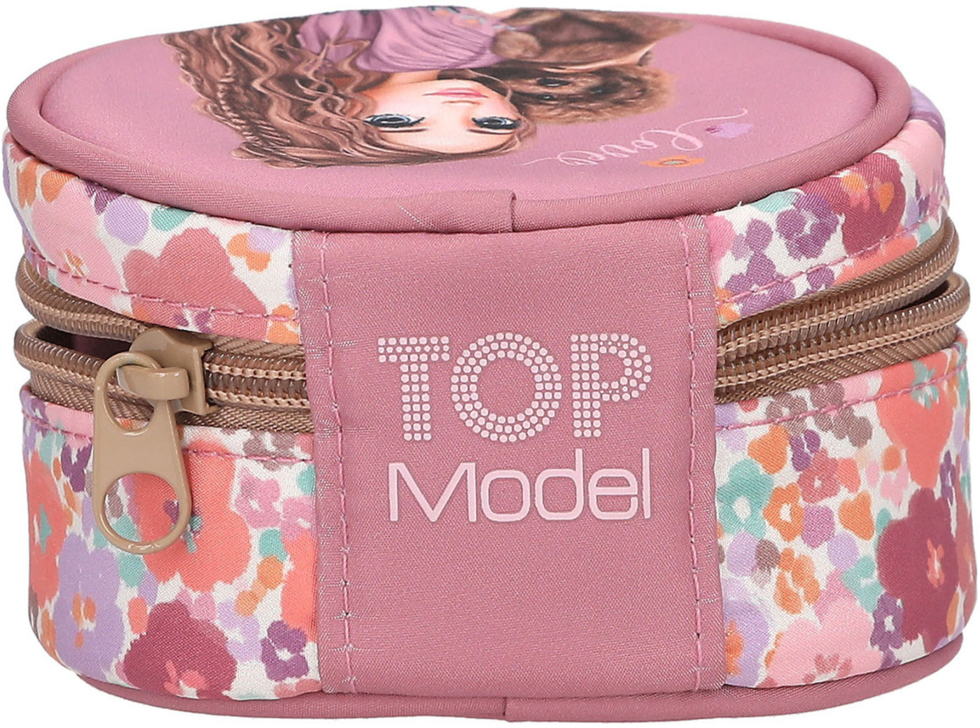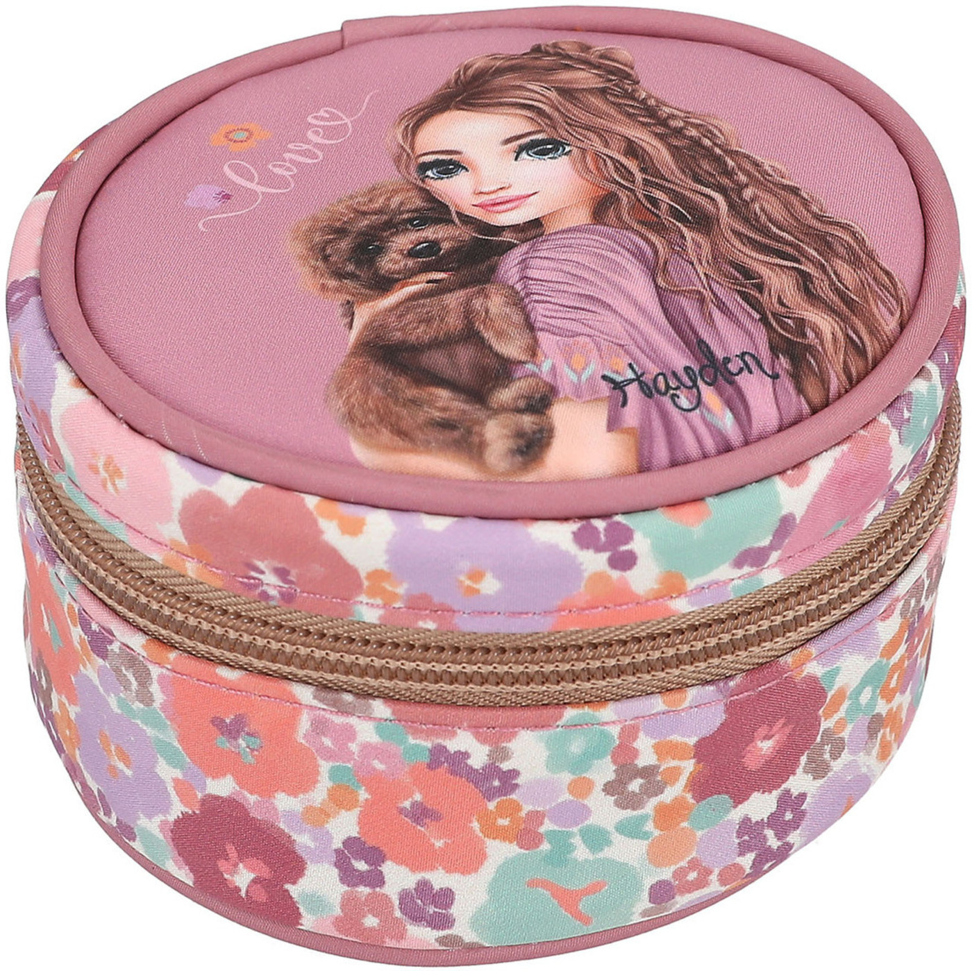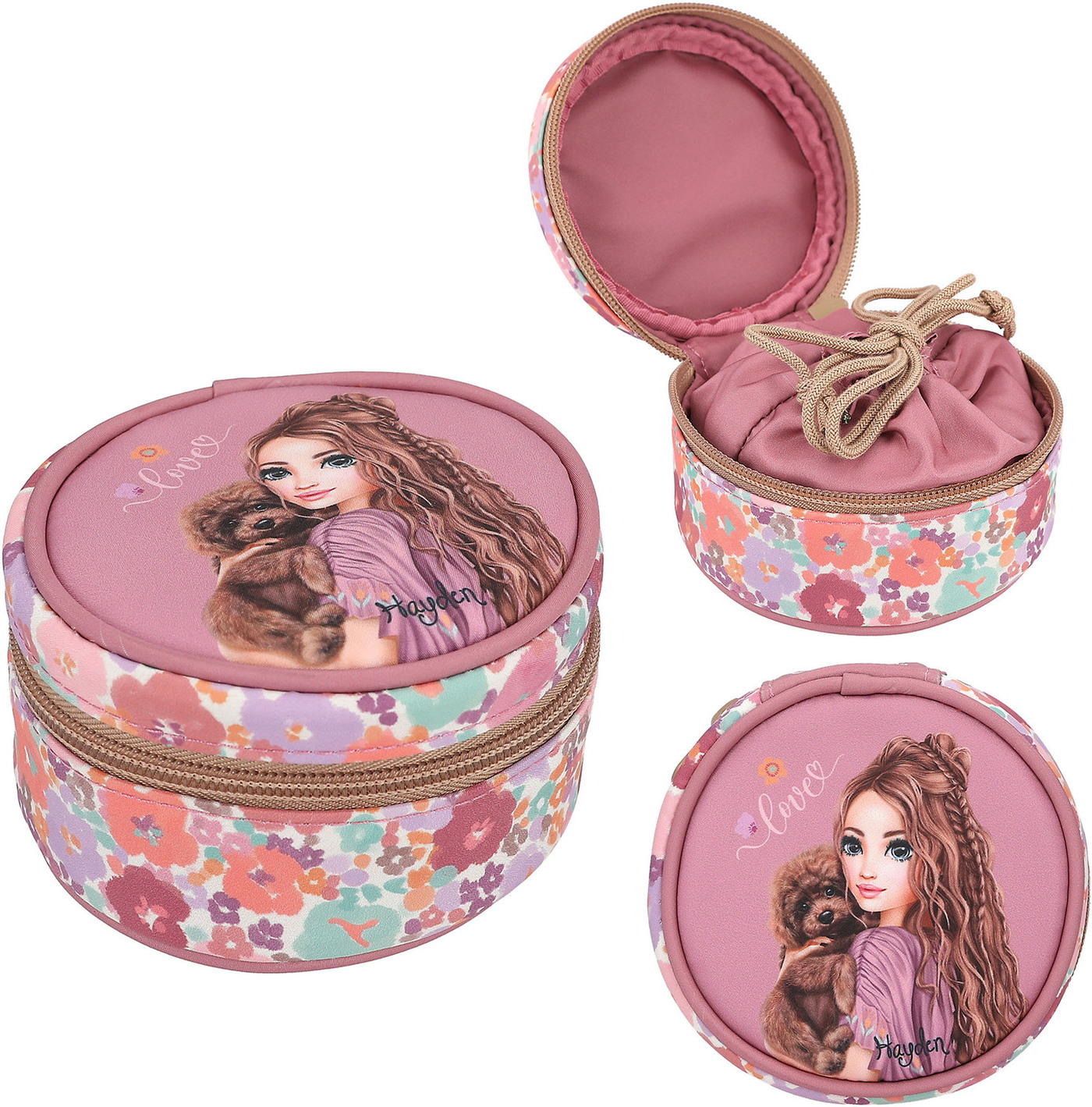 Fantastisch Floral: Das runde Schmuckkästchen aus der neuen TOPModel-Designserie hat auf der beerenfarbenen Front ein stylishes Model-Motiv mit einem supersüßen Hund. Der untere Teil ist aus farblich passendem, samtigen Stoff mit angesagter Rauten-Steppung. Außen mit Reißverschluss und innen mit Zugband zu schließen.