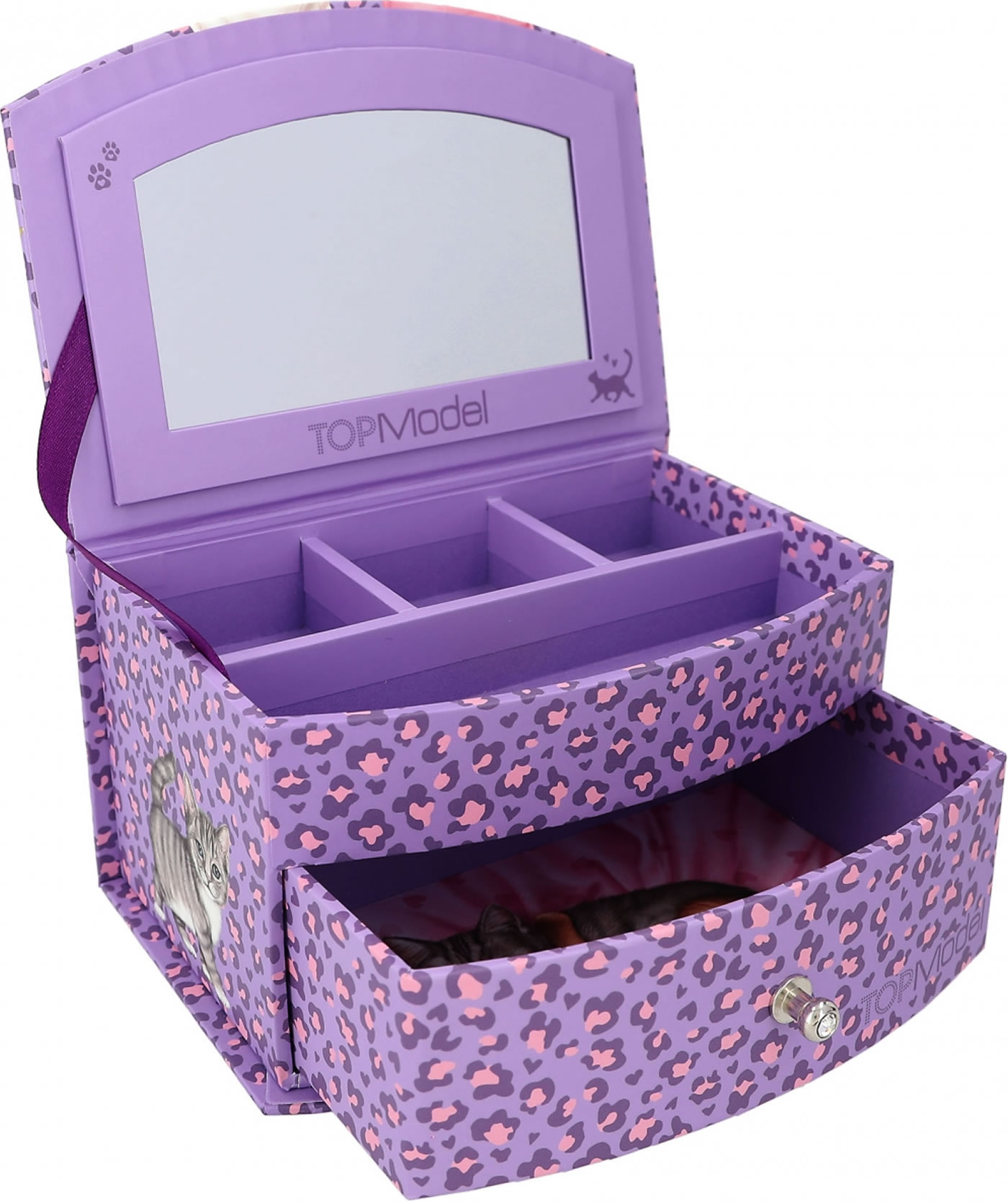Hier sind alle deine Ketten, Armbänder, Ohrringe und andere Schätze gut aufbewahrt. Das Schmuckkästchen hat eine Schublade und im Deckel befindet sich ein Spiegel.