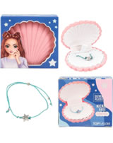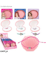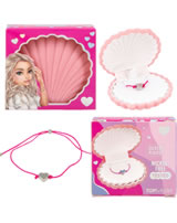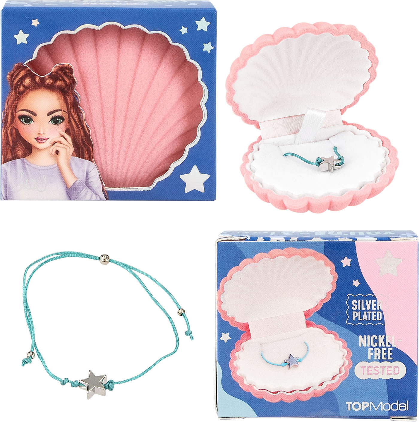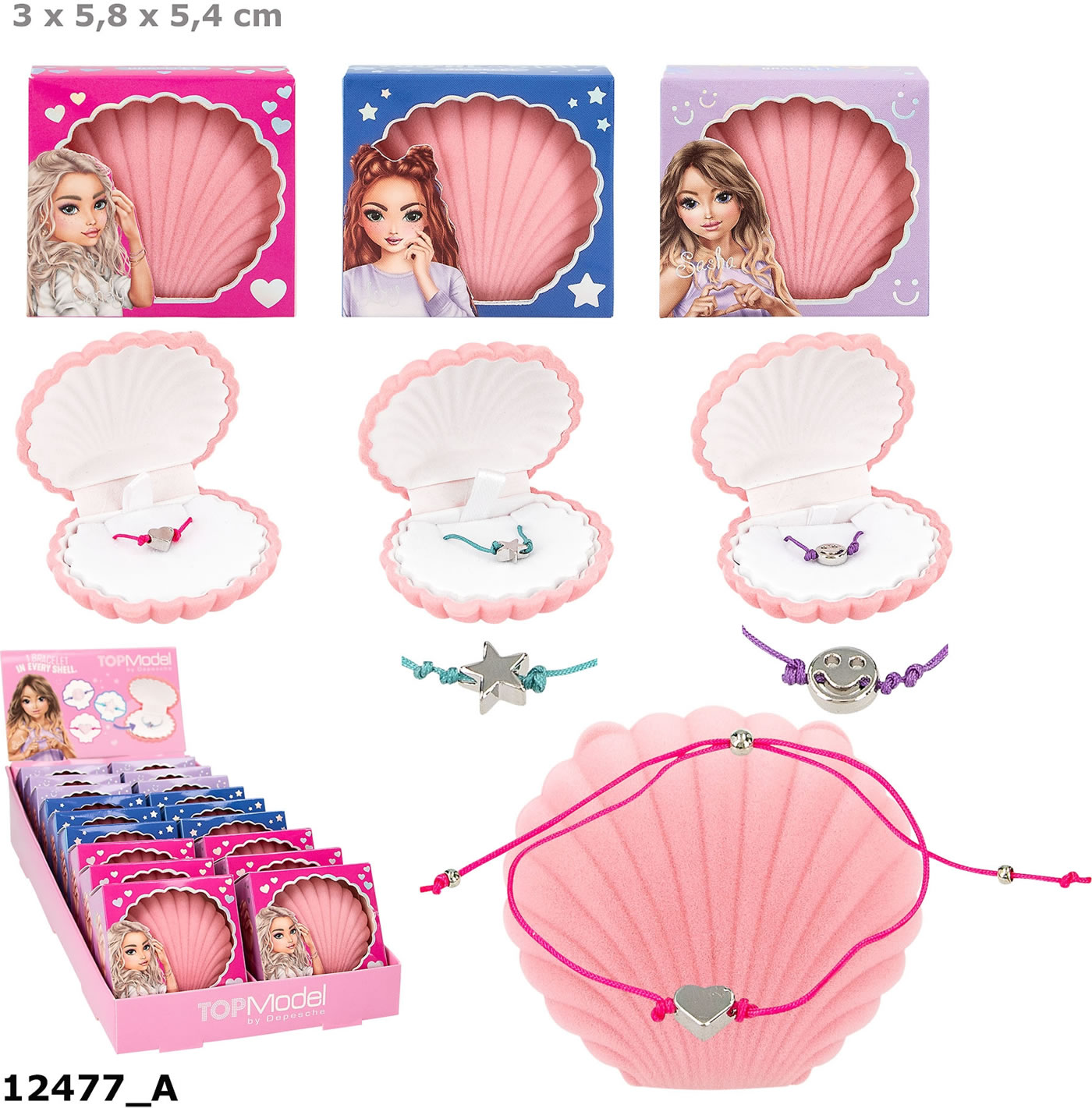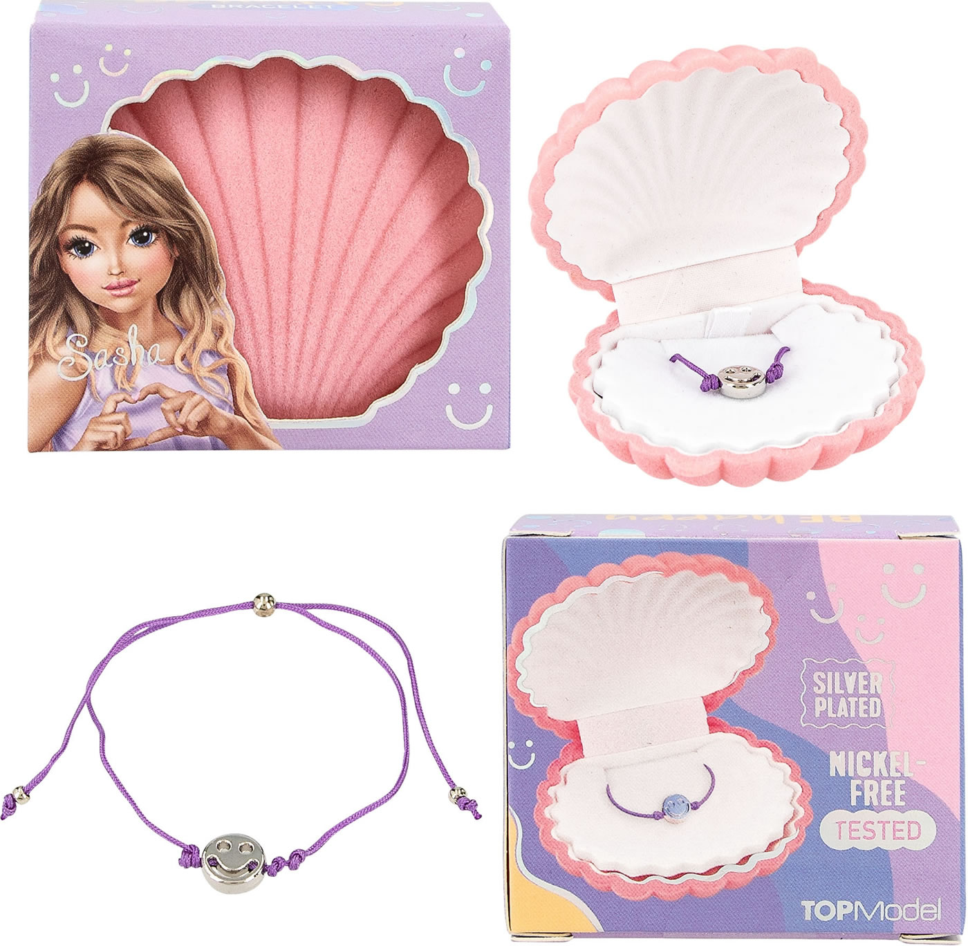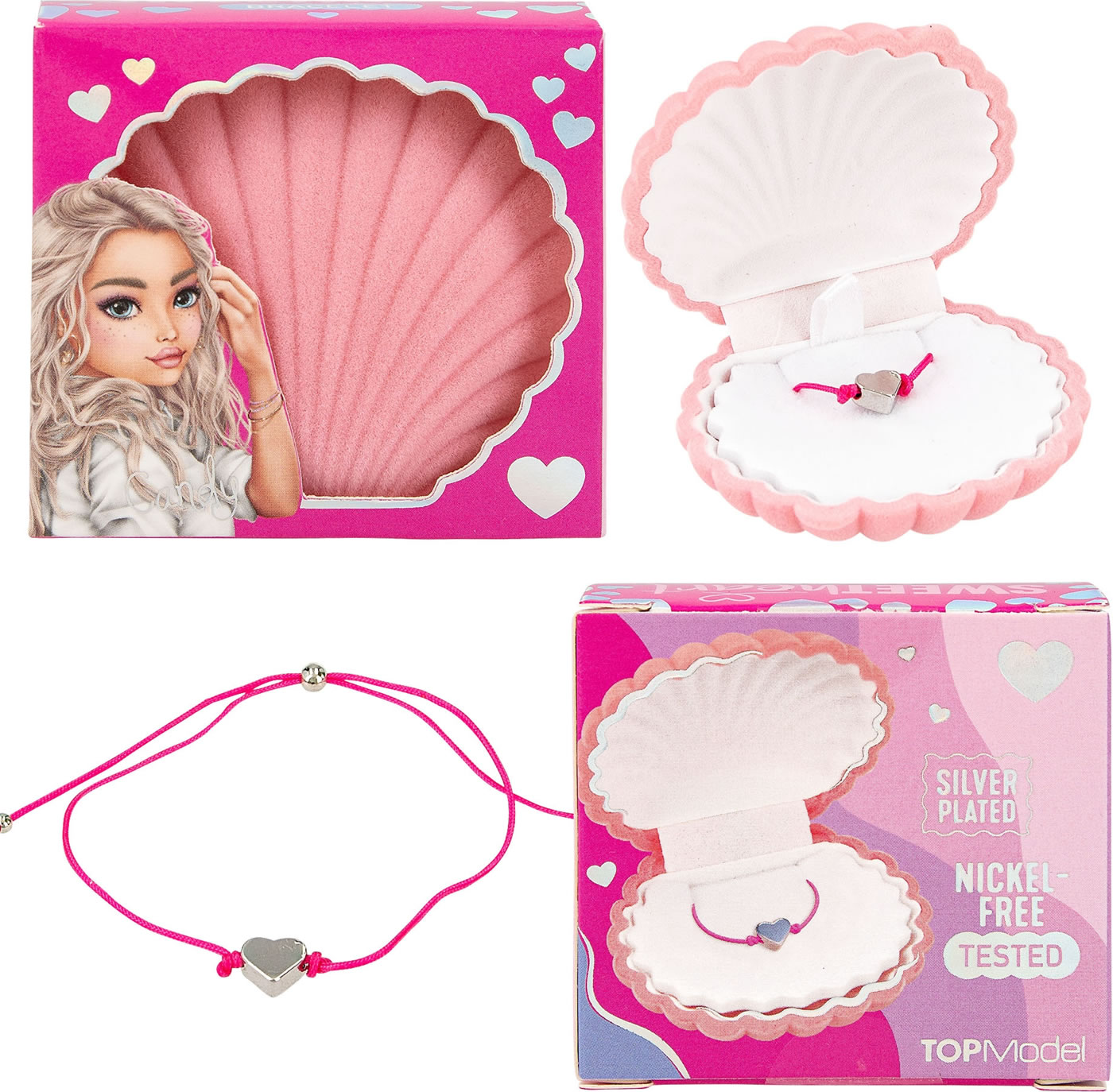 Ein echter Schatz: In jeder samtig bezogenen rosa Muschel liegt ein wunderschönes TOPModel-Armband mit farbigem Textilband und silbernem Schmuck-Symbol.