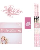 1 Radiergummi mit Pferde-Print, 100 liebevoll illustrierte Notizzettel und 25 rosa Büroklammern.