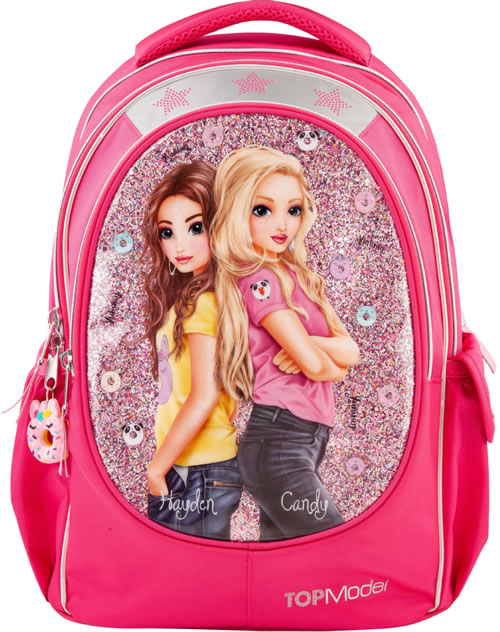 Ein Hingucker ist die glitzernde Vorderseite mit den beiden TOPModel Hayden und Candy und ein besonderes Detail ist der Donut am Reißverschluss.