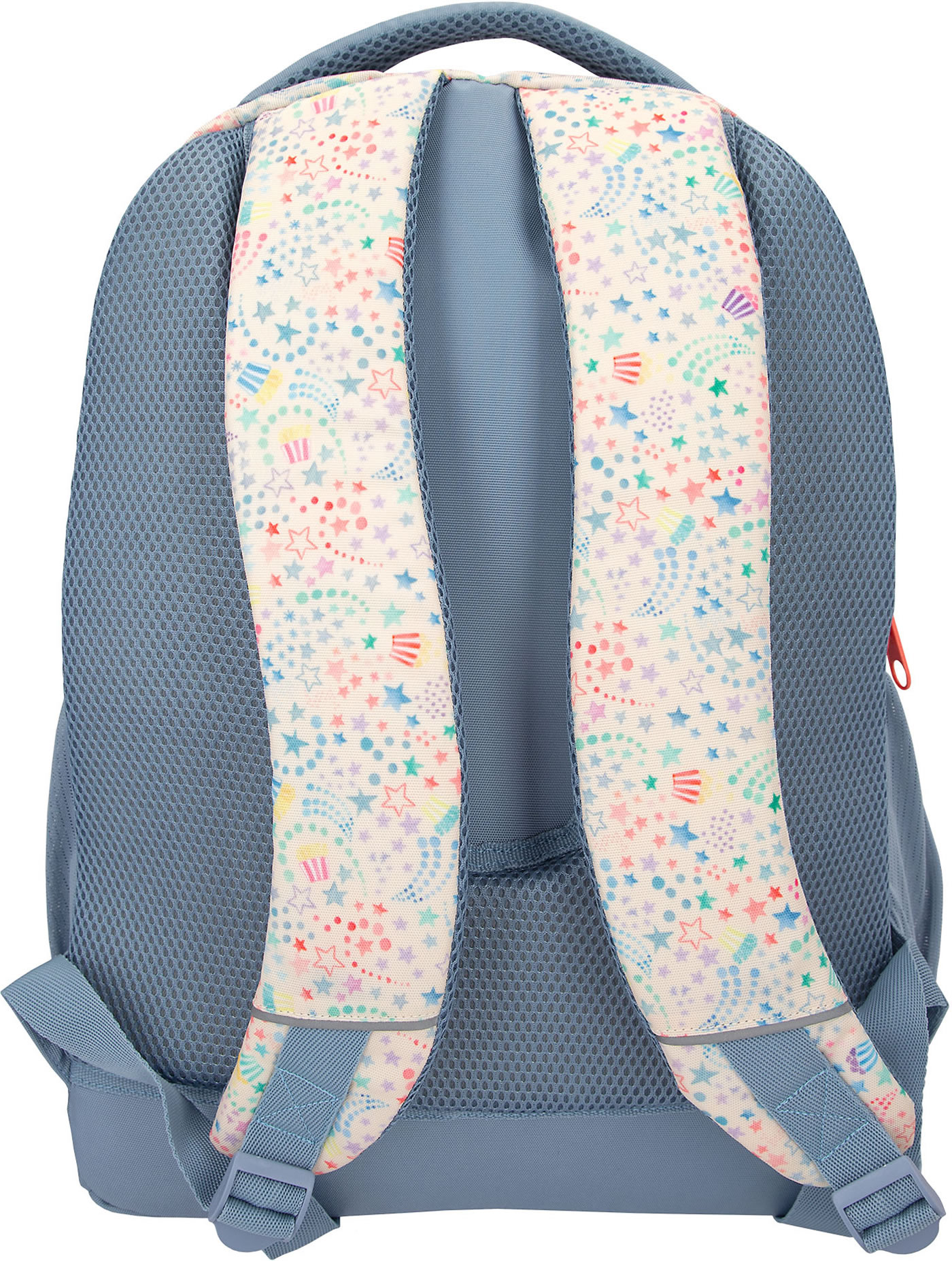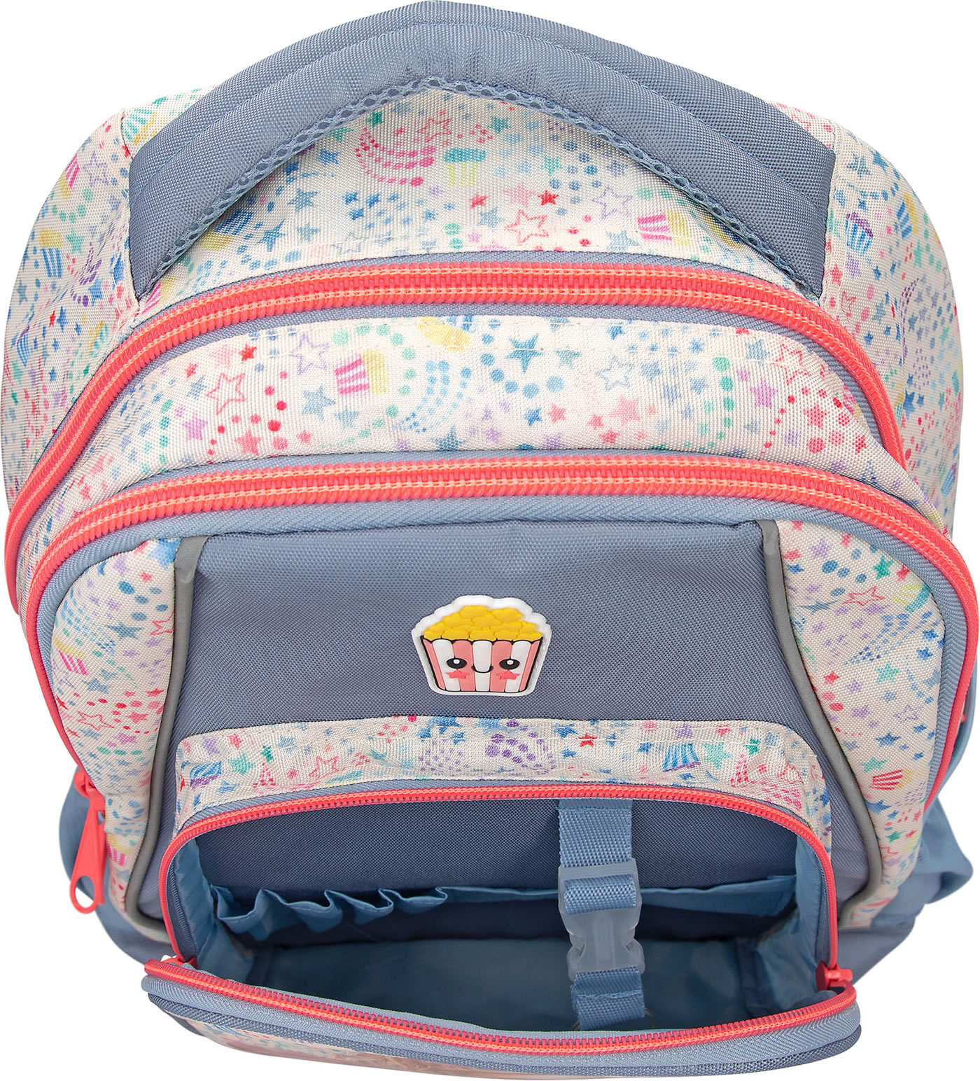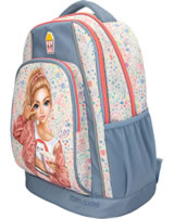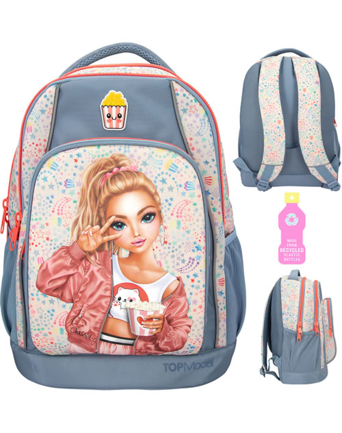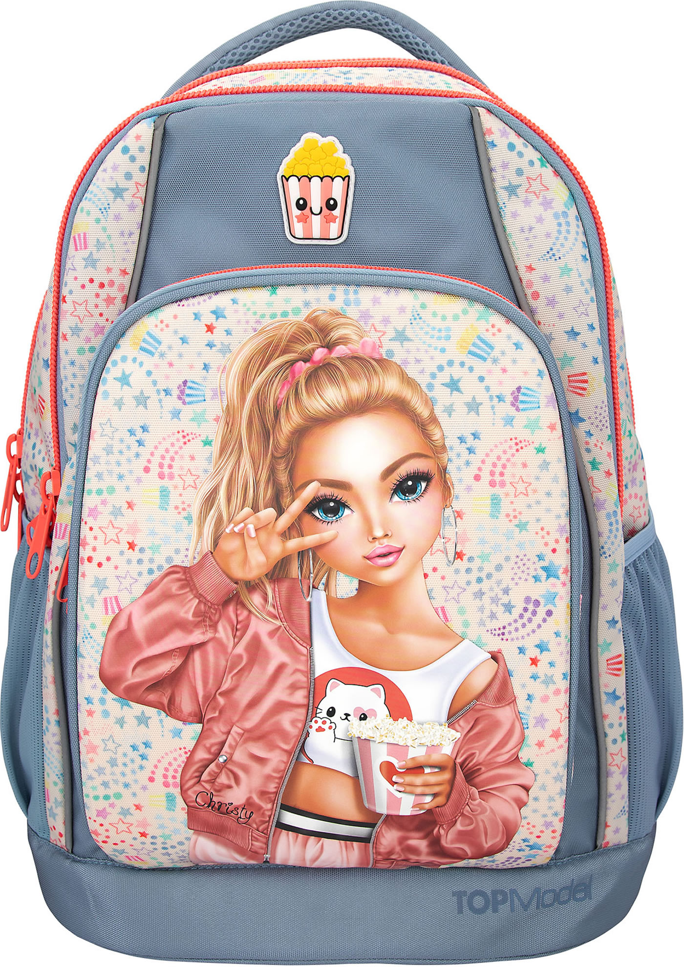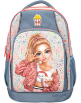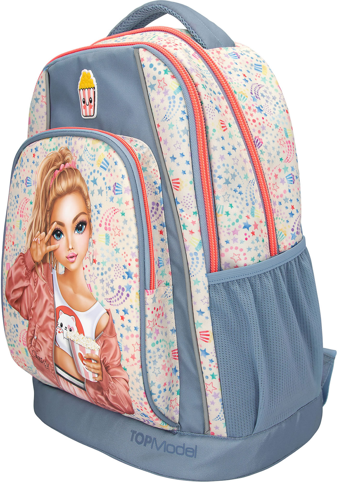 Gute-Laune-Rucksack: mit fröhlich-buntem Allover-Muster, XL-TOPModel-Print auf der Fronttasche, immer stylishem Jeans-Blau, superniedlichem Popcorn-Patch und in der Länge verstellbaren naturfarbenen Gurten.