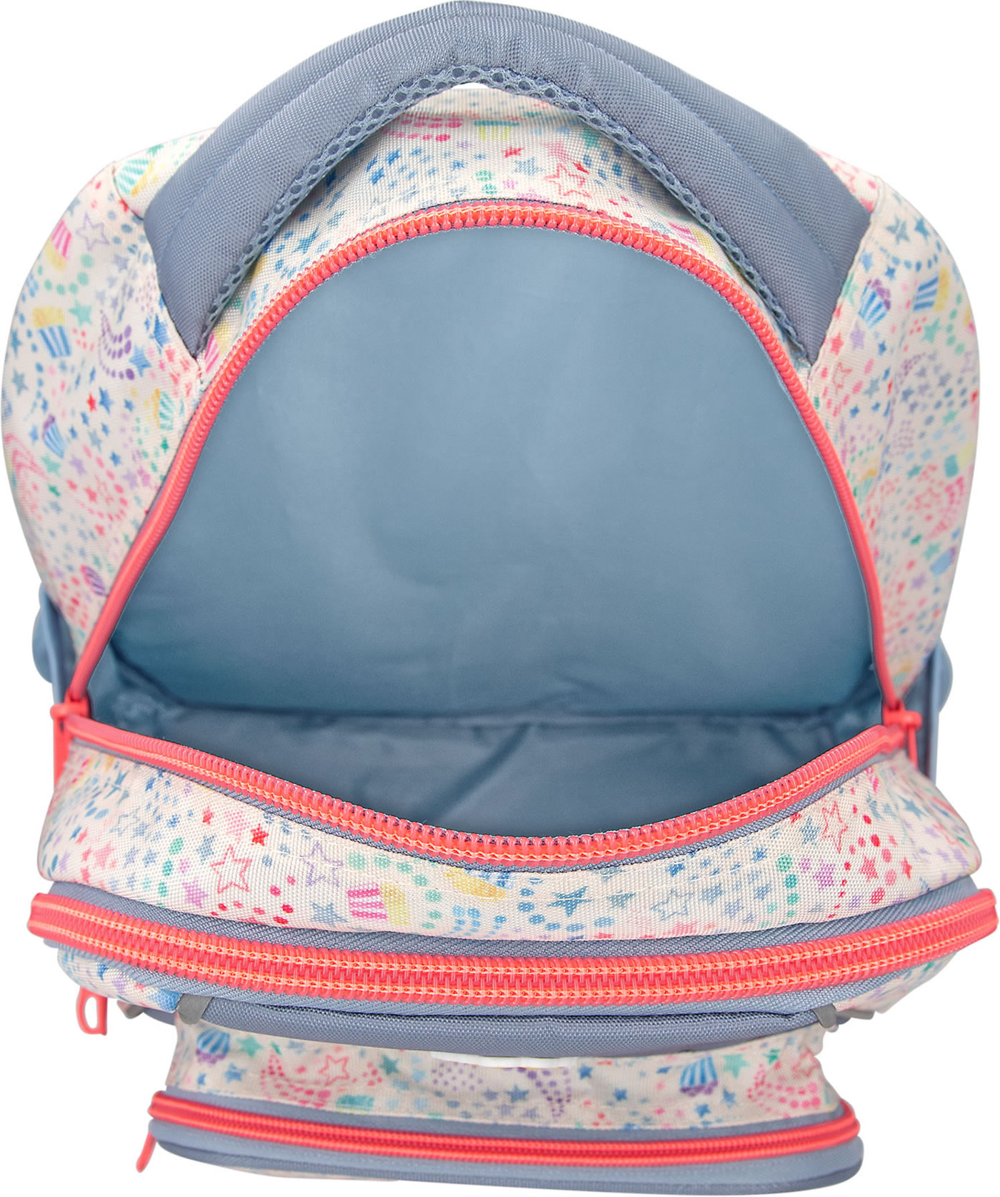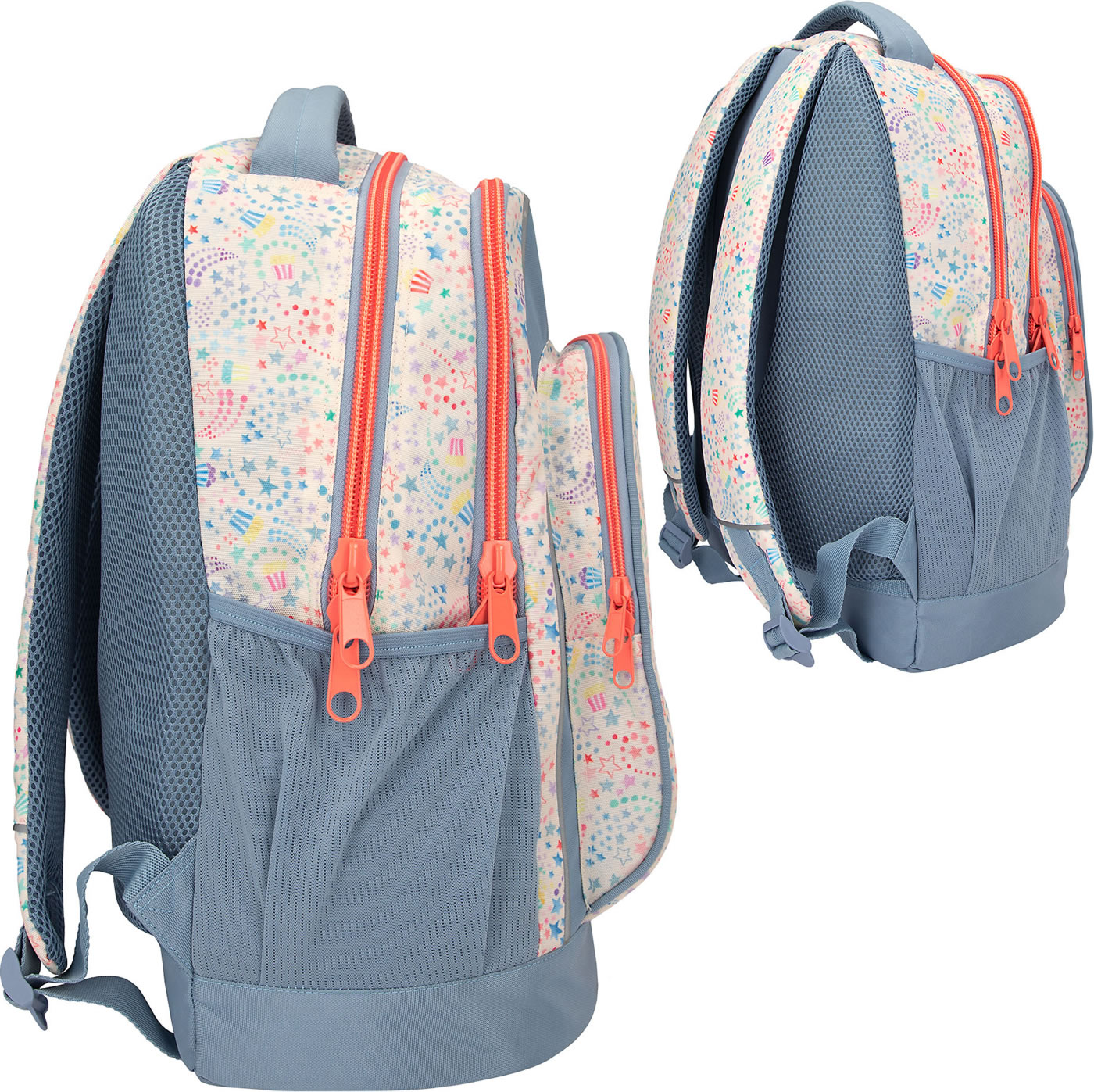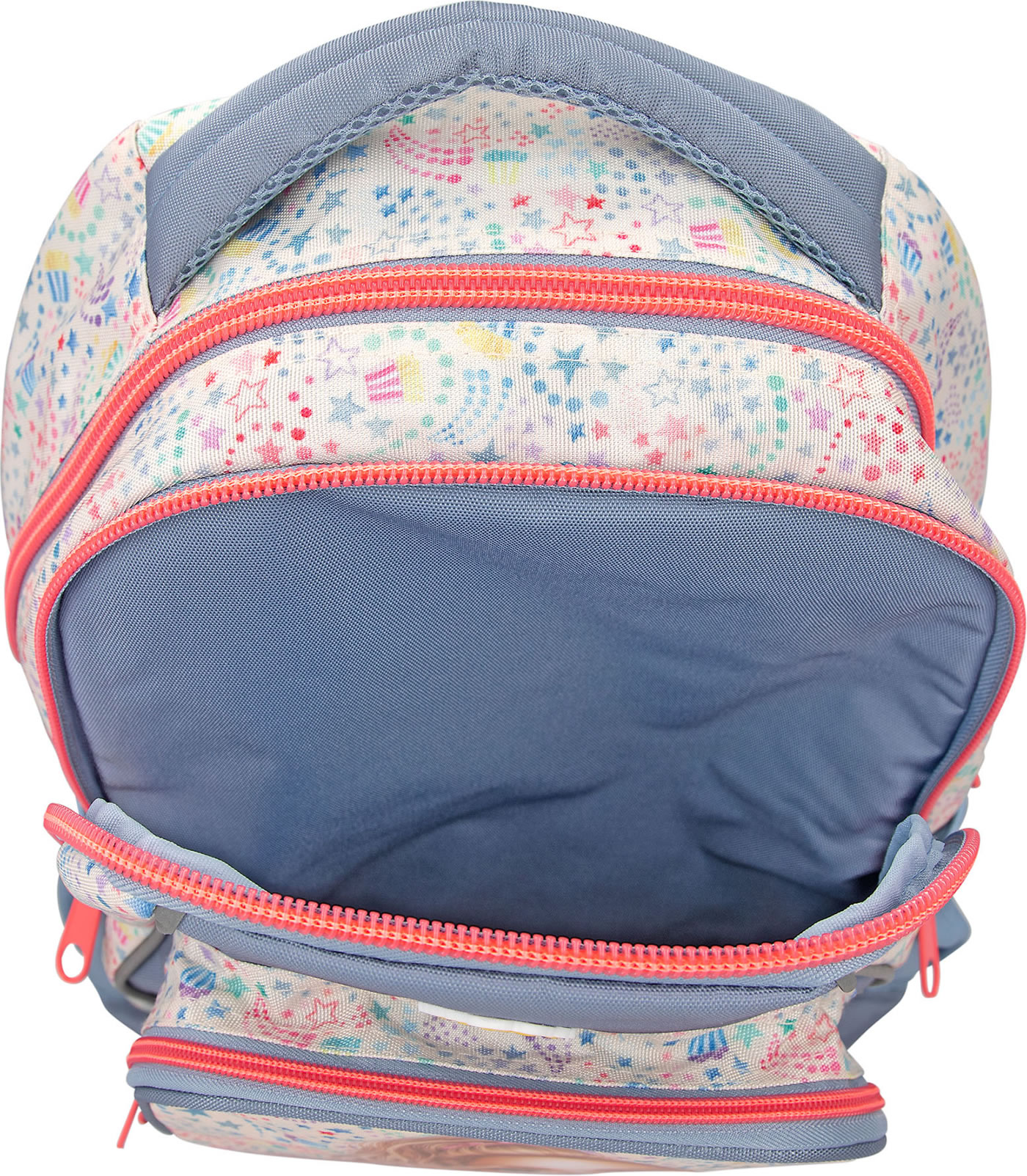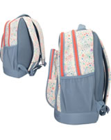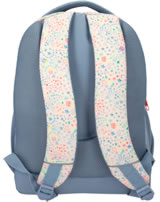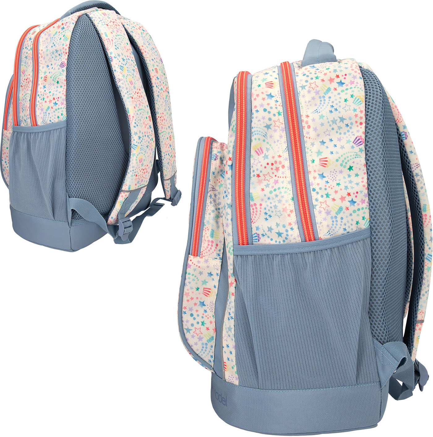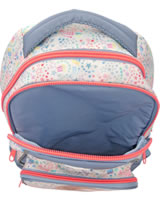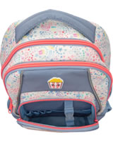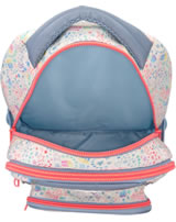 Gute-Laune-Rucksack: mit fröhlich-buntem Allover-Muster, XL-TOPModel-Print auf der Fronttasche, immer stylishem Jeans-Blau, superniedlichem Popcorn-Patch und in der Länge verstellbaren naturfarbenen Gurten.