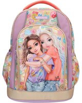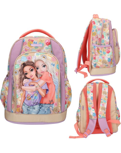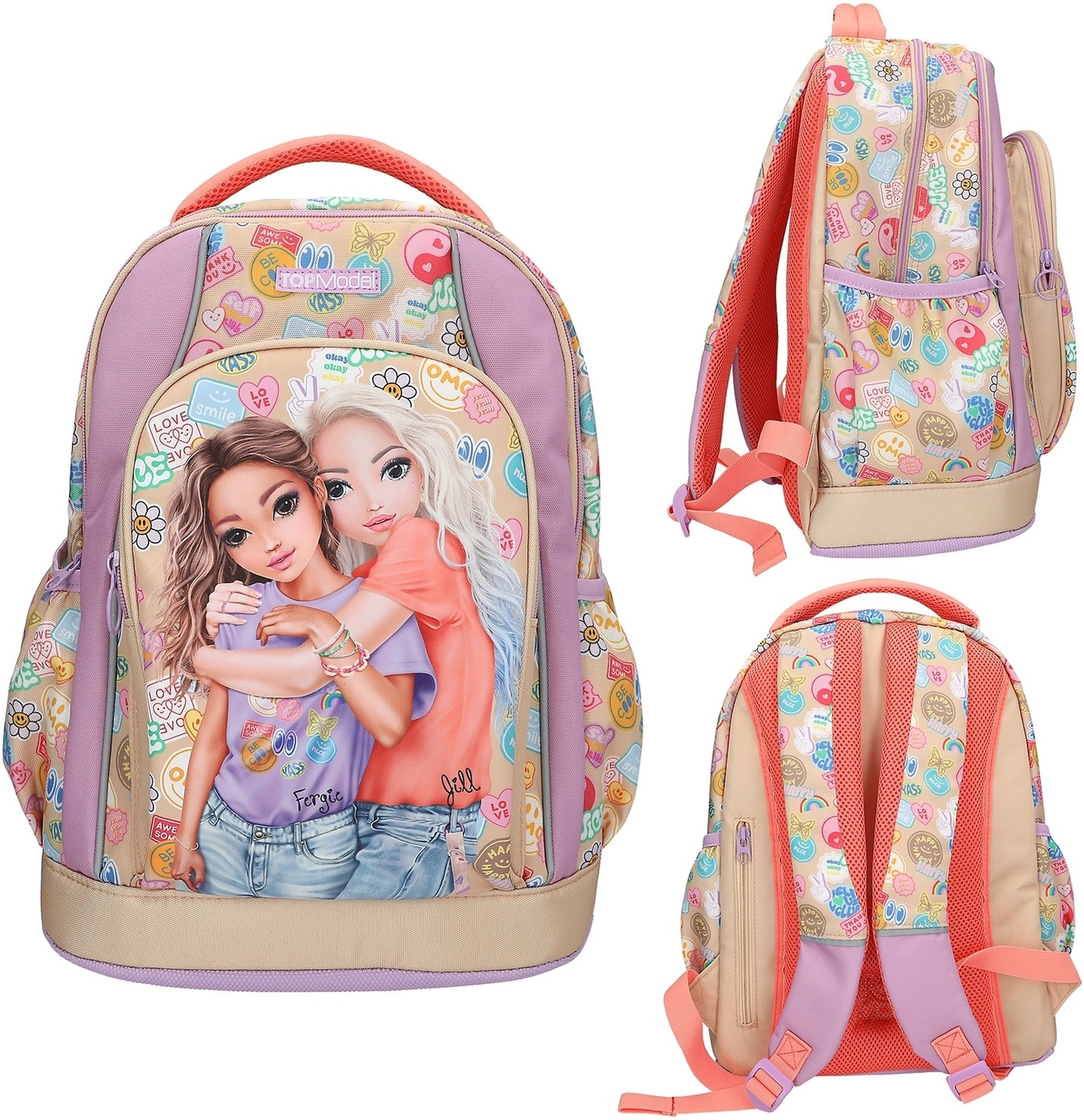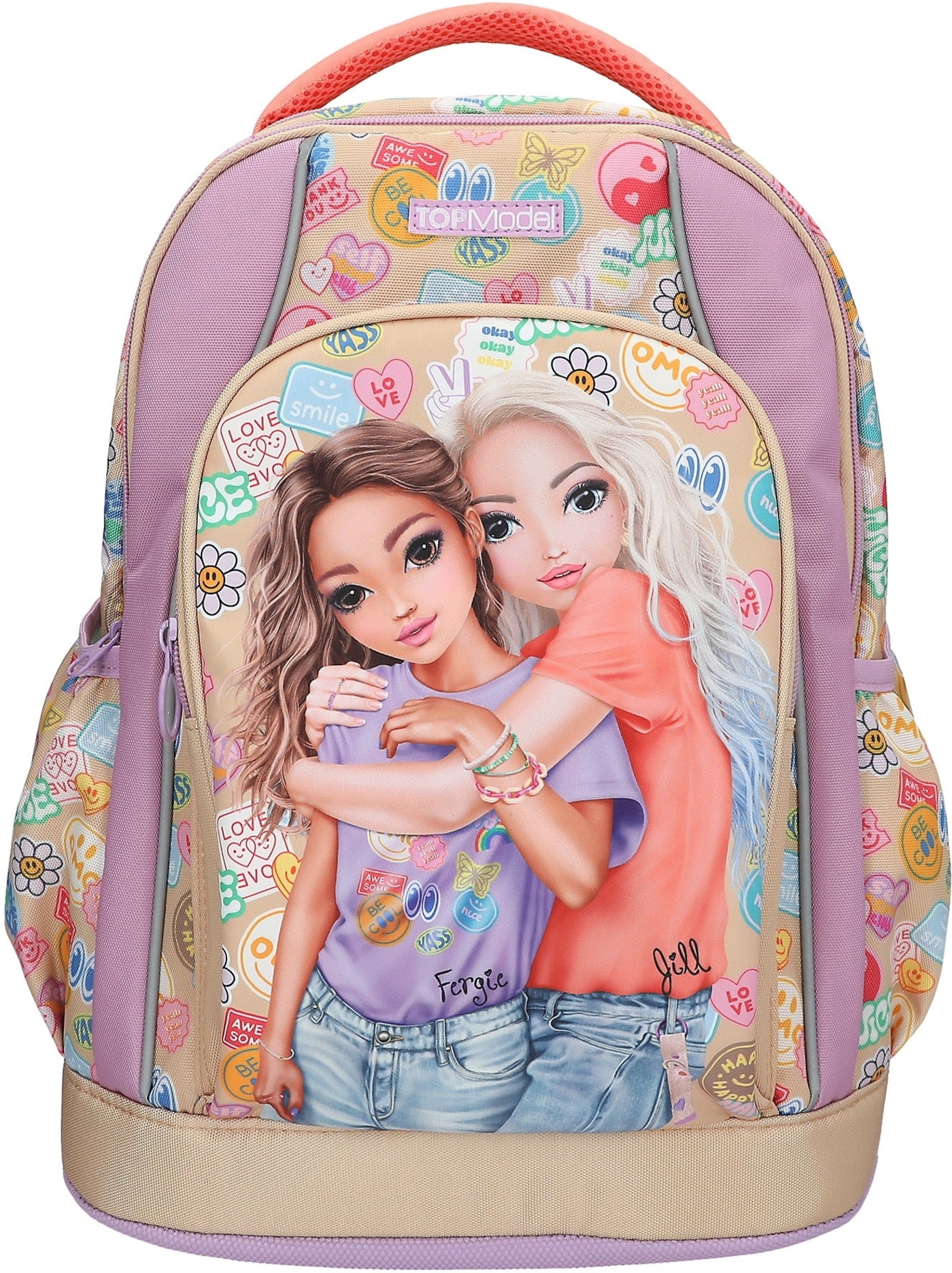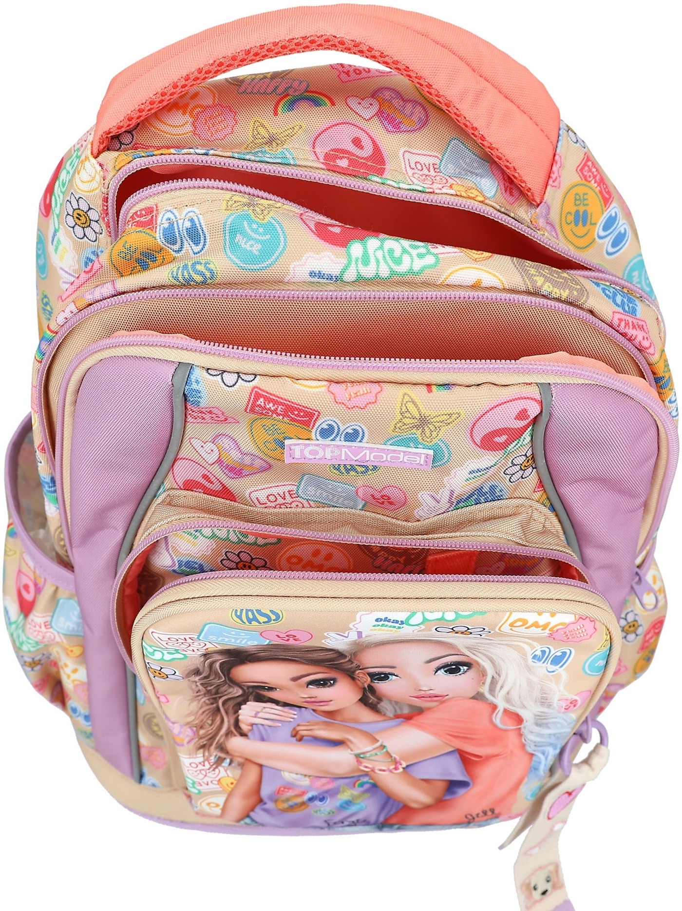 Batch-Boom! Der TOPModel-Schulrucksack in tollem Beige, Flieder und Koralle hat ein tolles Doppel-Modelmotiv und coole bunte Batch-Prints auf der Front,