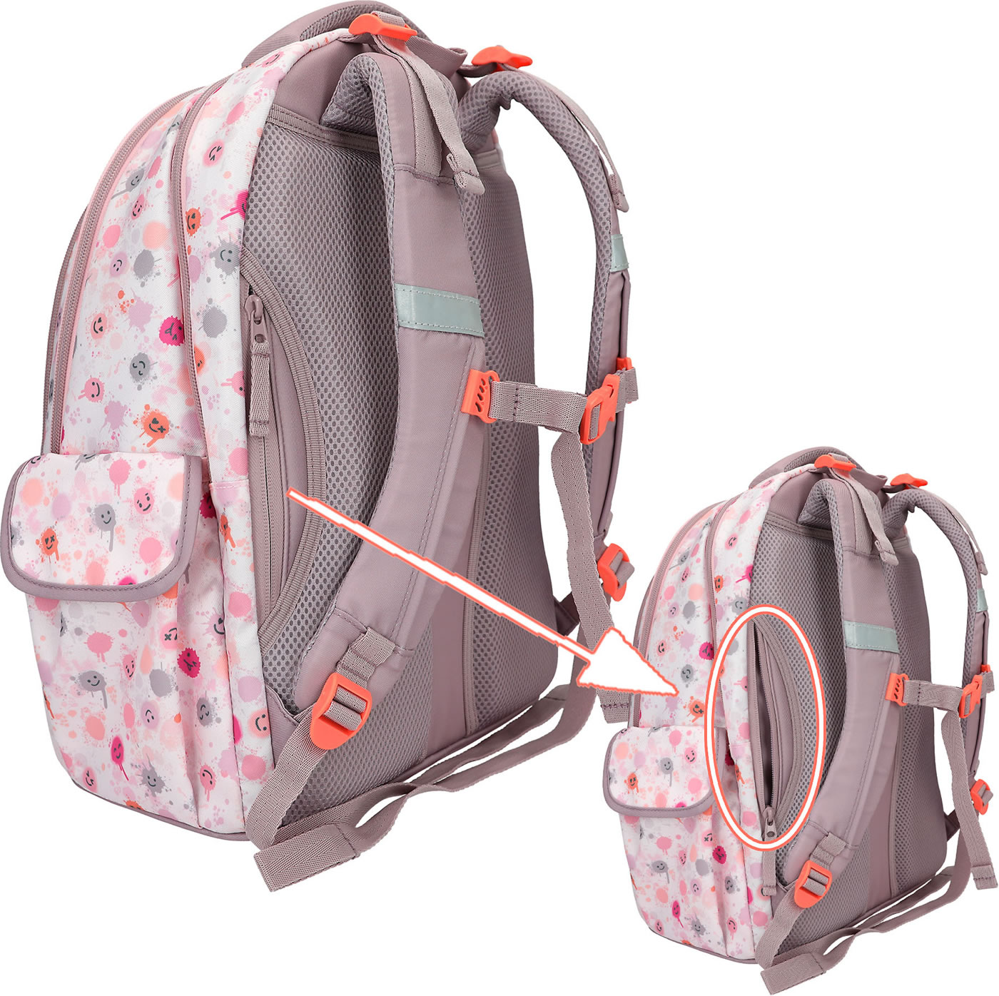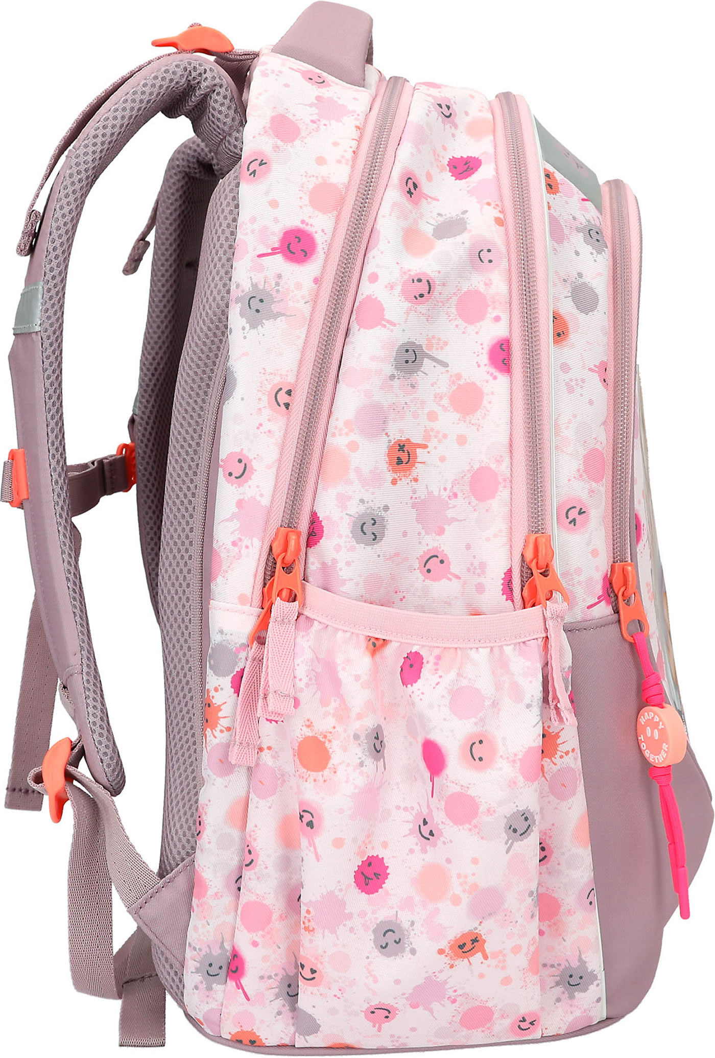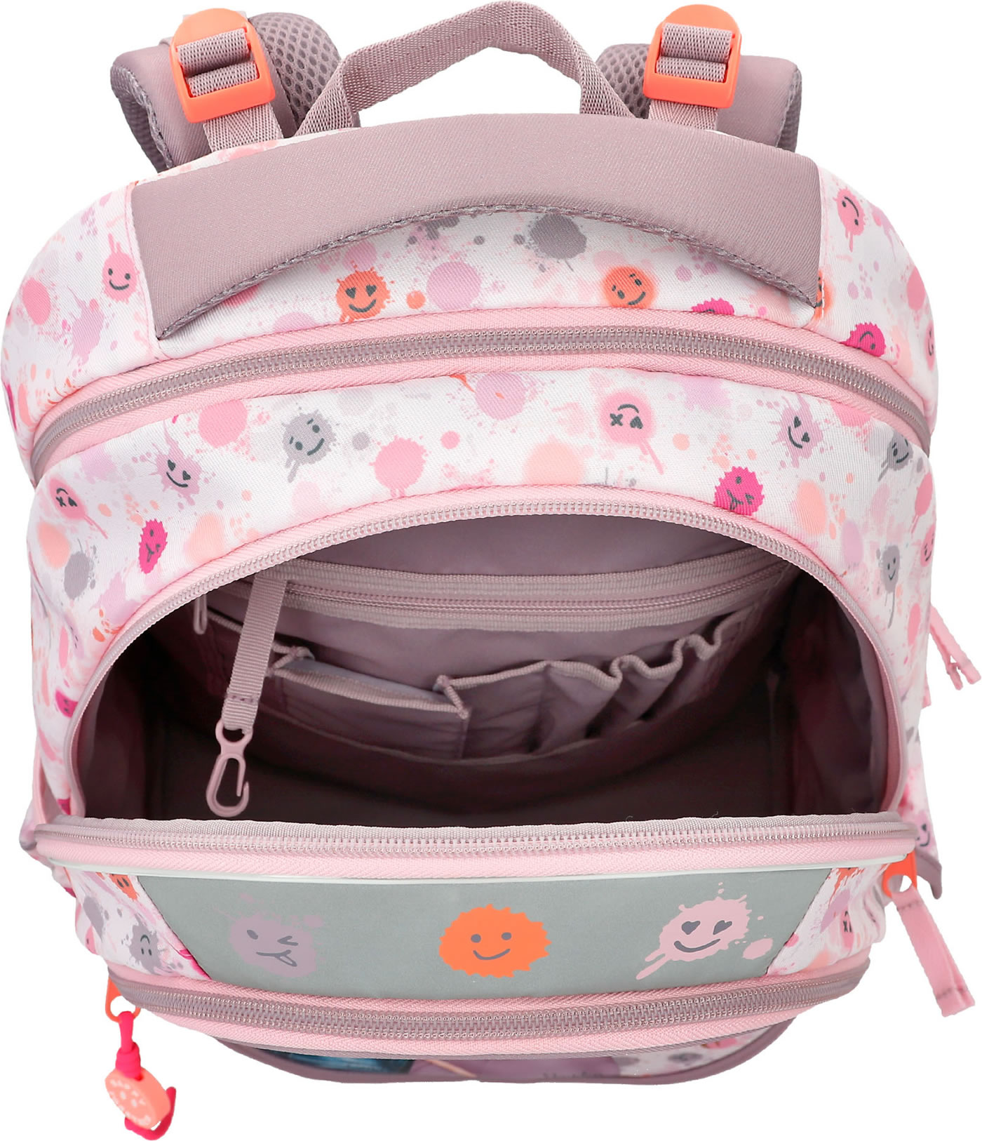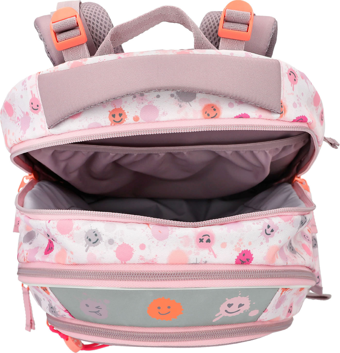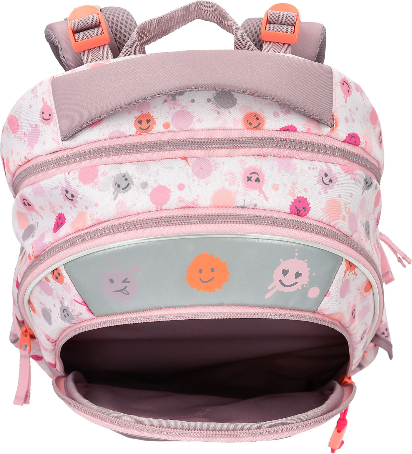 Der Schulrucksack, der gute Laune macht: zarte Farben, fröhliche Klecks-Smileys, ein cooles TOPModel-Motiv und ein niedlicher Smiley-Anhänger am vorderen Reißverschluss. Und auch funktional überzeugt der Rucksack: Mit einem Volumen von ca. 19,6 l wiegt er nur ca. 990 g und verfügt über ein großes Hauptfach, ein Mittelfach, eine Fronttasche für die Frühstücksdose und Seitentaschen für die Trinkflasche. Mit stufenlos verstellbaren Trägern, einem gut belüfteten Rückenteil (Meshpolsterung), einer geheimen Reißverschlusstasche am Rücken, einem gepolsterten Tragegriff, einer Schlaufe zum Aufhängen und vielen Reflektoren für eine gute Sichtbarkeit im Dunkeln. Der Boden des Rucksacks ist beschichtet und hält Wasser und Schmutz ab.