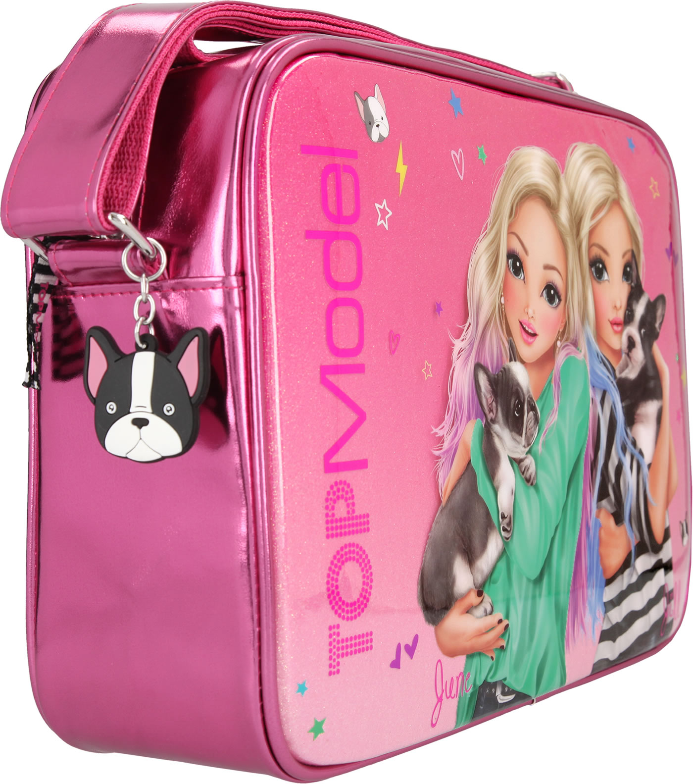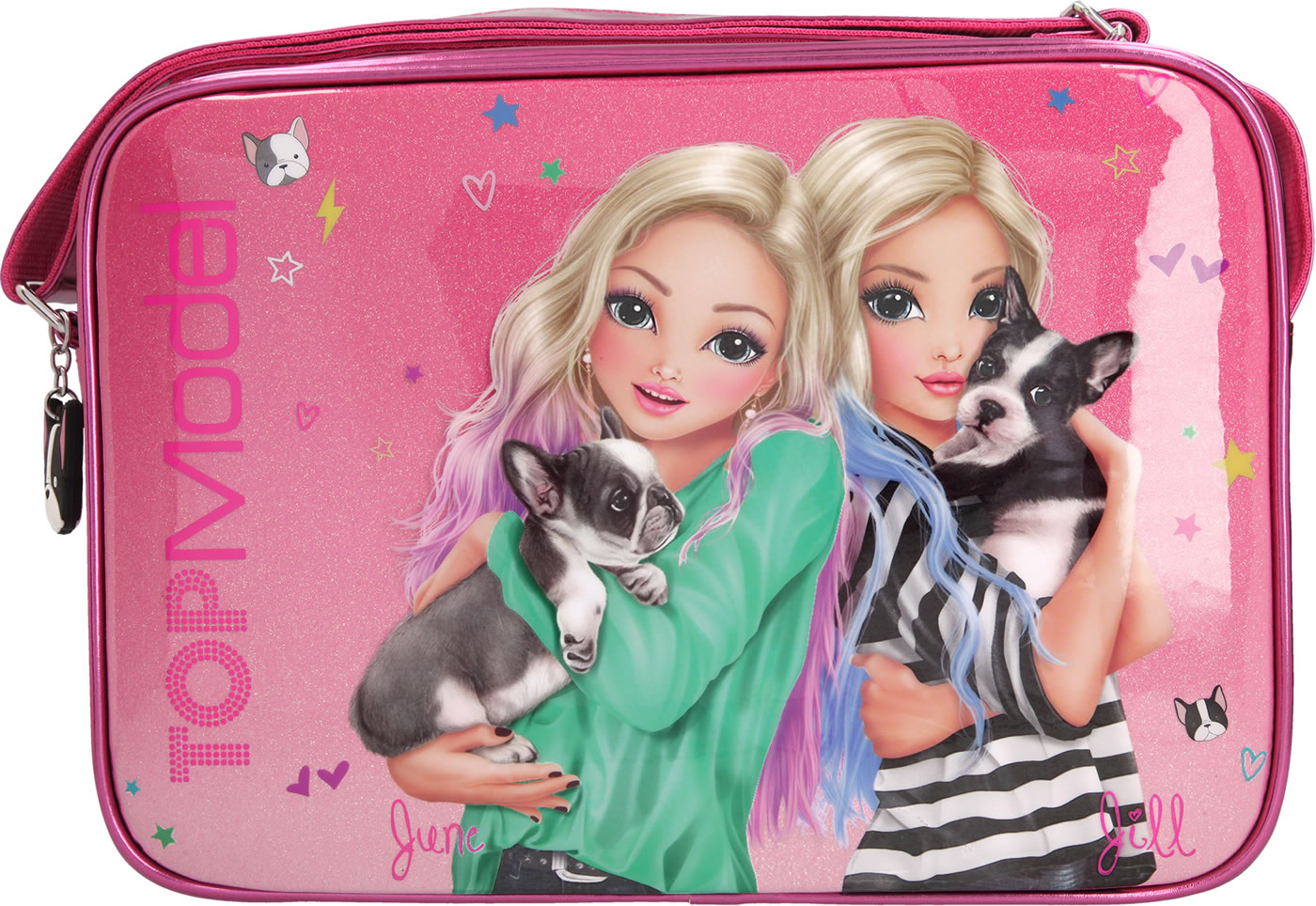 Diese Tasche bietet viel Platz für deine Accessoires. Die Vorderseite mit Glitzer, vielen kleinen bunten Symbolen und den TOPModel June und Jill ist ein echter Hingucker.