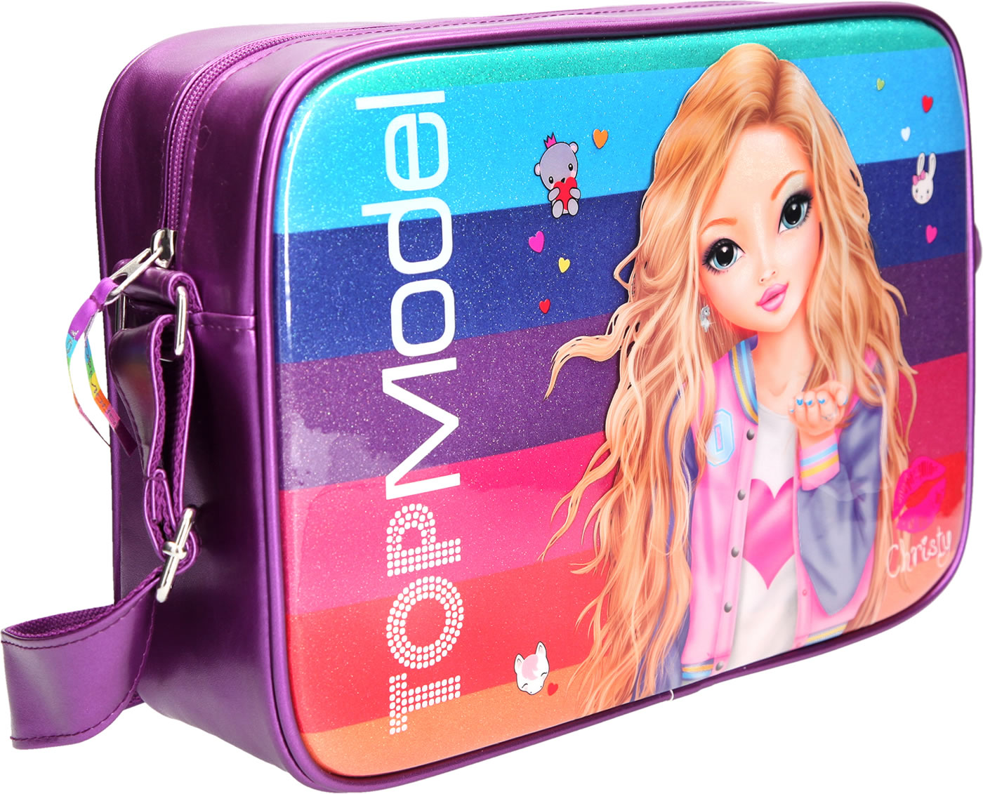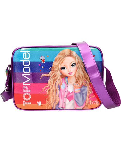Diese Tasche bietet viel Platz für deine Accessoires. Die Vorderseite mit Glitzer, vielen kleinen Symbolen und dem TOPModel Christy ist ein echter Hingucker.