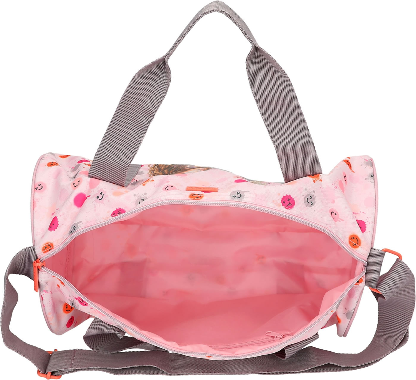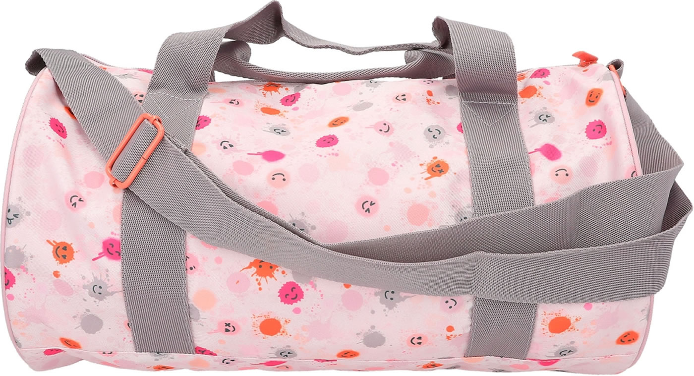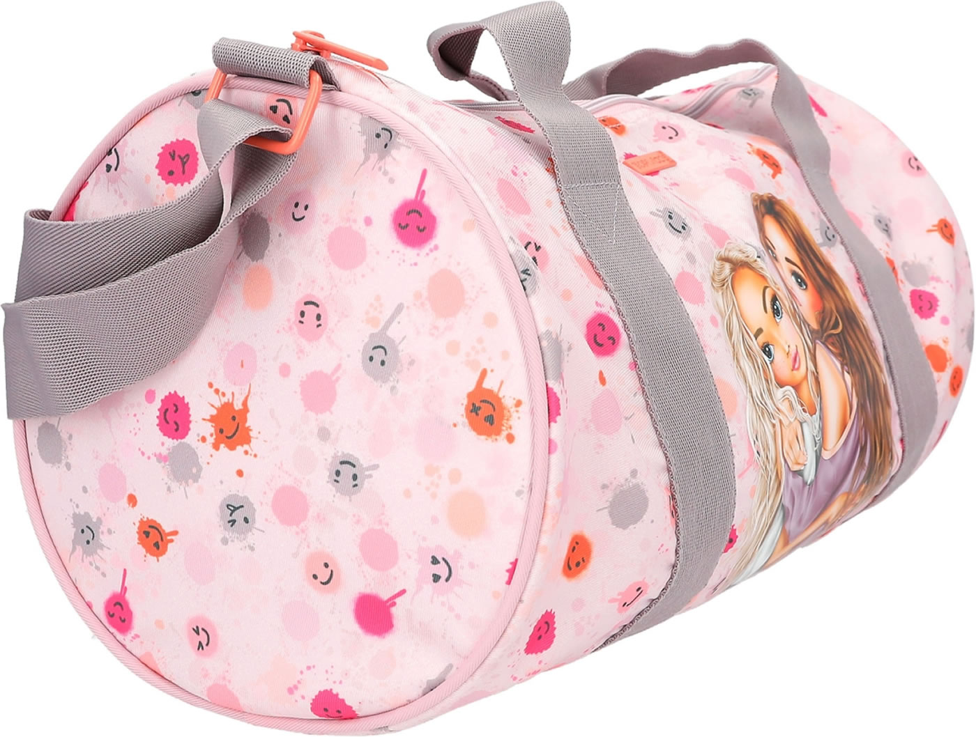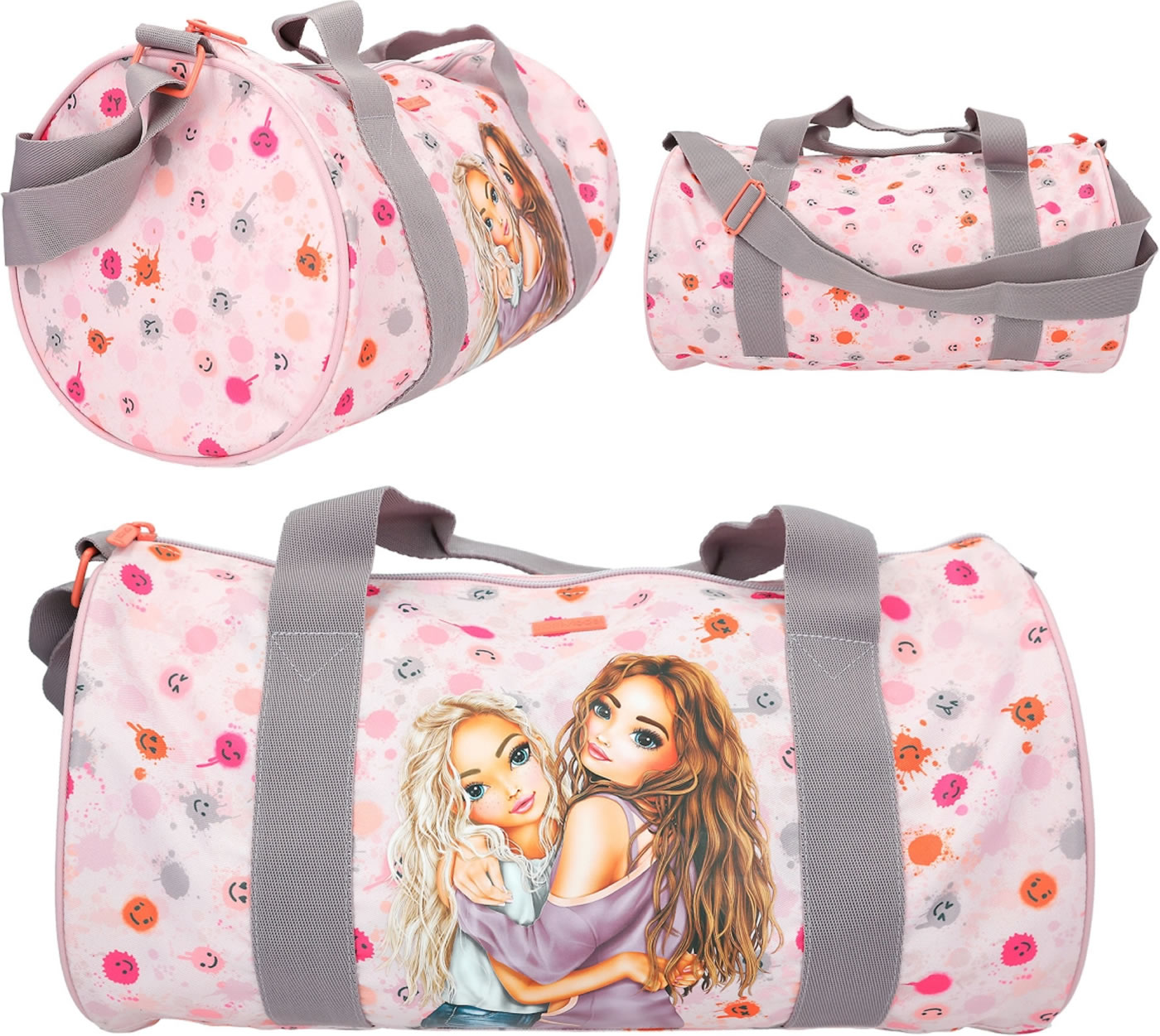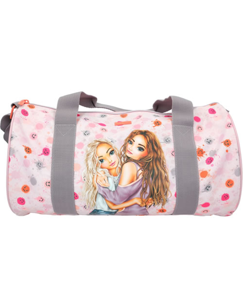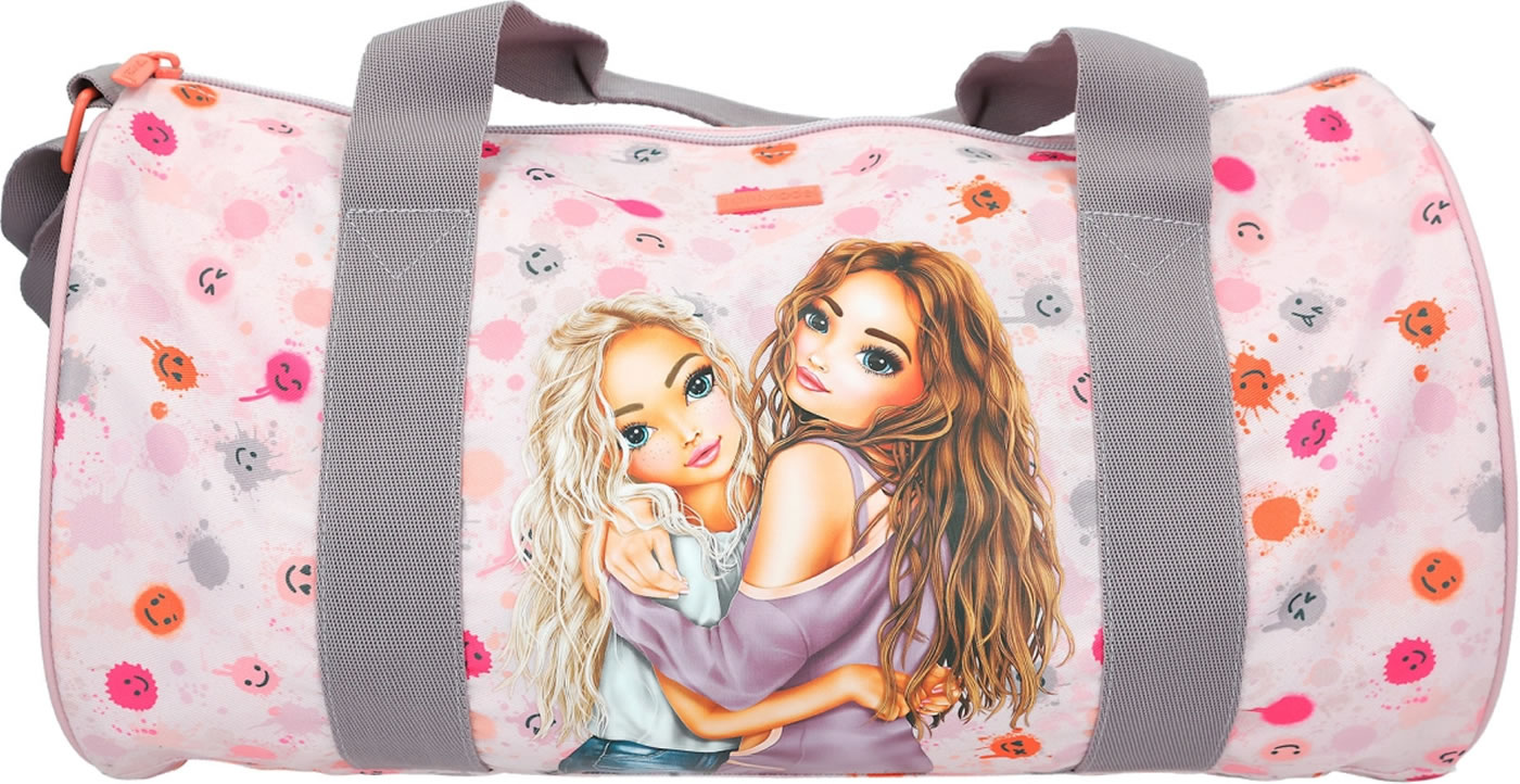 Die Sporttasche, die gute Laune macht: zartes Rosa, fröhlich bunte Klecks-Smileys und ein cooles TOPModel-Motiv. Mit farblich abgesetzten kurzen Tragegriffen und abnehmbarem Umhängegurt. Das geräumige Hauptfach hat eine extra Innentasche mit Reißverschluss.