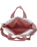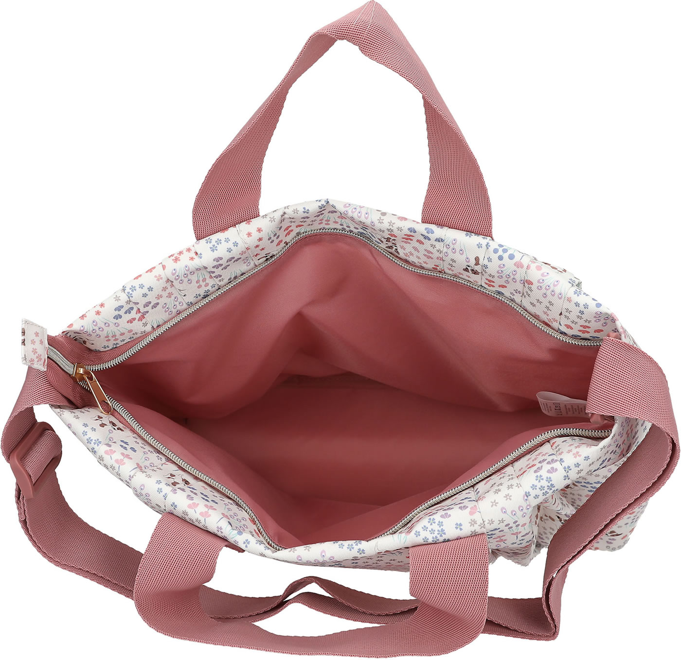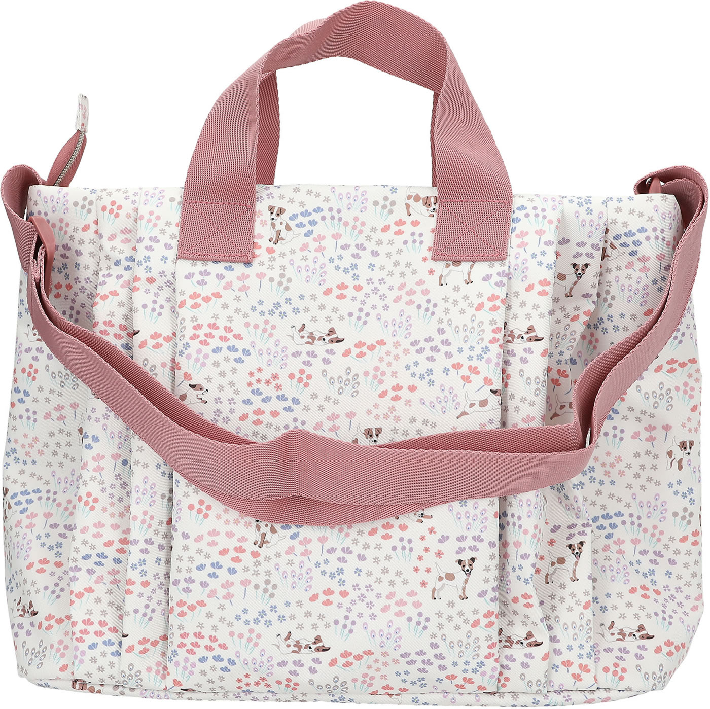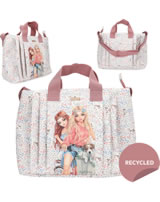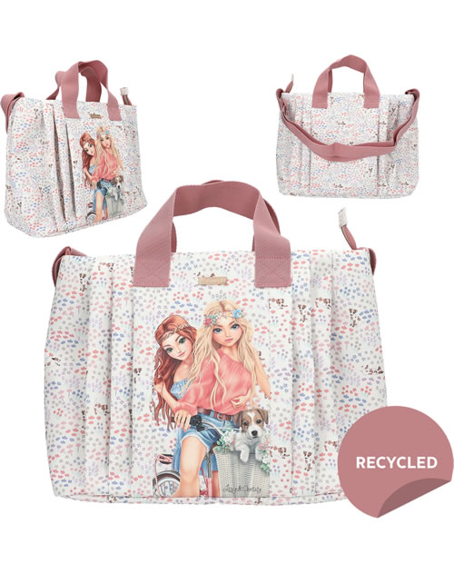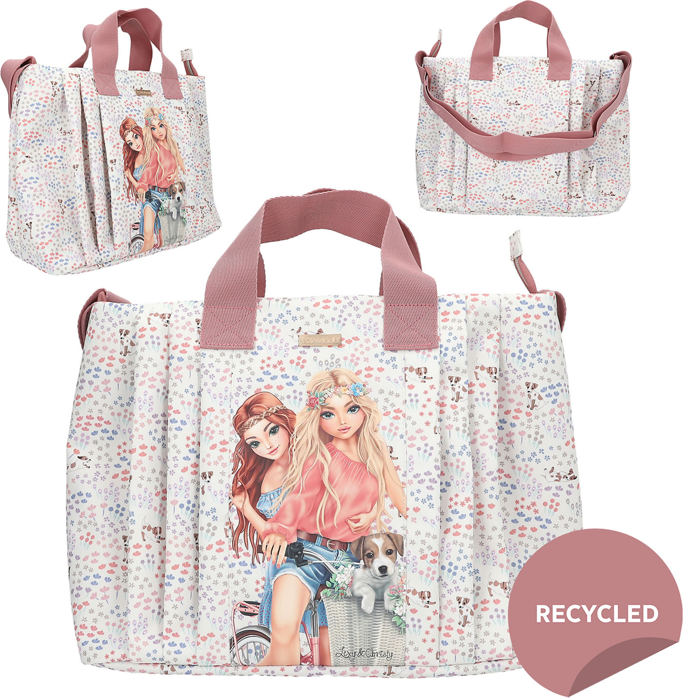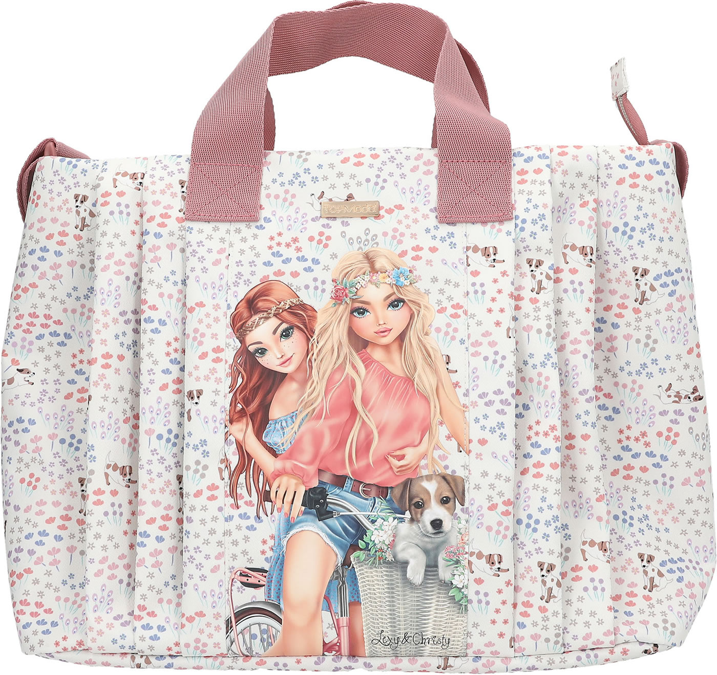 Blümchen, kleine Hunde und jede Menge TOPModel-Style: Die Sporttasche hat auf der Front ein tierisch tolles Doppel-Model-Motiv auf einem hübschen Fahrrad und rundherum ein feines Muster aus kleinen Blümchen und tollenden Hunden. Der Erd-Ton der Griffe und des verstellbaren Gurtes setzen einen harmonischen Kontrast.