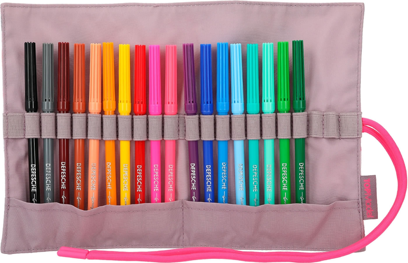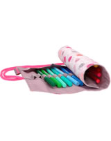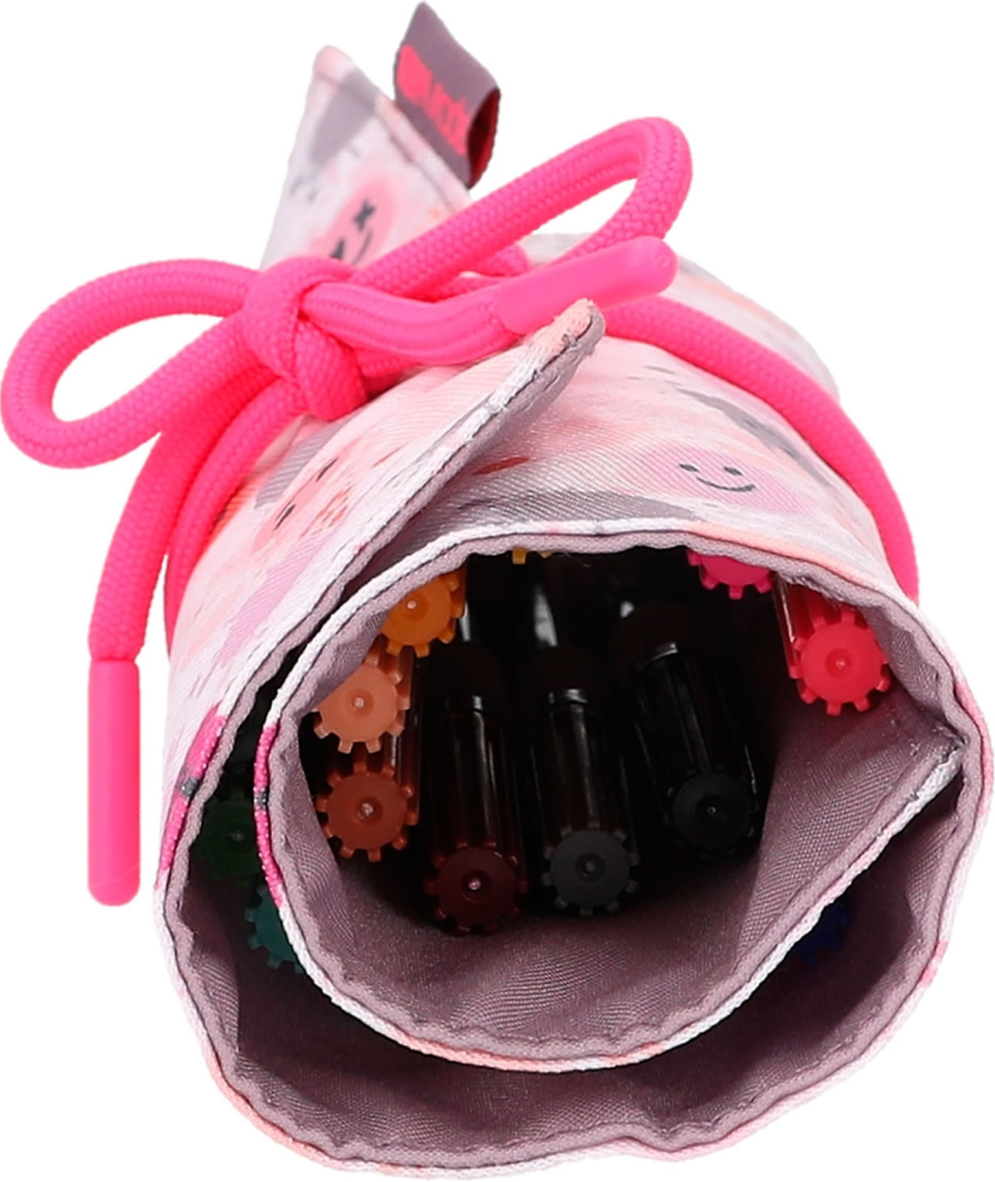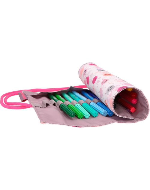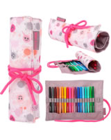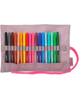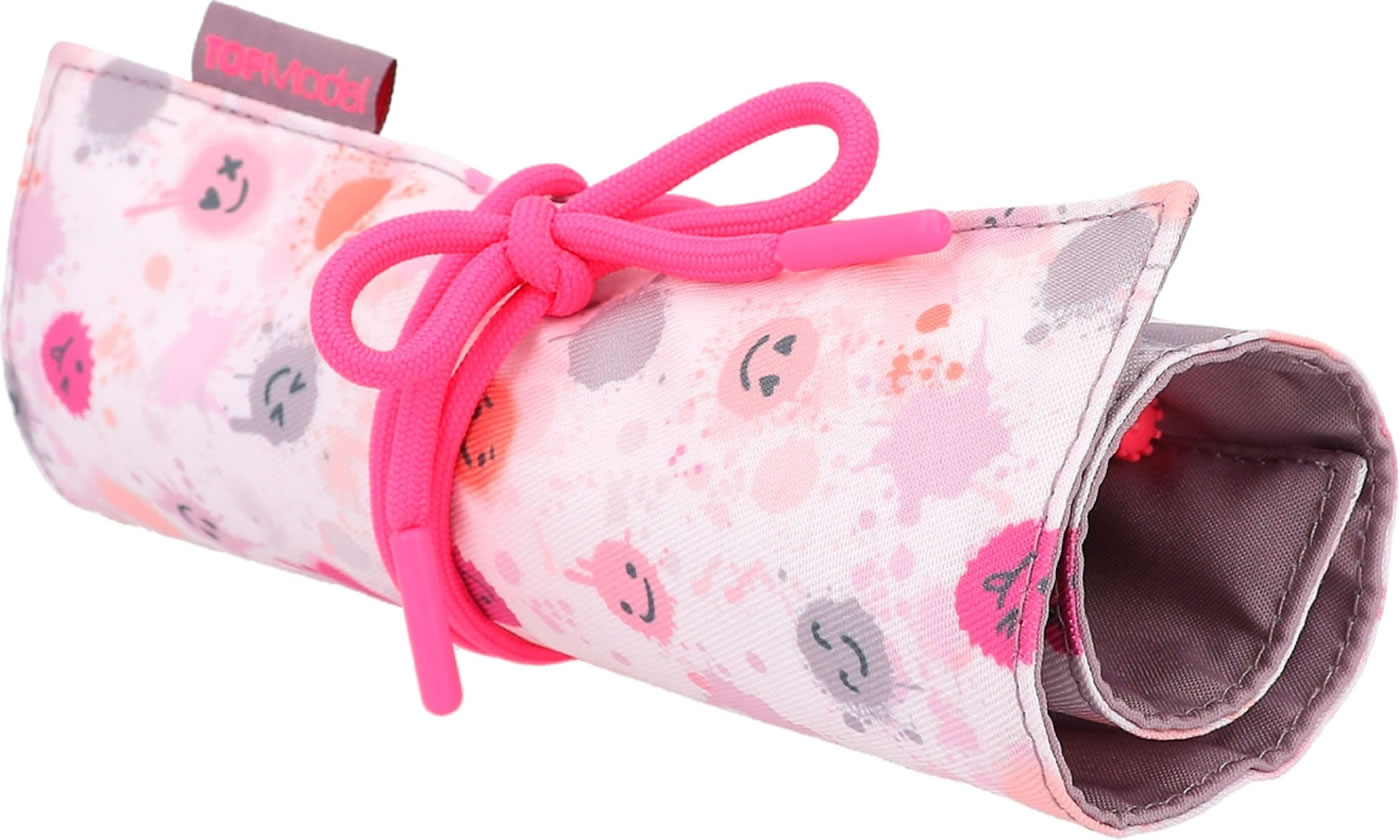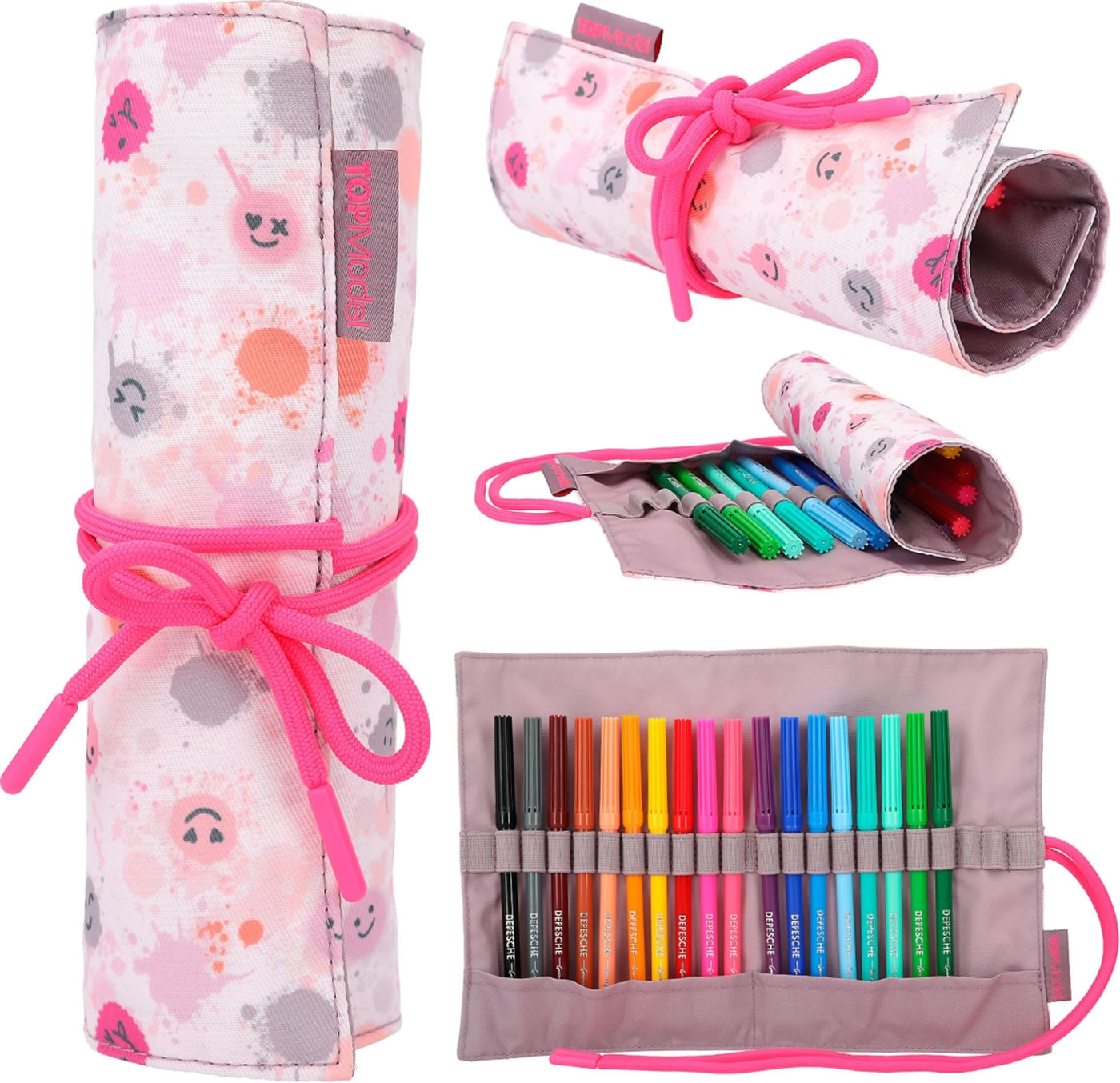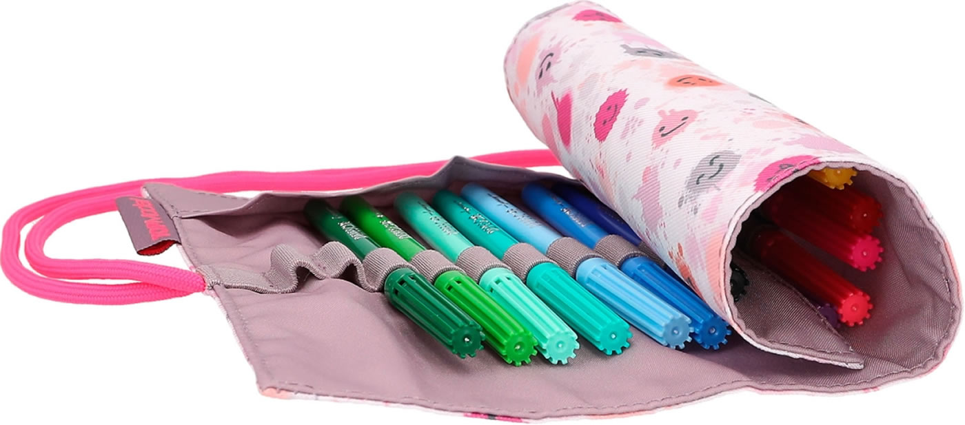 Stifte-Organisation wie ein Profi: Bindeband öffnen, Matte ausrollen und einen der 18 bunten Fasermaler schnappen. Mit zusätzlich zwei freien Loops innen. Außen mit fröhlich-coolem Smiley-Allover-Print der TOPModel-Serie Happy Together.