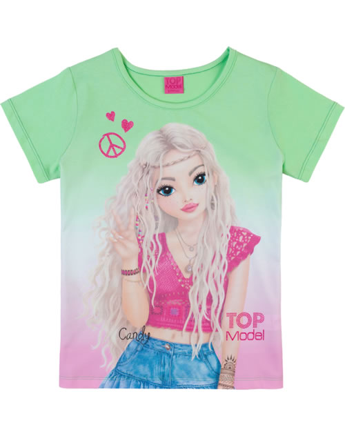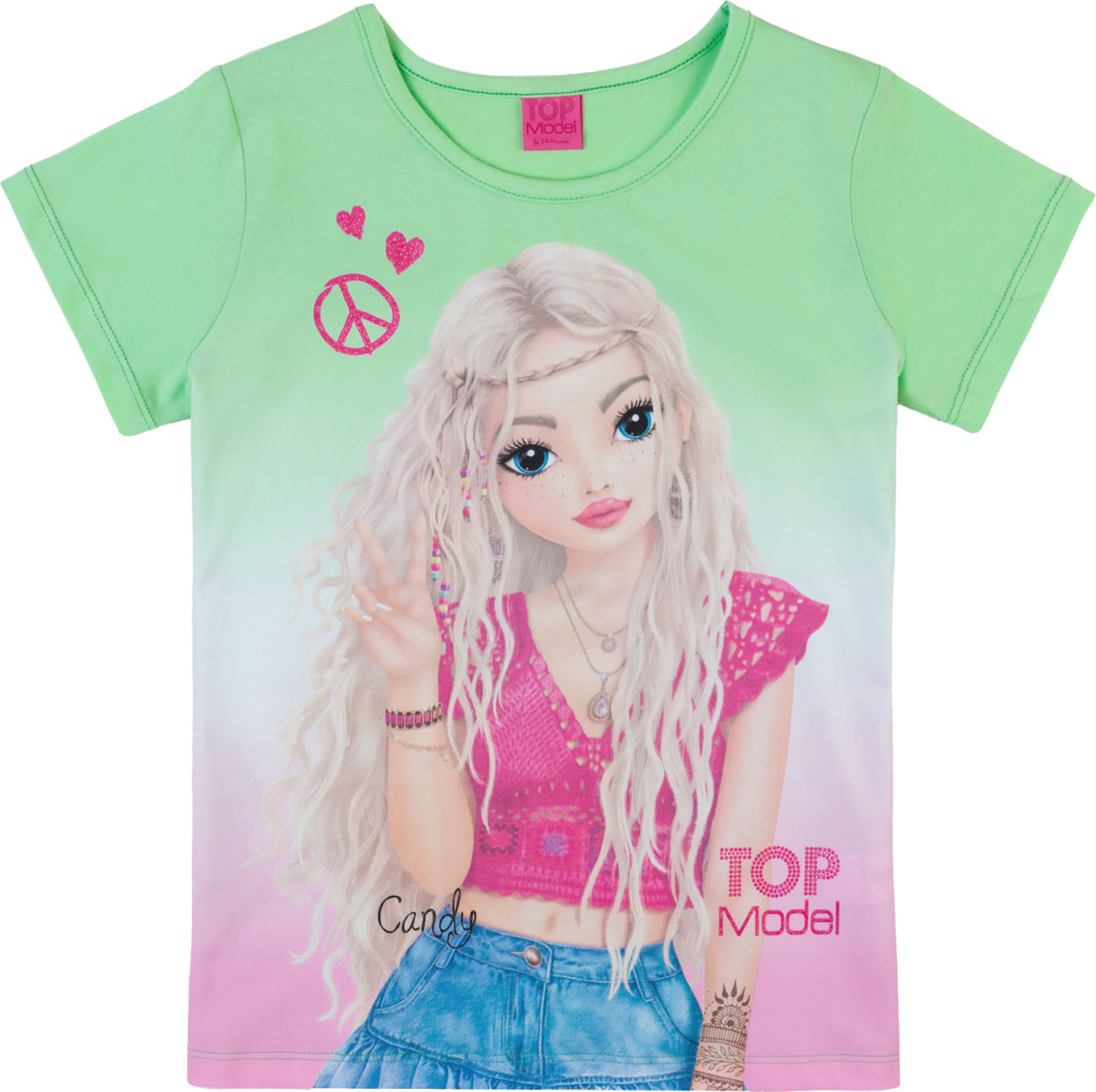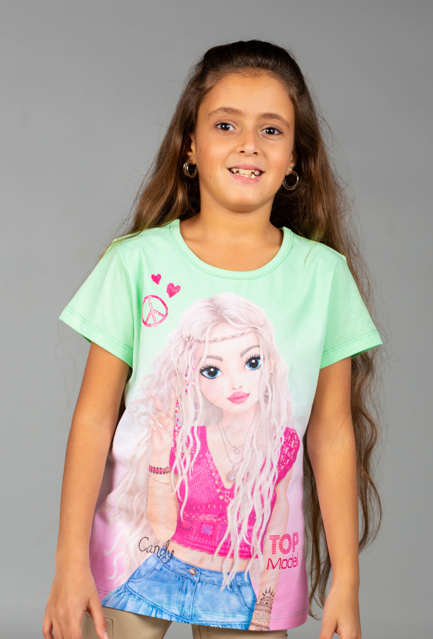 Hübsches Kurzarm T-Shirt in grün von TOPModel mit dem Model Candy auf der Vorderseite. Zusätzlich wird das Shirt mit einem glitzernden TOPModel Print geziert. Das angenehme Material bietet einen hohen Tragekomfort.