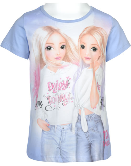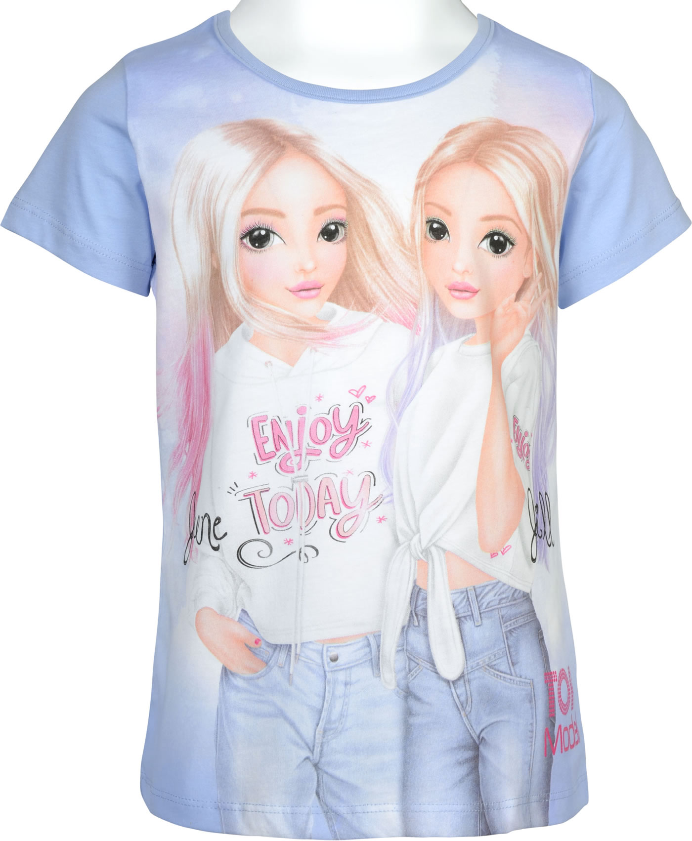 Hübsches Kurzarm T-Shirt in hellblau von TOPModel mit den Models June & Jill auf der Vorderseite. Zusätzlich wird das Shirt von einem glitzernden TOPModel Print geziert. Das angenehme Material bietet einen hohen Tragekomfort.