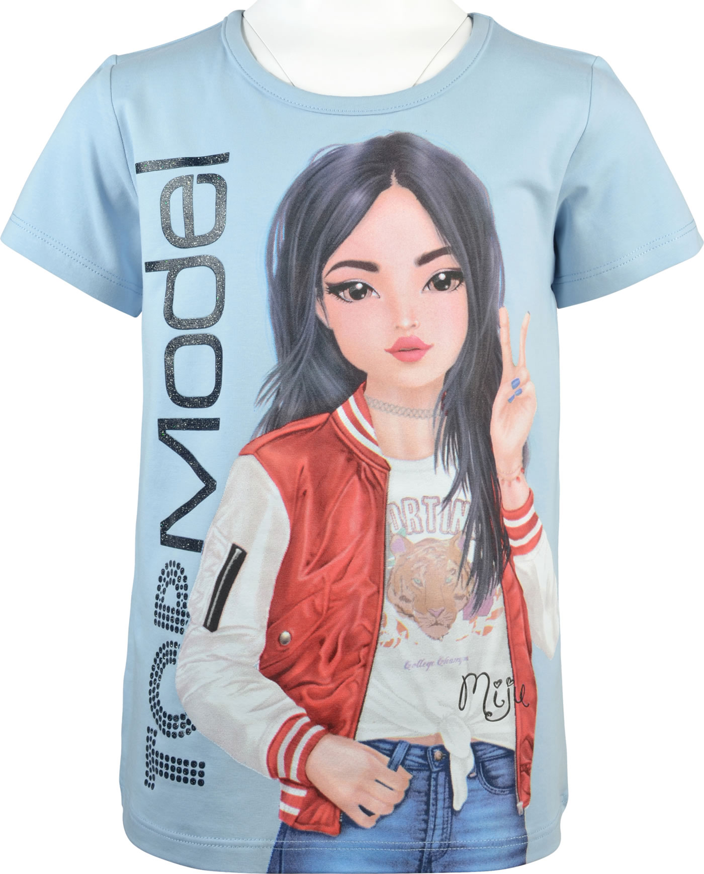 Hübsches blaues Kurzarm T-Shirt von TOPModel mit dem Model Miju auf der Vorderseite. Zusätzlich wird das Shirt mit einem glitzernden TOPModel Print geziert. Das angenehme Material bietet einen hohen Tragekomfort.