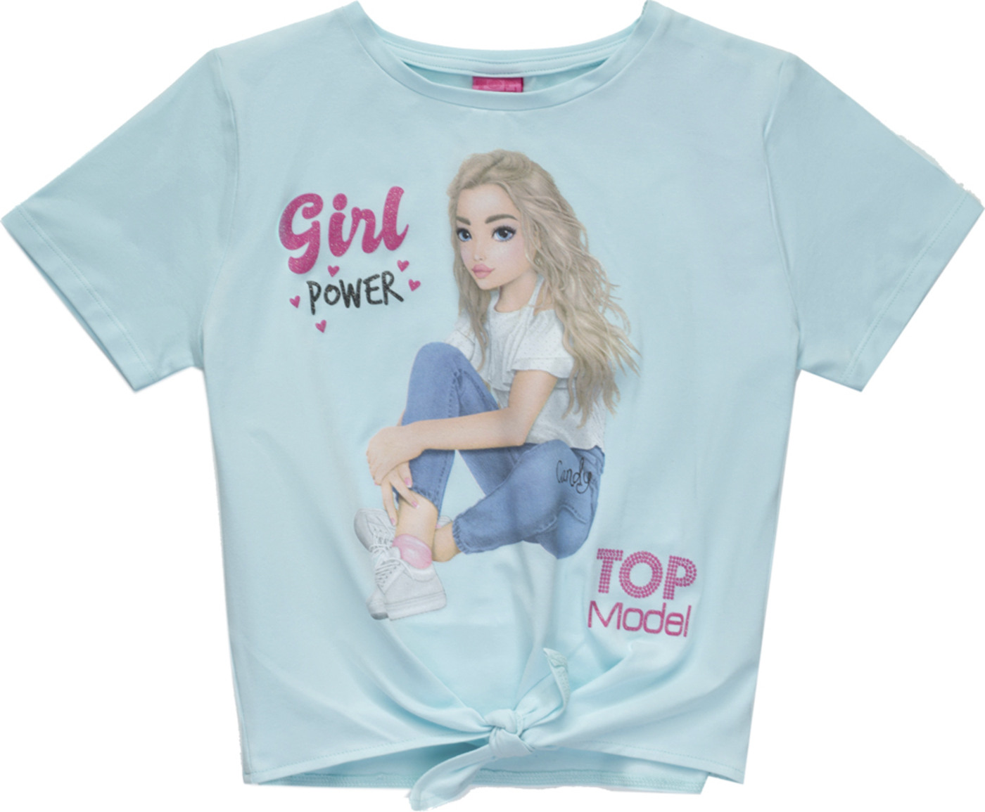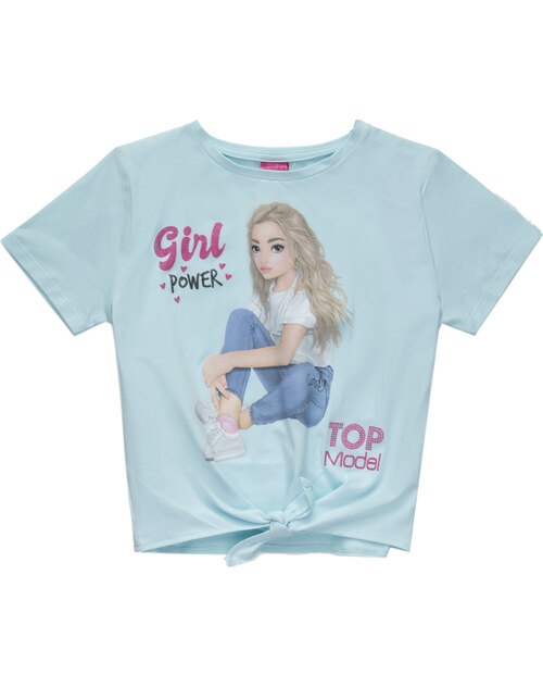 Hübsches türkises Kurzarm T-Shirt zum Knoten von TOPModel mit dem Model Candy auf der Vorderseite.