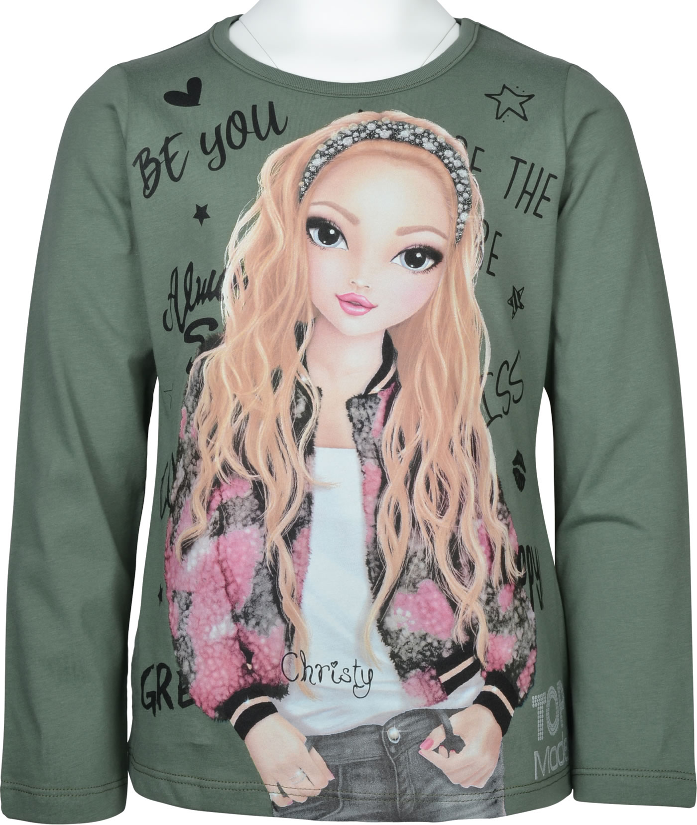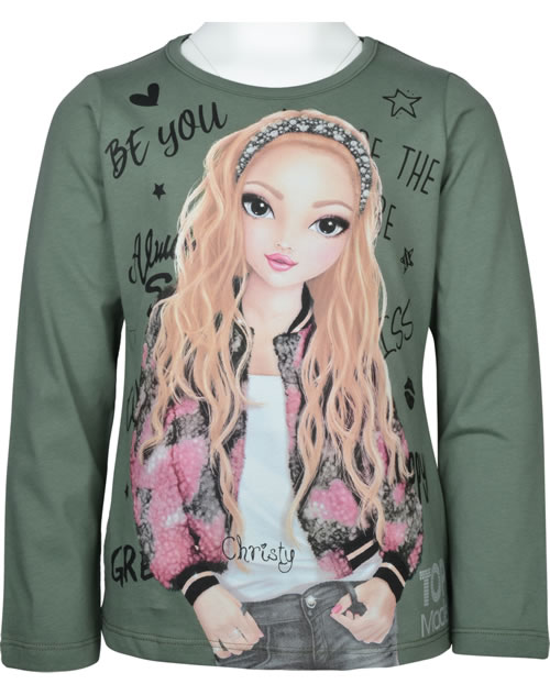 Hübsches Langarm-Shirt in grün von TOPModel mit dem Model Christy auf der Vorderseite. Zusätzlich wird das Shirt von einem glitzernden Print TOPModel geziert. Das angenehme Material bietet einen hohen Tragekomfort.