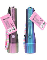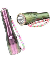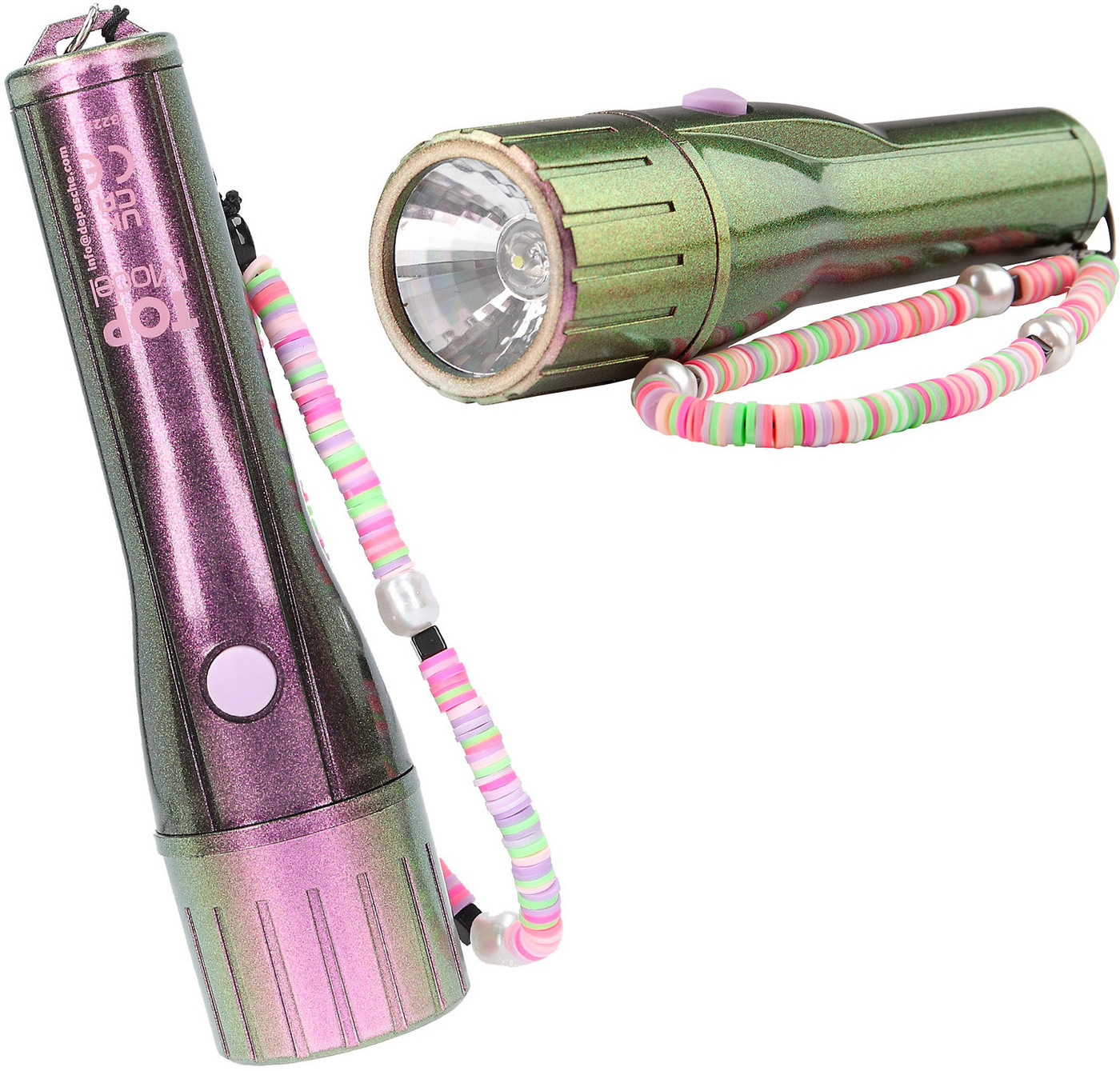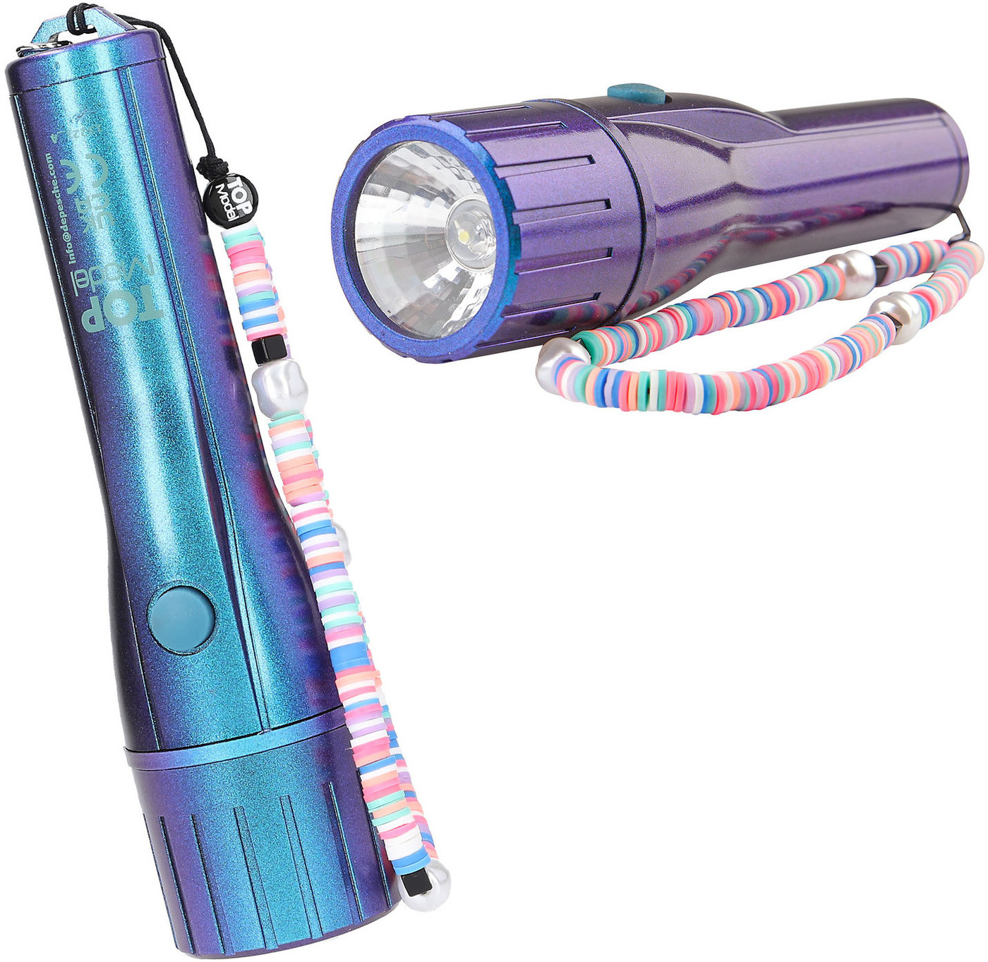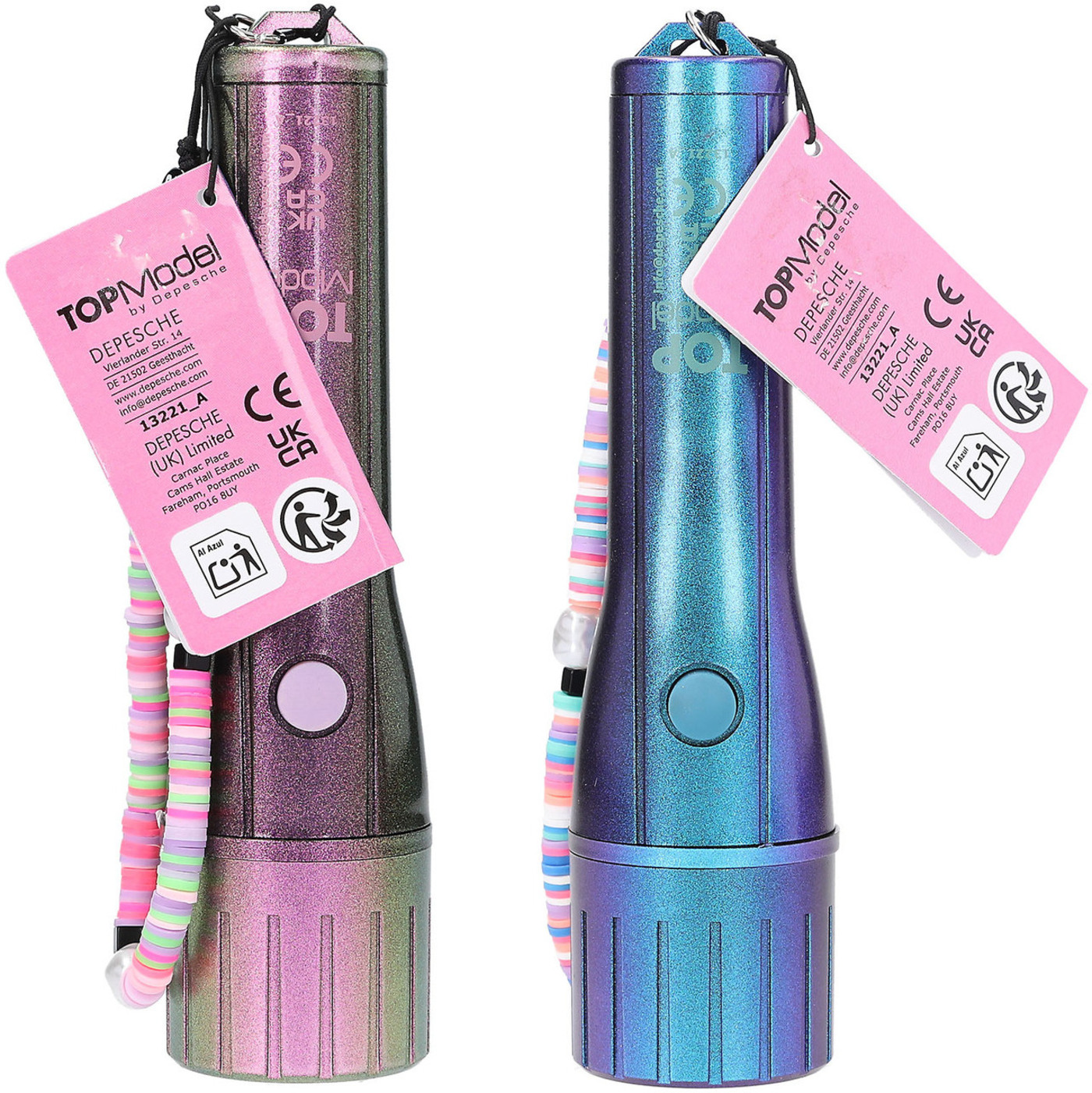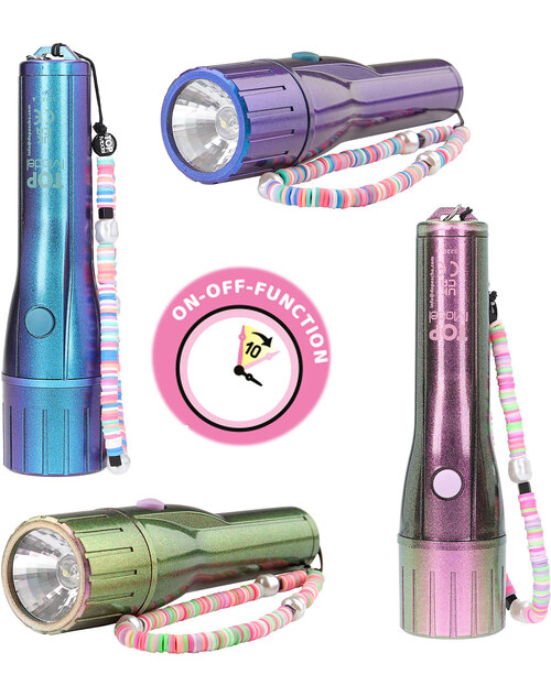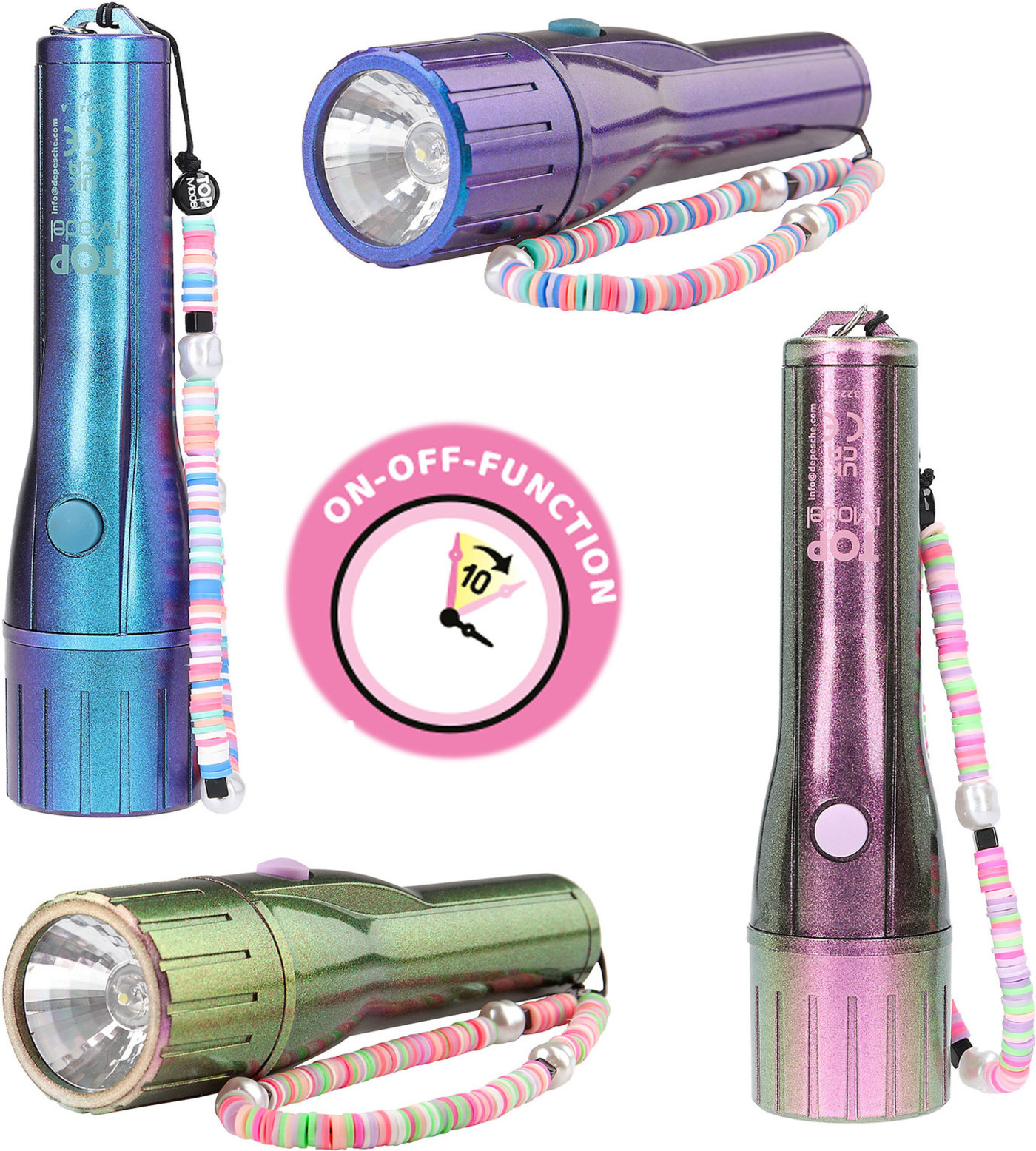 Leuchten mit Style: Die beiden TOPModel-Taschenlampen changieren edel in Blau oder Grün-Rosa. Mit Hingucker-Handschlaufen aus farblich passenden bunten Perlen. Praktisch: Die Taschenlampe hat eine Switch-off-Funktion und stellt sich nach 10 Minuten automatisch wieder aus.