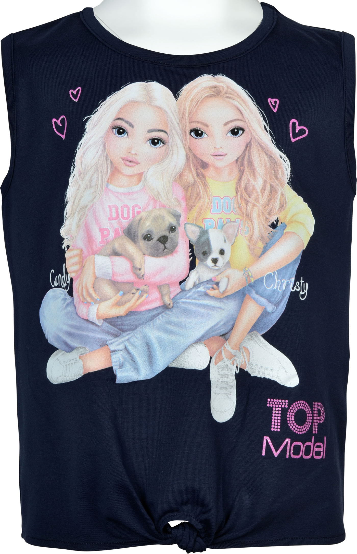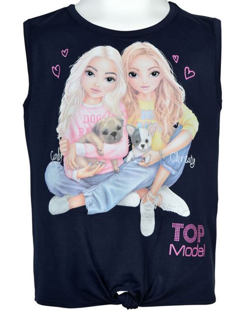 Sommerliches Top zum Knoten in navy von TOPMODEL mit den Models Candy & Christy auf der Vorderseite. Ein toller Hingucker sind die glitzernden Details und der Top-Model-Schriftzug.