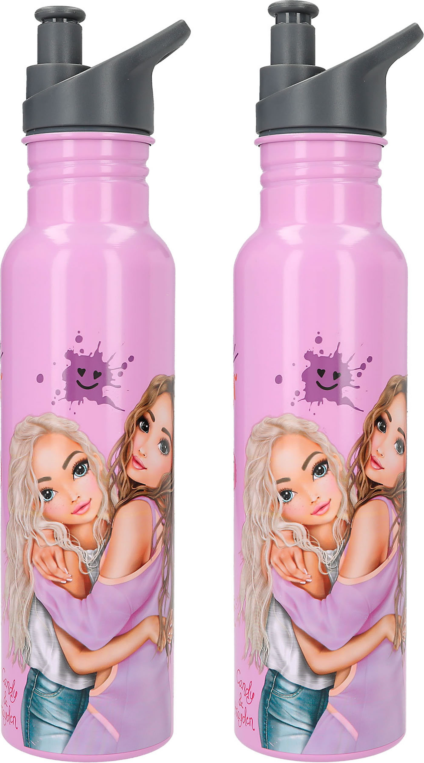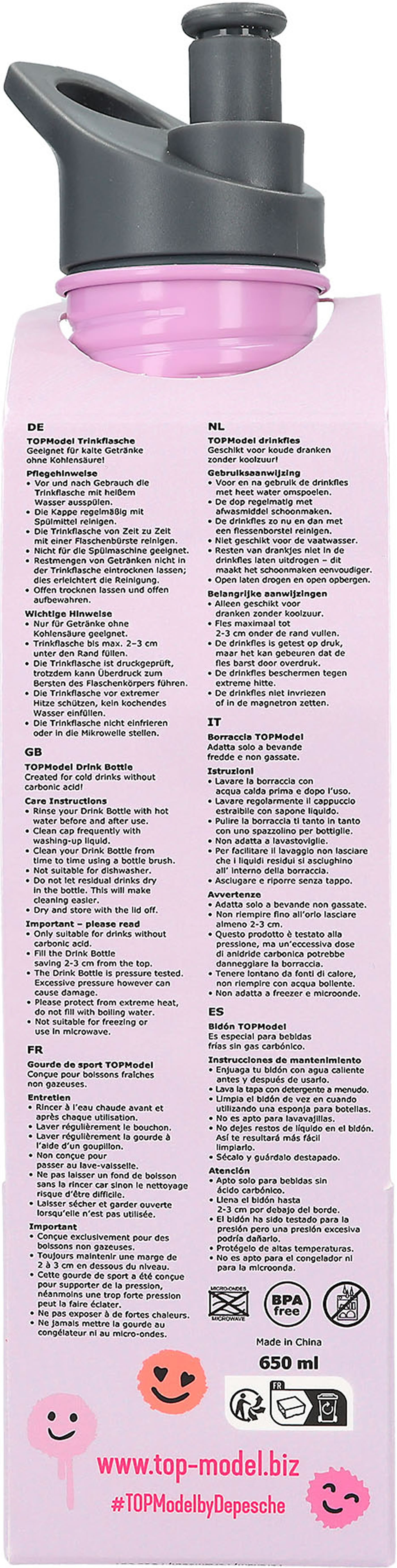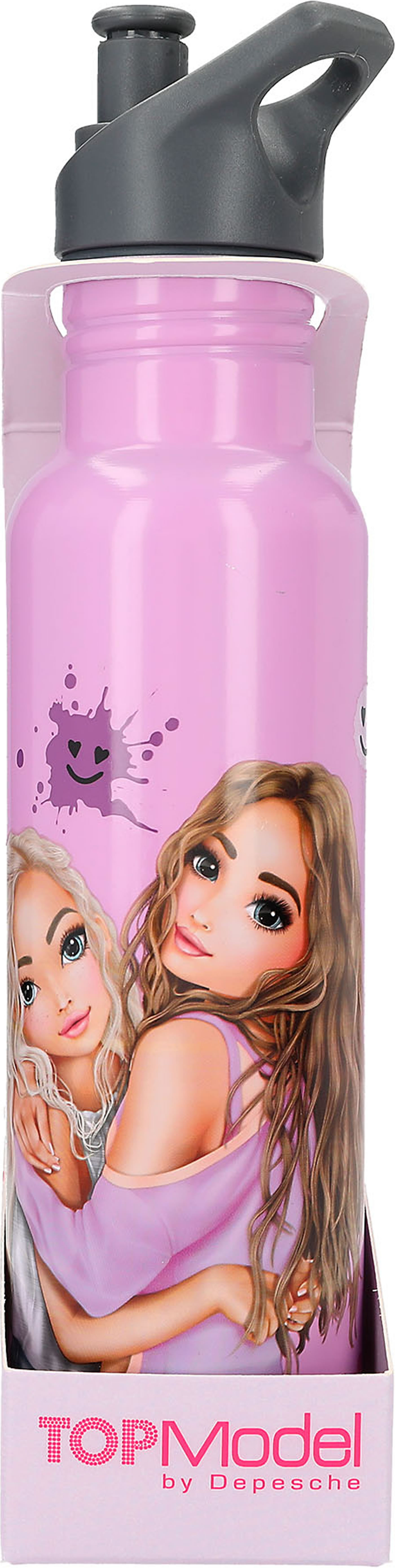 Die sehr leichte Trinkflasche aus der TOPModel-Serie Happy Together ist aus hochwertigem Aluminium, fasst 650 ml und hat eine große Trinköffnung mit auslaufsicherem Schraubverschluss. In strahlendem Lila, mit einem tollen Model-Motiv und fröhlichen Smiley-Prints. Die Trinkflasche ist geeignet für kalte Getränke (kein Thermoeffekt) ohne Kohlensäure.