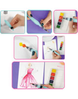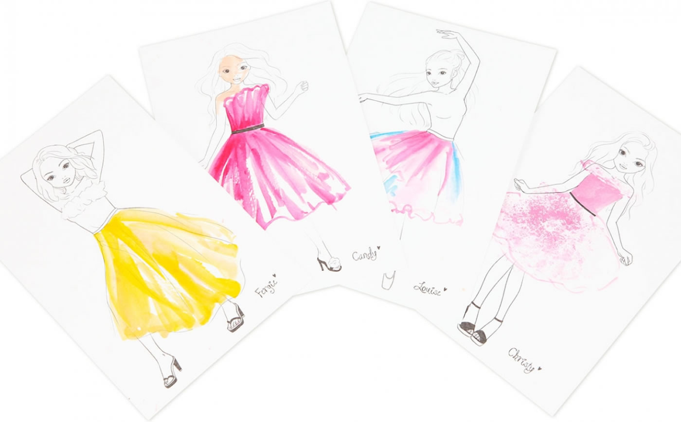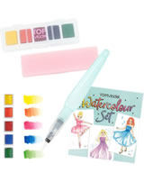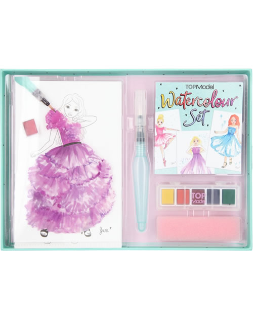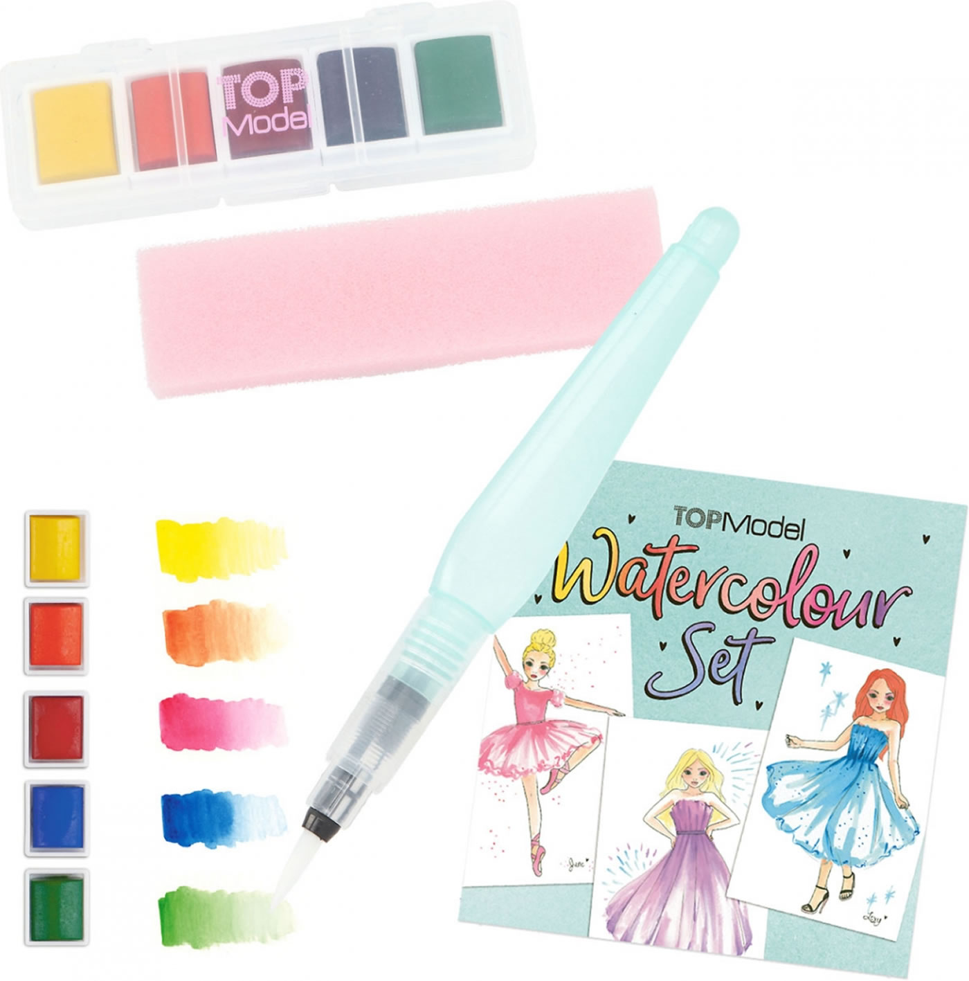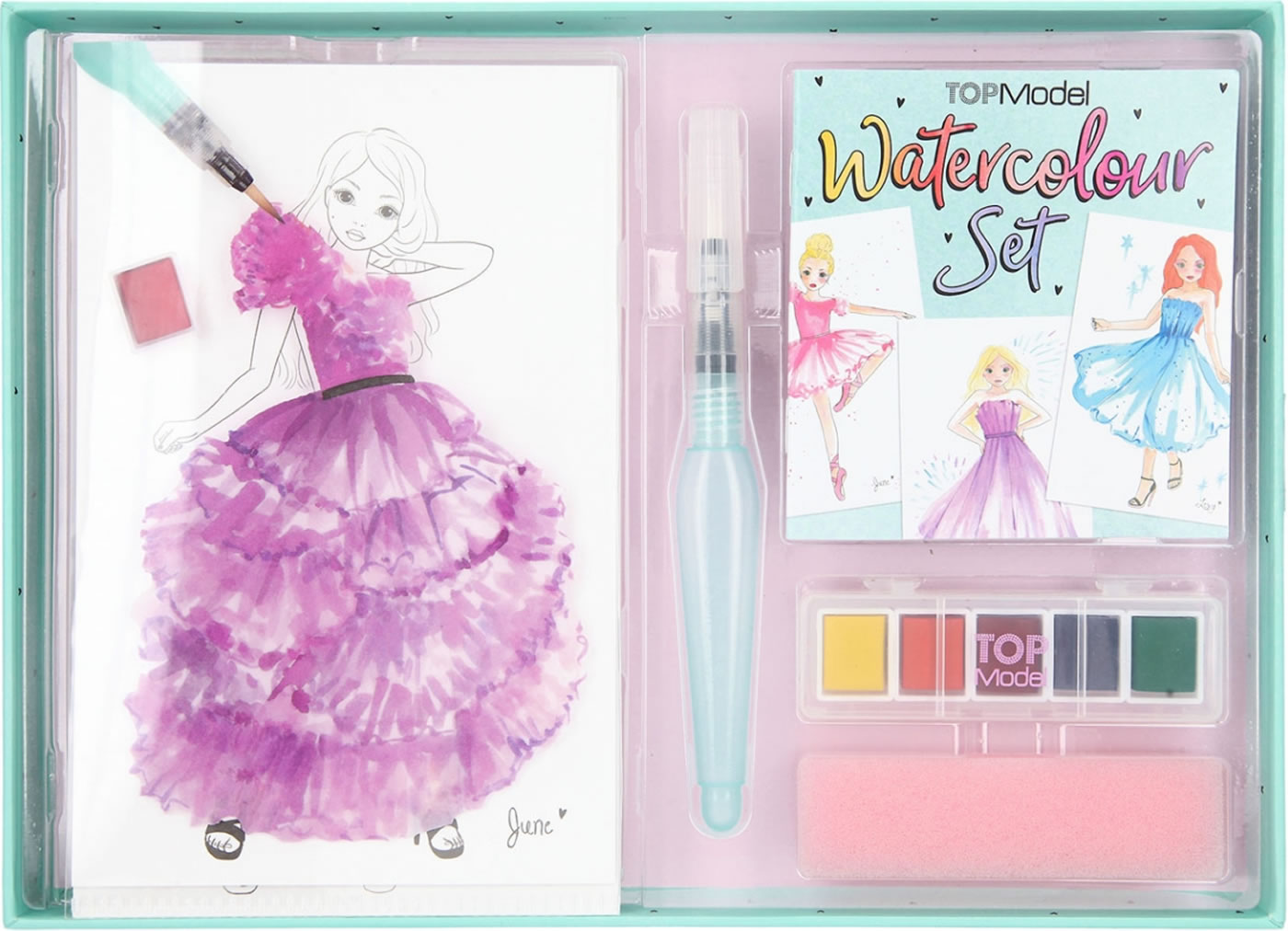 Das TOPModel-Set besteht aus 20 Aquarellpapier-Bögen, einem Pinselstift, der mit Wasser gefüllt werden kann, einem Schwämmchen sowie 5 Wasserfarben (Gelb, Rot, Lila, Blau, Grün). Zusammen mit der Anleitung gelingen so wunderschöne, romantische Designs.
