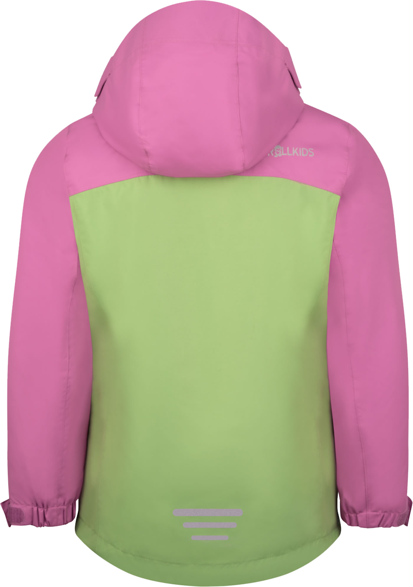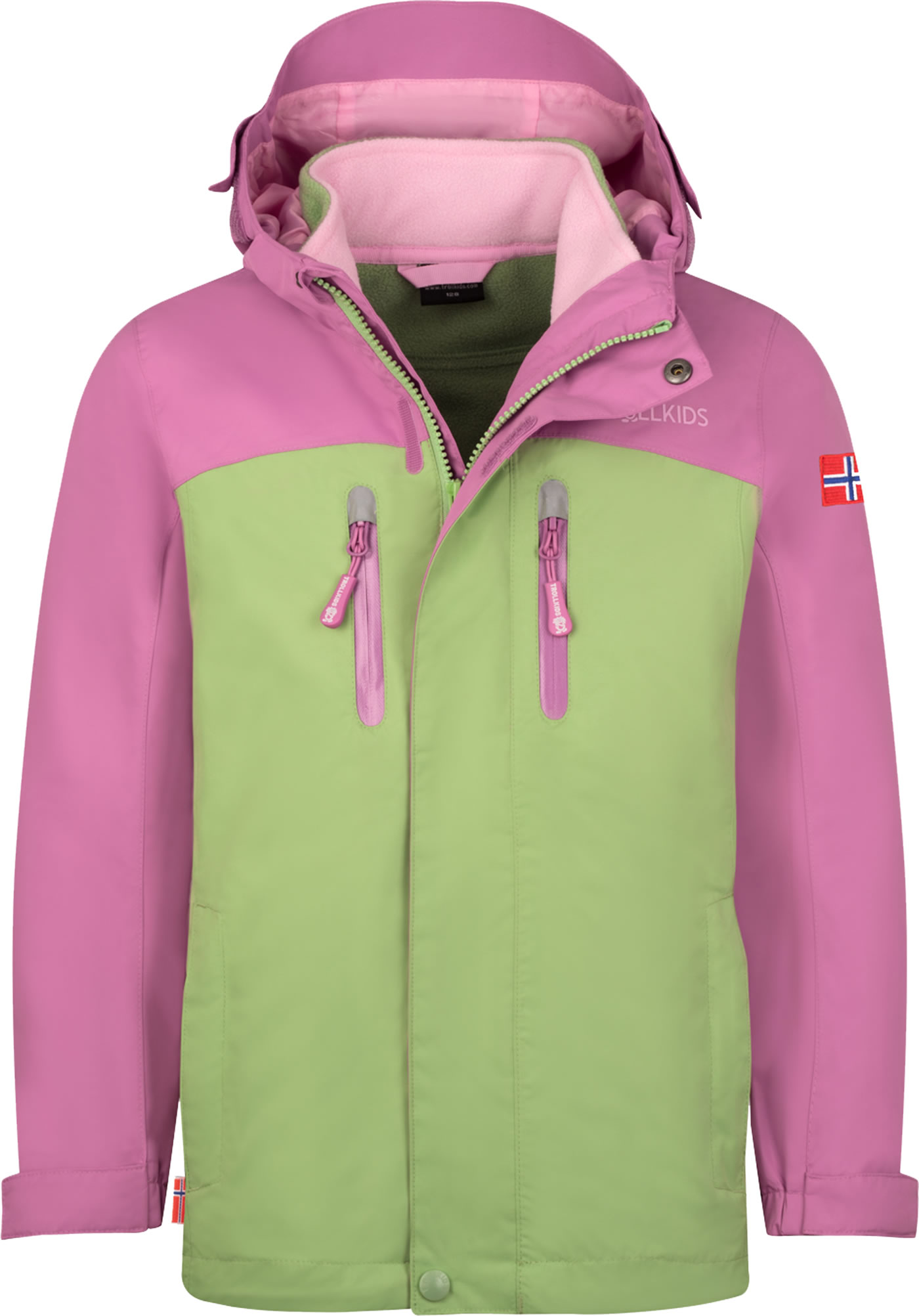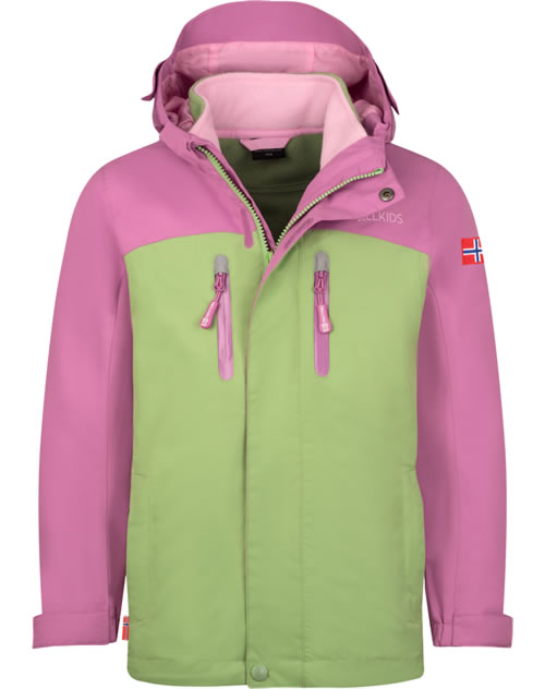 Die 3in1 Kinder-Jacke GIRLS BRYGGEN von TROLLKIDS ist ein perfekter Begleiter durch alle Jahreszeiten und für alle Outdoor-Aktivitäten. Die farbenfrohe Allwetter-Jacke kombiniert eine wasser- und winddichte sowie atmungsaktive Außenjacke mit einer kuschelig warmen, pflegeleichten Fleece-Innenjacke. Beide Jacken können separat getragen werden. Die Außenjacke besteht aus 2-lagigem Material und hat einen angenehmen Tragekomfort. Dank der Aquaproof-Membran bleibt das Kind vor Regen und Schnee geschützt. Der Reißverschluss hat eine Schutzklappe mit Druckknöpfen und Klettverschlüsse an den Bündchen und der elastische Saum schützen ebenfalls vor Wind und Nässe. Reflektierende Details sorgen für gute Sichtbarkeit wenn die Sichtverhältnisse mal nicht so gut sind.