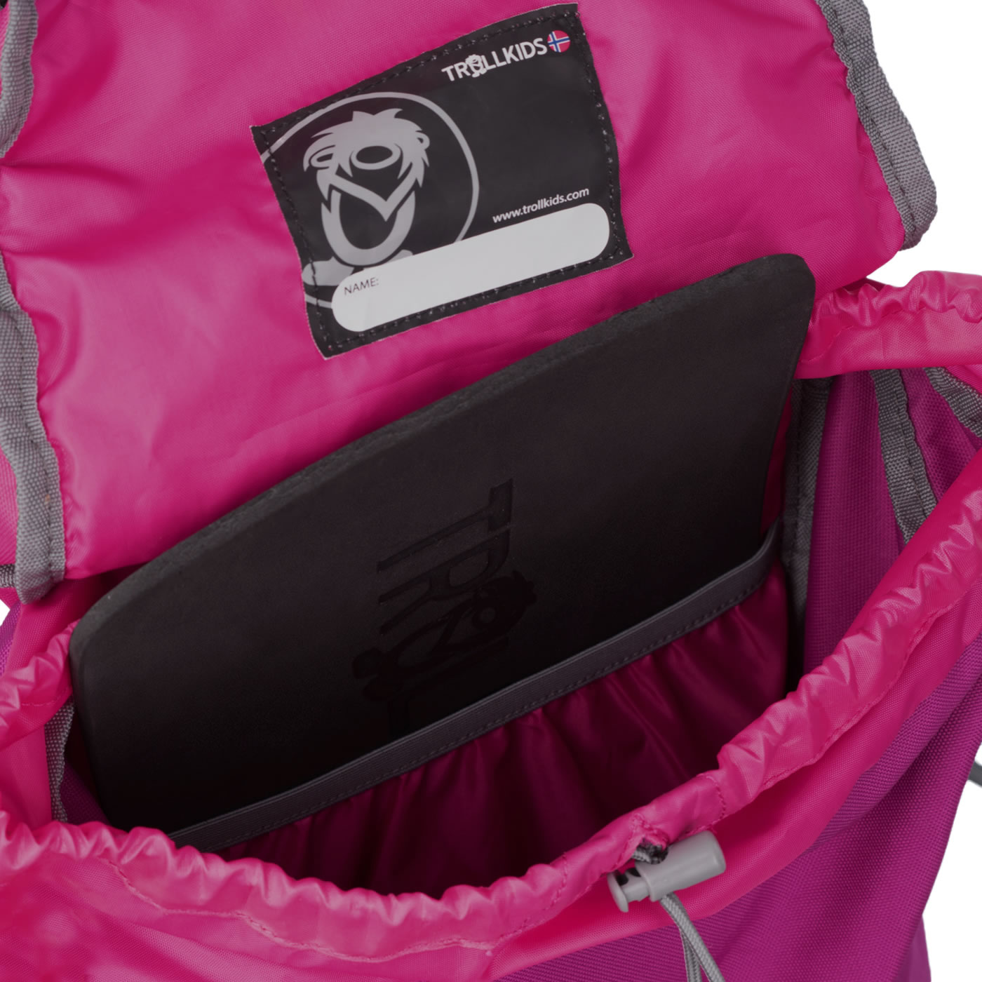 Der Toploader Tagesrucksack von TROLLKIDS ist aus robustem 600D Polyester genäht und mit einem wasserdichtem Boden, Sitzmatte und Regenhülle ausgestattet. Das Tragesystem sorgt für Komfort dank gepolsterter Rückenteile und längenverstellbarer gepolsterter Trage-Riemen. Ein Hauptfach mit Trennwand, Deckelfach mit Reißverschluss und elastische Seitentaschen sorgen für genügend Ordnungsmöglichkeiten.