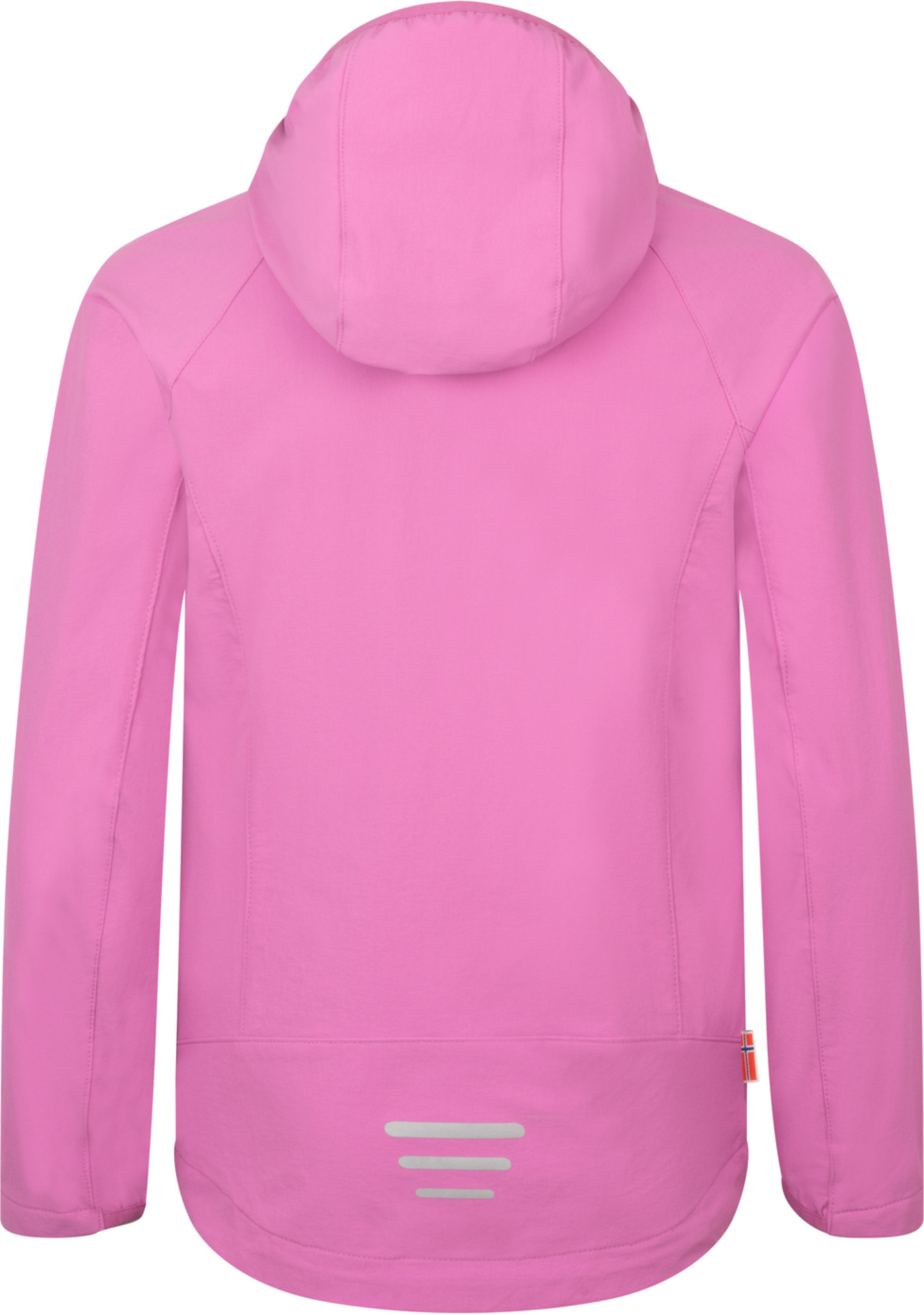 Die Jacke Kvalvika von TROLLKIDS ist eine leichte, ungefütterte Softshell-Jacke, die außer dezenter, reflektierender Details an den Ärmeln und auf der Rückseite schlicht einfarbig gehalten ist.