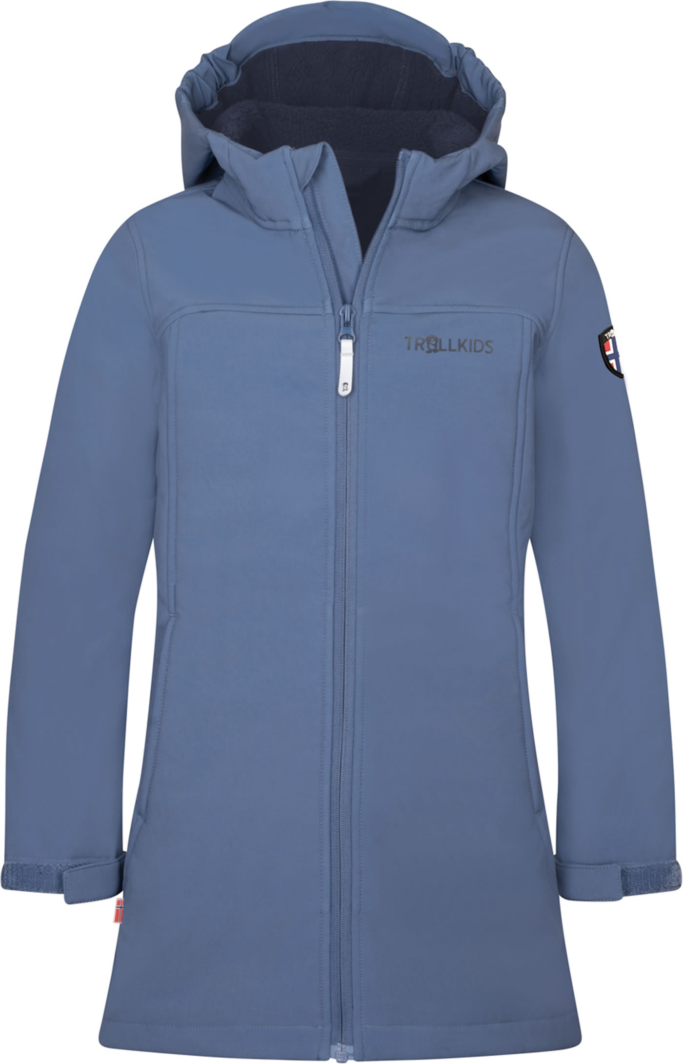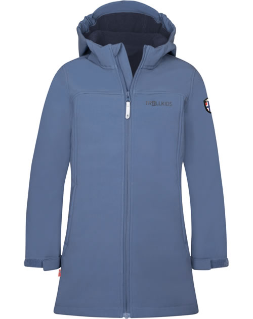 Softshell-Mantel KRISTIANSAND COAT von TROLLKIDS für Mädchen (leicht tailliert) mit Teddyfleece, wasserabweisend und winddicht, flexibel-elastisch und flauschig warm.  Ein echtes Muss für kühlere Tage und frische Abende. Der Mantel spendet Schutz bei leichtem Regen und hält durch das Teddyfleece-Futter schön warm. Darüber hinaus ist er durch sein klassisches Design ein modischer Hingucker! Klettverschlüsse an den Armen sorgen dafür, dass die Ärmellänge angepasst werden kann und kein Wind durch die Bündchen dringt. Auch die Kapuze lässt sich dank Klettverschluss individuell einstellen. Reflektoren befinden sich vorne und hinten.