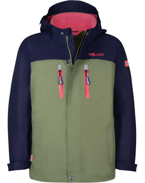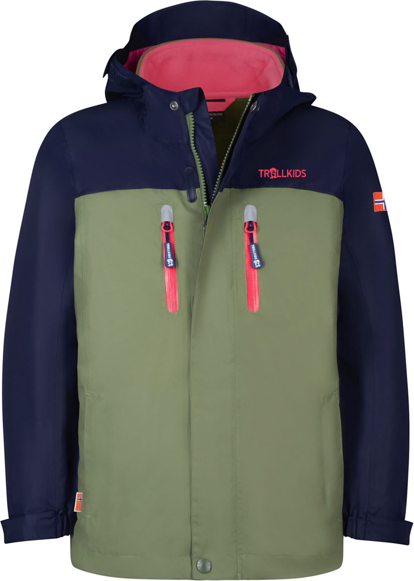 Die 3in1 Kinder-Jacke GIRLS BRYGGEN von TROLLKIDS ist ein perfekter Begleiter durch alle Jahreszeiten und für alle Outdoor-Aktivitäten. Die farbenfrohe Allwetter-Jacke kombiniert eine wasser- und winddichte sowie atmungsaktive Außenjacke mit einer kuschelig warmen, pflegeleichten Fleece-Innenjacke. Beide Jacken können separat getragen werden. Die Außenjacke besteht aus 2-lagigem Material und hat einen angenehmen Tragekomfort. Dank der Aquaproof-Membran bleibt das Kind vor Regen und Schnee geschützt. Der Reißverschluss hat eine Schutzklappe mit Druckknöpfen und Klettverschlüsse an den Bündchen und der elastische Saum schützen ebenfalls vor Wind und Nässe. Reflektierende Details sorgen für gute Sichtbarkeit wenn die Sichtverhältnisse mal nicht so gut sind.