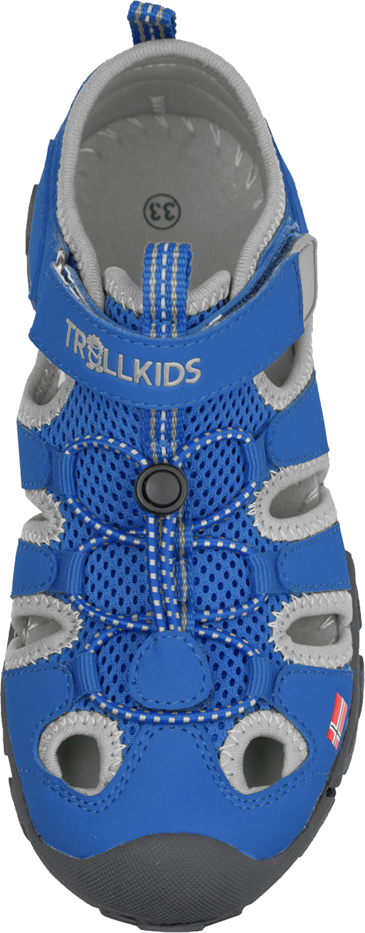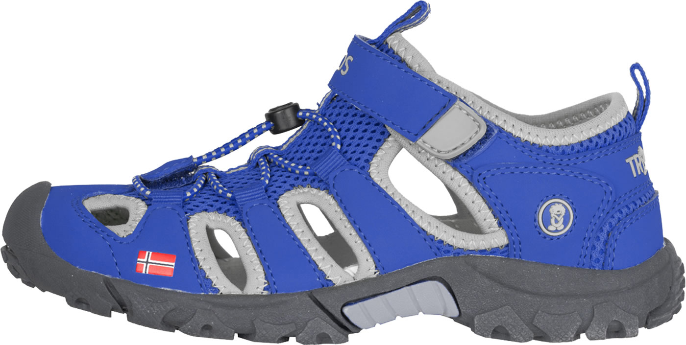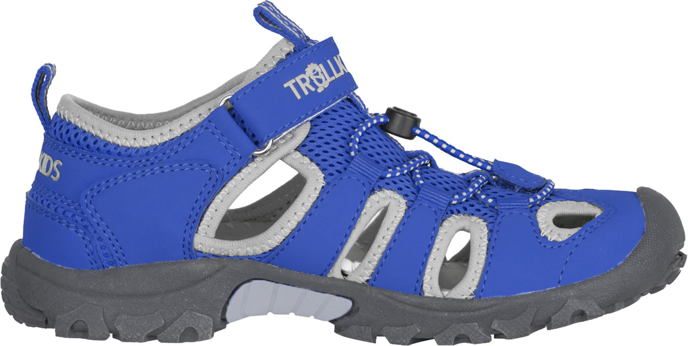 Robuste Sportsandale Kristiansand mit Zehenschutz von TROLLKIDS. Die leichte Sandale ist mit einem Klettverschluss und elastischen Schnürsenkeln zu schließen. Mesh-Gewebe dient der Belüftung des Fußes. Innen ist die Sportsandale weich gefüttert, so kann nichts drücken oder scheuern. Schlaufen an Hacke und Lasche erleichtern das Anziehen. Die Innensohle ist herausnehmbar.