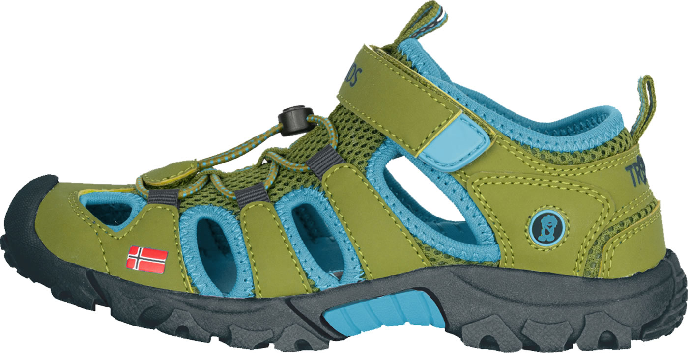 Robuste Sportsandale Kristiansand mit Zehenschutz von TROLLKIDS. Die leichte Sandale ist mit einem Klettverschluss und elastischen Schnürsenkeln zu schließen. Mesh-Gewebe dient der Belüftung des Fußes. Innen ist die Sportsandale weich gefüttert, so kann nichts drücken oder scheuern. Schlaufen an Hacke und Lasche erleichtern das Anziehen. Die Innensohle ist herausnehmbar.