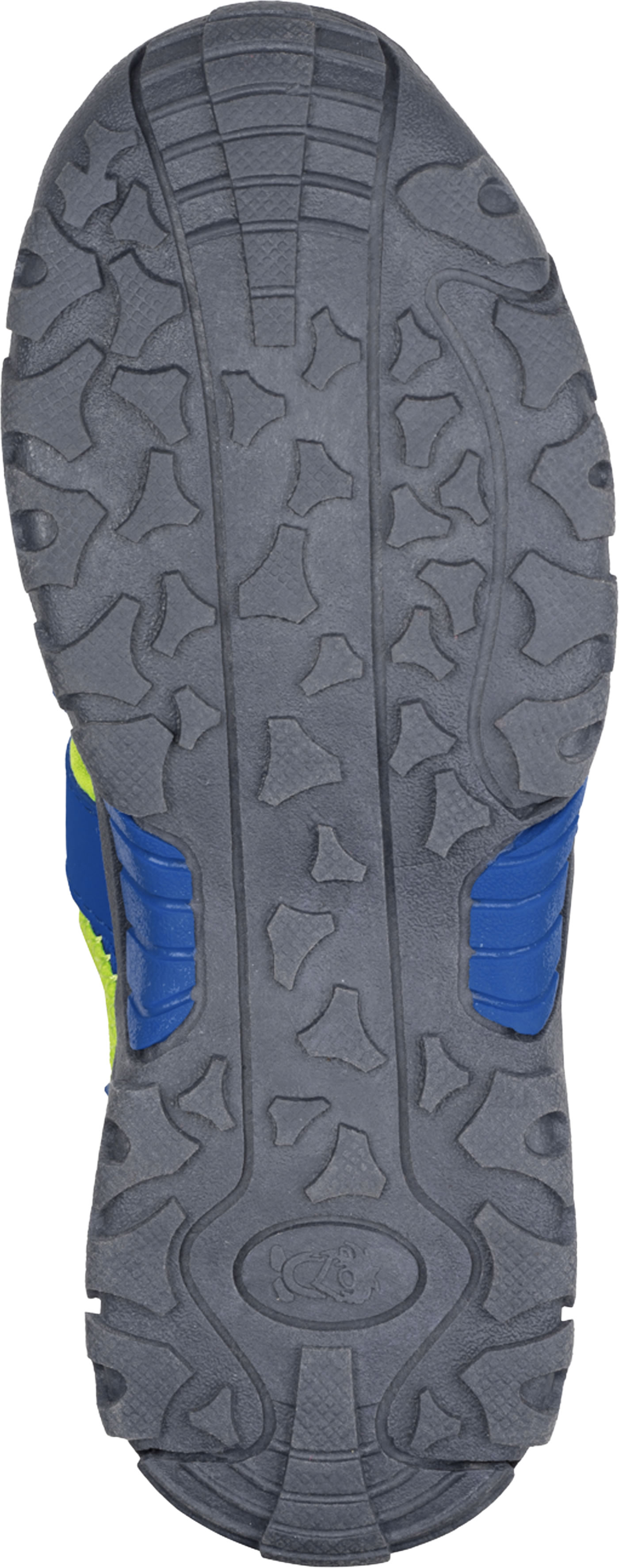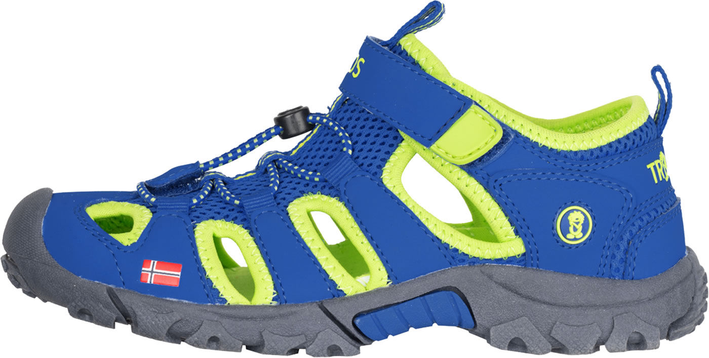 Robuste Sportsandale Kristiansand mit Zehenschutz von TROLLKIDS. Die leichte Sandale ist mit einem Klettverschluss und elastischen Schnürsenkeln zu schließen. Mesh-Gewebe dient der Belüftung des Fußes. Innen ist die Sportsandale weich gefüttert, so kann nichts drücken oder scheuern. Schlaufen an Hacke und Lasche erleichtern das Anziehen. Die Innensohle ist herausnehmbar.
