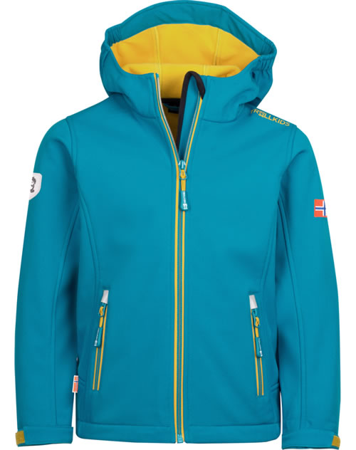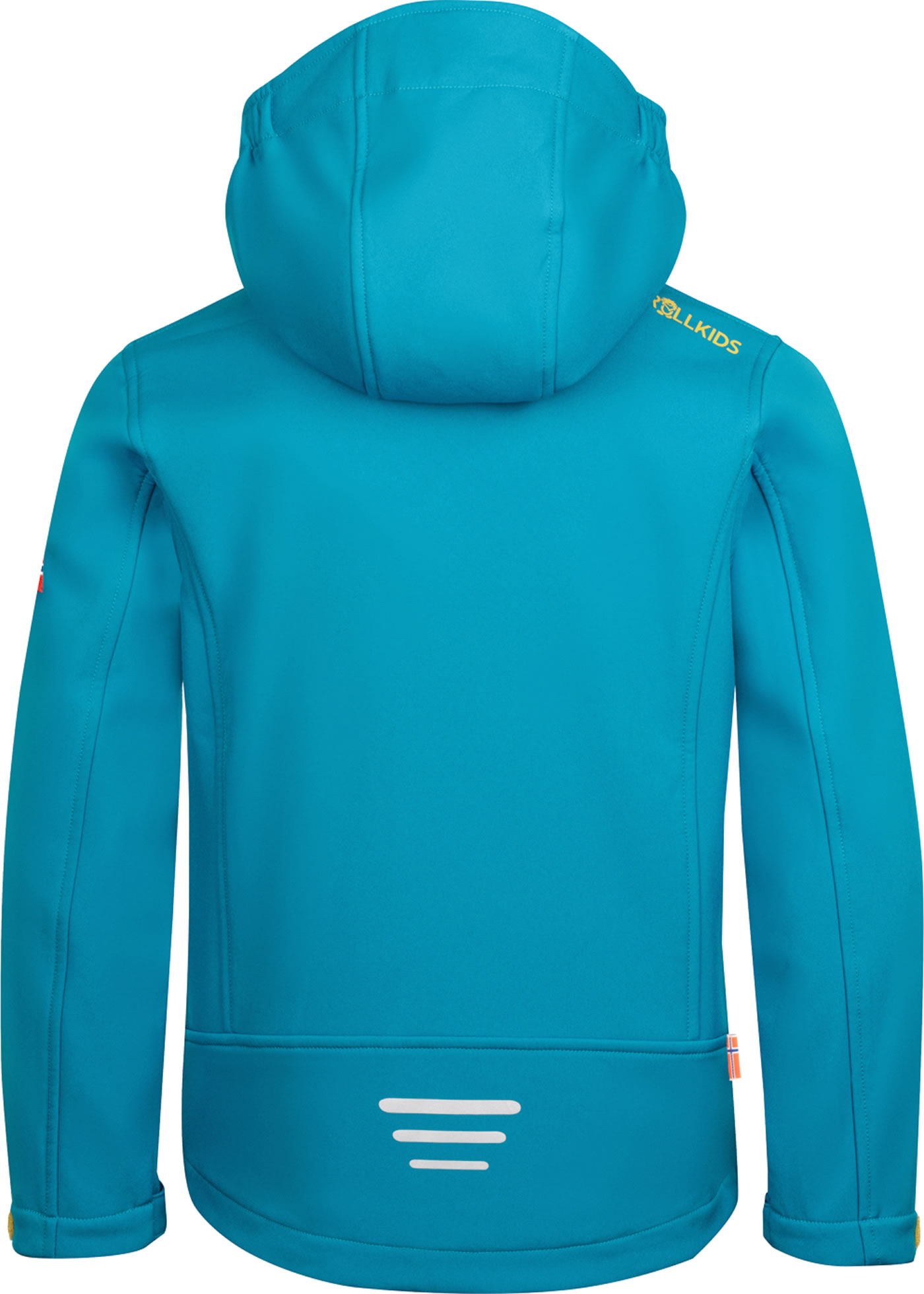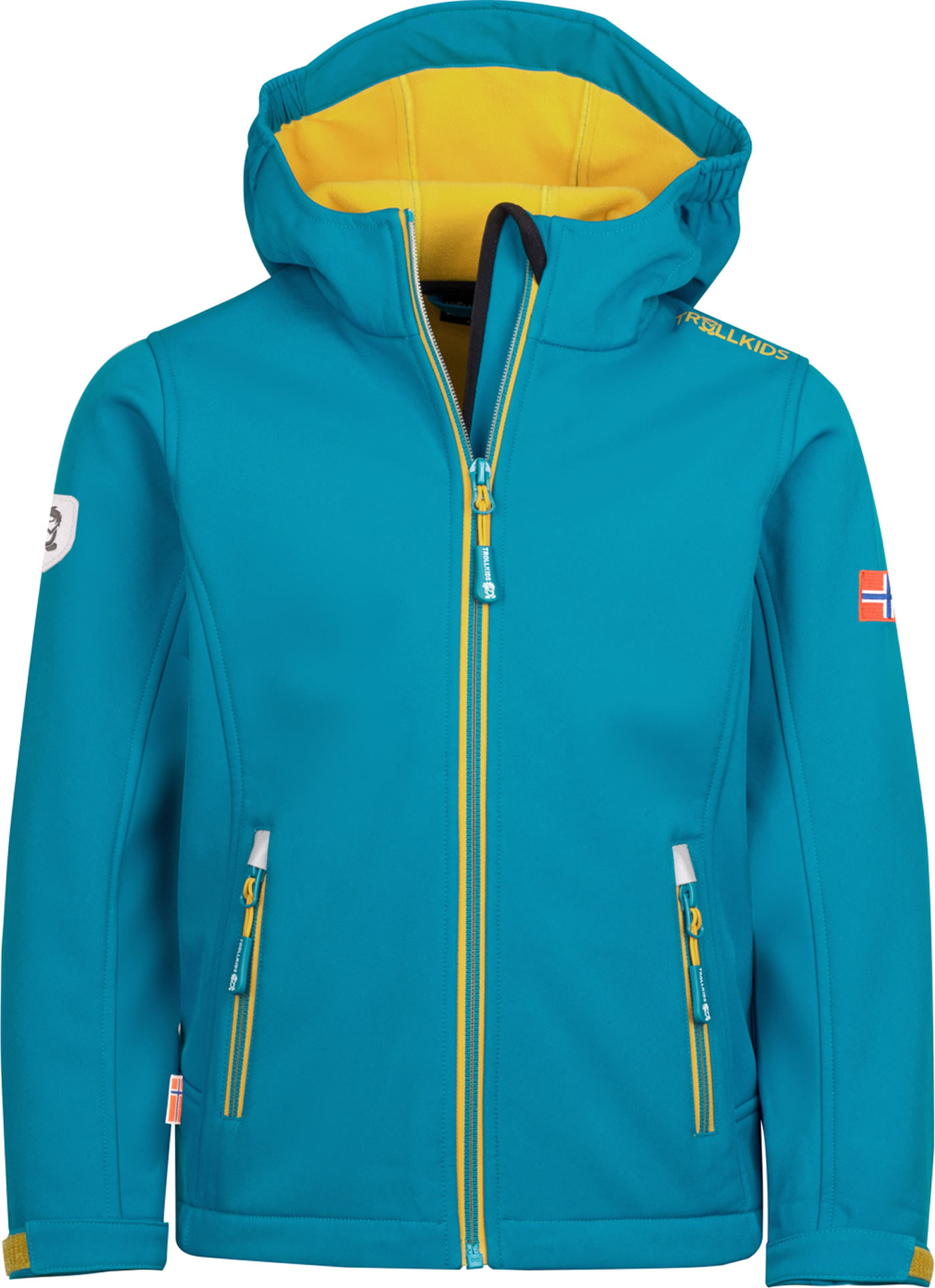 Einfarbige Softshell-Jacke von TROLLKIDS mit Kontrastreißverschlüssen, wasserabweisend und winddicht, flexibel-elastisch und flauschig warm.  Ein echtes Muss für die Übergangszeit und für Aktivitäten, bei denen ein hoher Bewegungsfreiraum benötigt wird. Darüber hinaus ein modischer Hingucker! Klettverschlüsse an den Armen sorgen dafür, dass die Ärmellänge angepasst werden kann und kein Wind durch die Bündchen dringt. Reflektoren befinden sich vorne und hinten; an den Oberarmen leuchtet die norwegische Flagge und der beliebte Lonely Troll aus dem Trollkids-Logo. Wasserabweisendes Obermaterial.