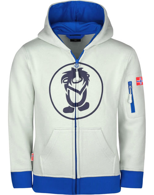 Der schicke Logoaufdruck auf der Vorderseite, die große Känguru-Tasche und die Ärmeltasche mit farblich abgesetztem Reißverschluss machen die Sweatjacke zu einem lässigen und praktischen Eyecatcher.