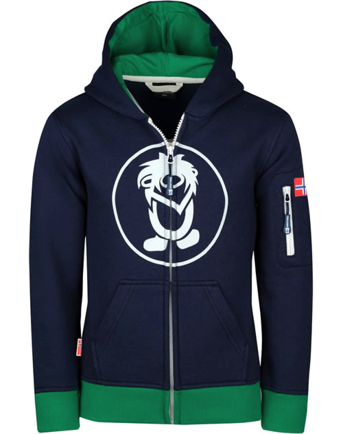 Der schicke Logoaufdruck auf der Vorderseite, die große Känguru-Tasche und die Ärmeltasche mit farblich abgesetztem Reißverschluss machen die Sweatjacke zu einem lässigen und praktischen Eyecatcher.