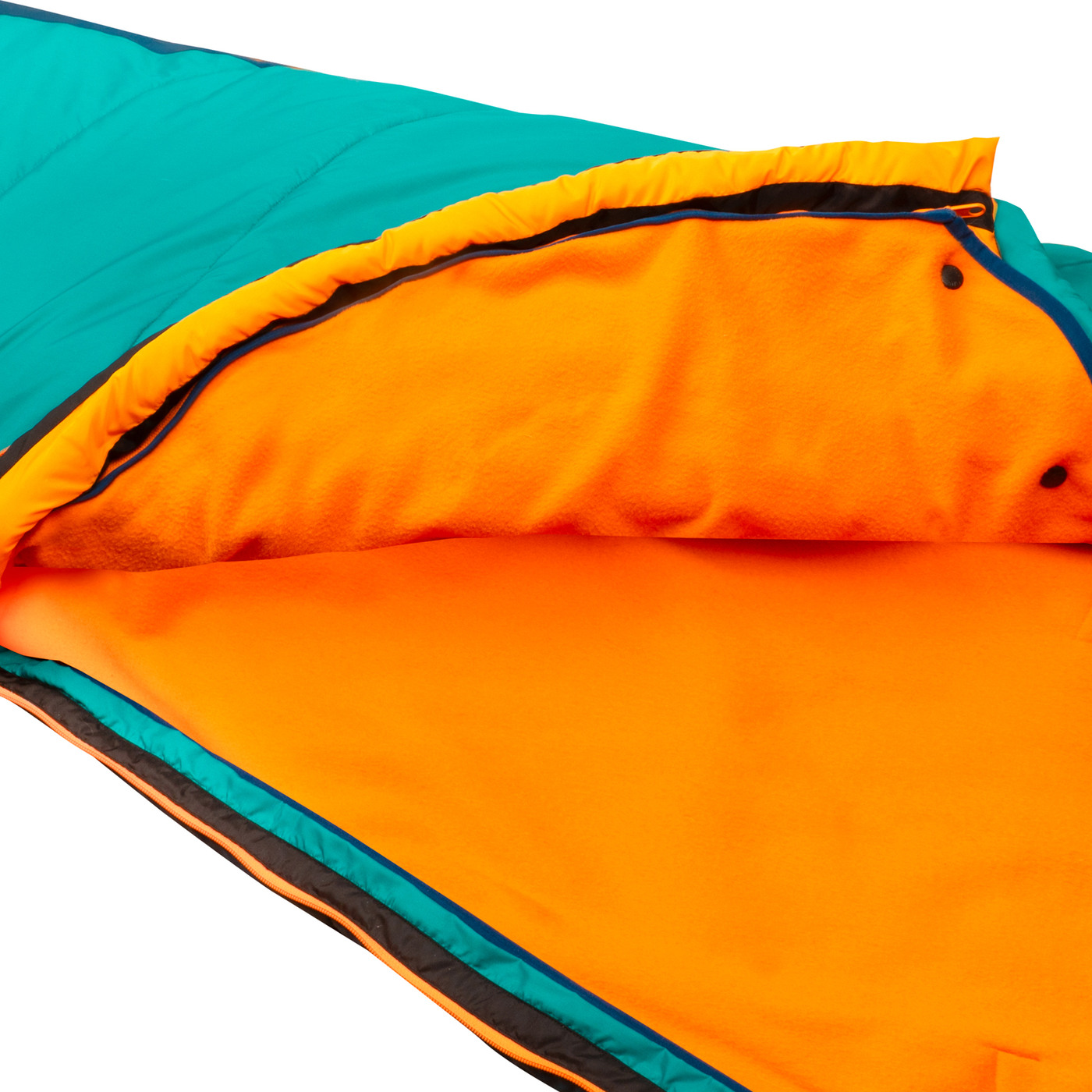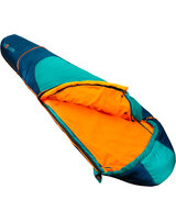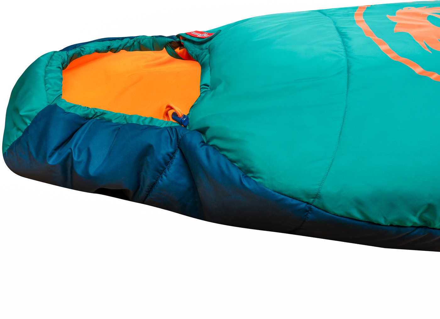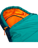 Der über 40 cm kürzbare Fußteil ermöglicht es auch jüngeren Kindern, den Schlafsack sehr nahe an der Körperkontur zu halten, dadurch wird zudem verhindert, dass kleinere Kinder zu tief in den Schlafsack rutschen können.