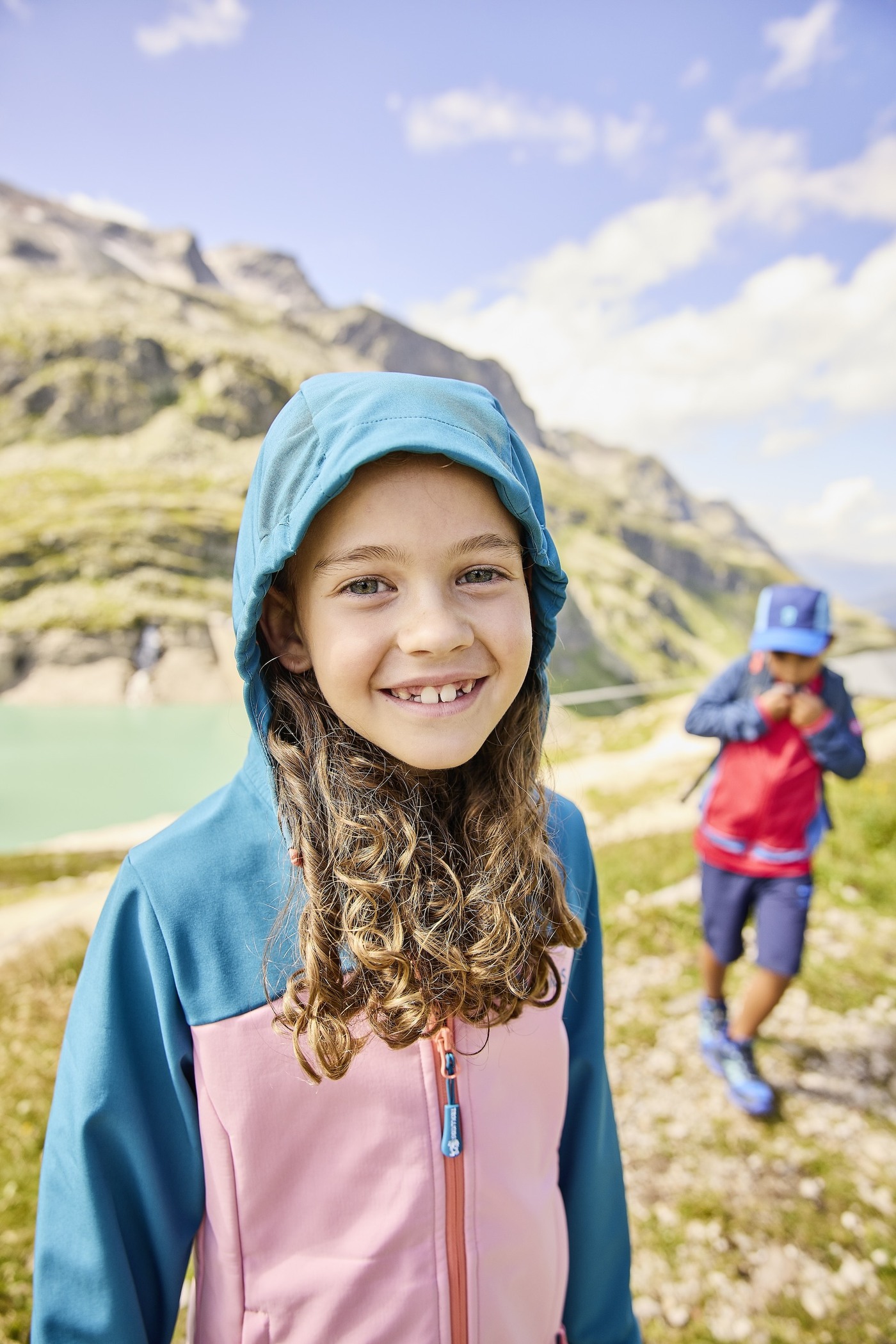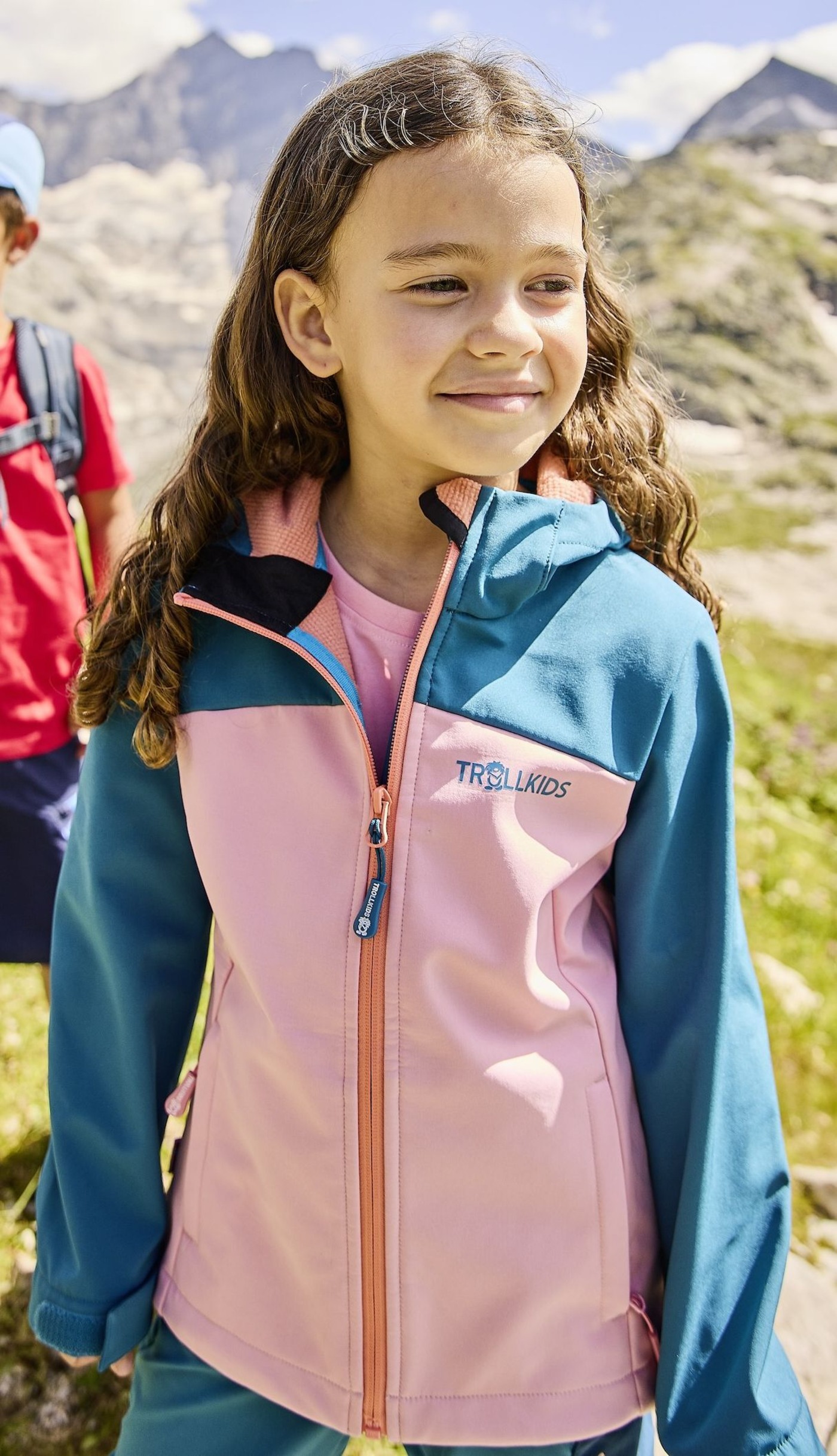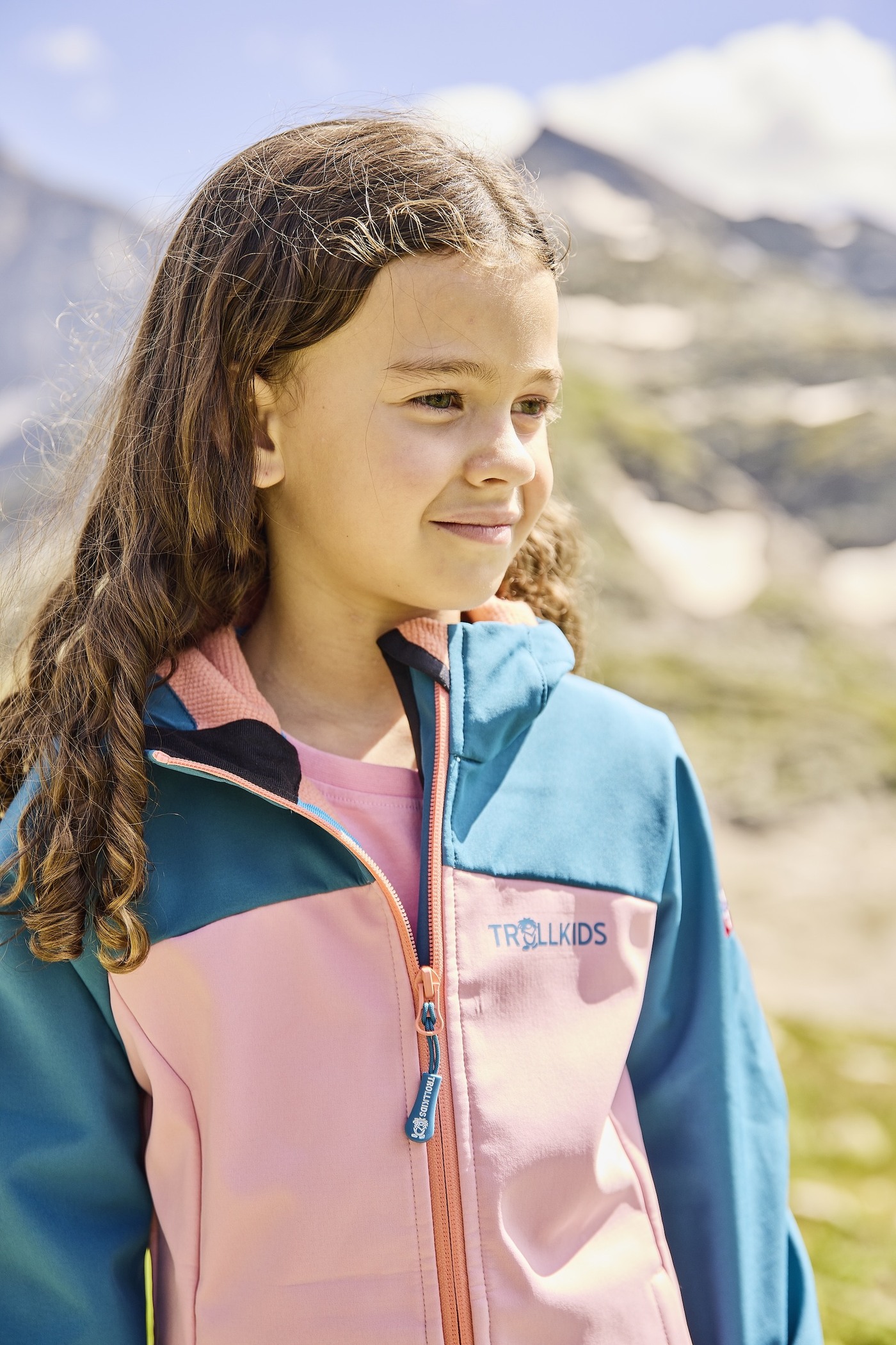 Die wasserabweisende und winddichte Softshell-Jacke GIRLS KRISTIANSAND JACKET XT von TROLLKIDS hält mit einem Futter aus weichem Waffelfleece angenehm warm.