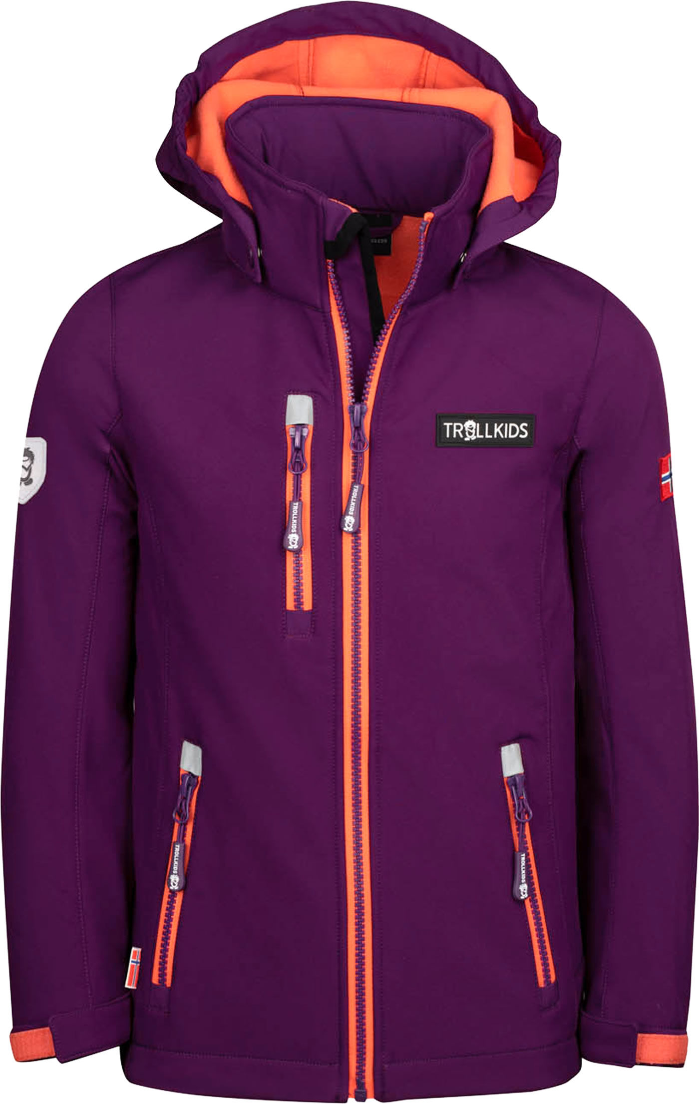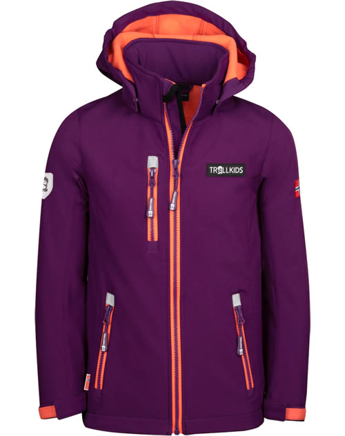 Softshell-Jacke mit abnehmbarer Kapuze für Mädchen (leicht tailliert) von TROLLKIDS mit Kontrastreißverschlüssen, wasserabweisend und winddicht, flexibel-elastisch und flauschig warm.  Ein echtes Muss für die Übergangszeit und für Aktivitäten, bei denen ein hoher Bewegungsfreiraum benötigt wird. Darüber hinaus ein modischer Hingucker! Klettverschlüsse an den Armen sorgen dafür, dass die Ärmellänge angepasst werden kann und kein Wind durch die Bündchen dringt. Reflektoren befinden sich vorne und hinten. Innen ist die Jacke mit weichem Fleece ausgestattet.