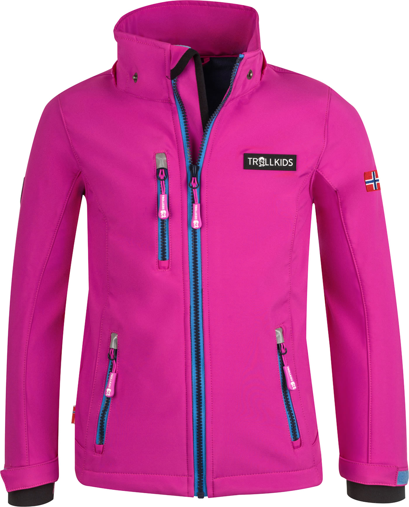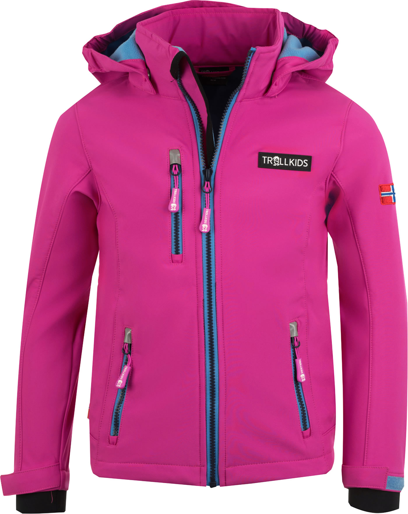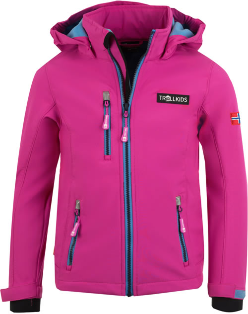Softshell-Jacke mit abnehmbarer Kapuze für Mädchen (leicht tailliert) von TROLLKIDS mit Kontrastreißverschlüssen, wasserabweisend und winddicht, flexibel-elastisch und flauschig warm.  Ein echtes Muss für die Übergangszeit und für Aktivitäten, bei denen ein hoher Bewegungsfreiraum benötigt wird. Darüber hinaus ein modischer Hingucker! Klettverschlüsse an den Armen sorgen dafür, dass die Ärmellänge angepasst werden kann und kein Wind durch die Bündchen dringt. Reflektoren befinden sich vorne und hinten. Innen ist die Jacke mit weichem Fleece ausgestattet.