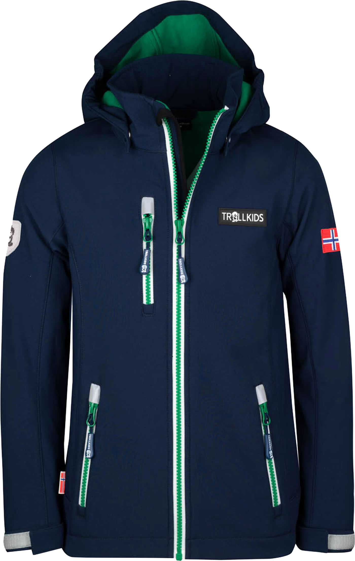 Softshell-Jacke mit abnehmbarer Kapuze von TROLLKIDS mit Kontrastreißverschlüssen, wasserabweisend und winddicht, flexibel-elastisch und flauschig warm.  Ein echtes Muss für die Übergangszeit und für Aktivitäten, bei denen ein hoher Bewegungsfreiraum benötigt wird. Darüber hinaus ein modischer Hingucker! Klettverschlüsse an den Armen sorgen dafür, dass die Ärmellänge angepasst werden kann und kein Wind durch die Bündchen dringt. Reflektoren befinden sich vorne und hinten. Innen ist die Jacke mit weichem Fleece ausgestattet.