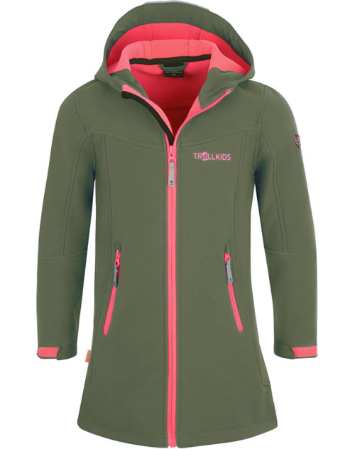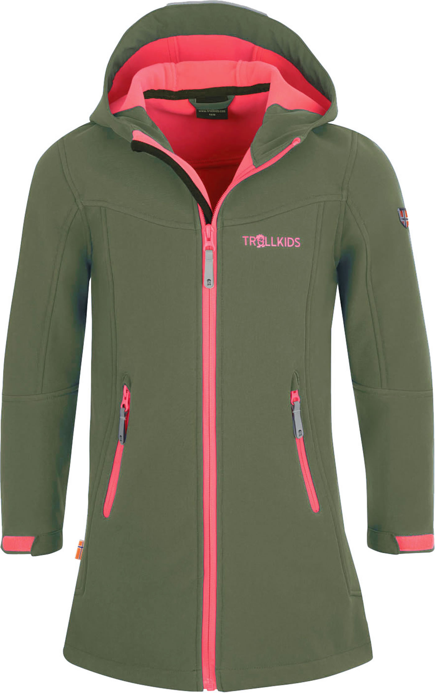 Softshell-Mantel von TROLLKIDS für Mädchen (leicht tailliert) mit Kontrastreißverschlüssen, wasserabweisend und winddicht, flexibel-elastisch und flauschig warm.  Ein echtes Muss für die Übergangszeit und für Aktivitäten, bei denen ein hoher Bewegungsfreiraum benötigt wird. Darüber hinaus ein modischer Hingucker! Klettverschlüsse an den Armen sorgen dafür, dass die Ärmellänge angepasst werden kann und kein Wind durch die Bündchen dringt. Reflektoren befinden sich an den Armen; an den Oberarmen leuchtet die norwegische Flagge und der beliebte Lonely Troll aus dem Trollkids-Logo.