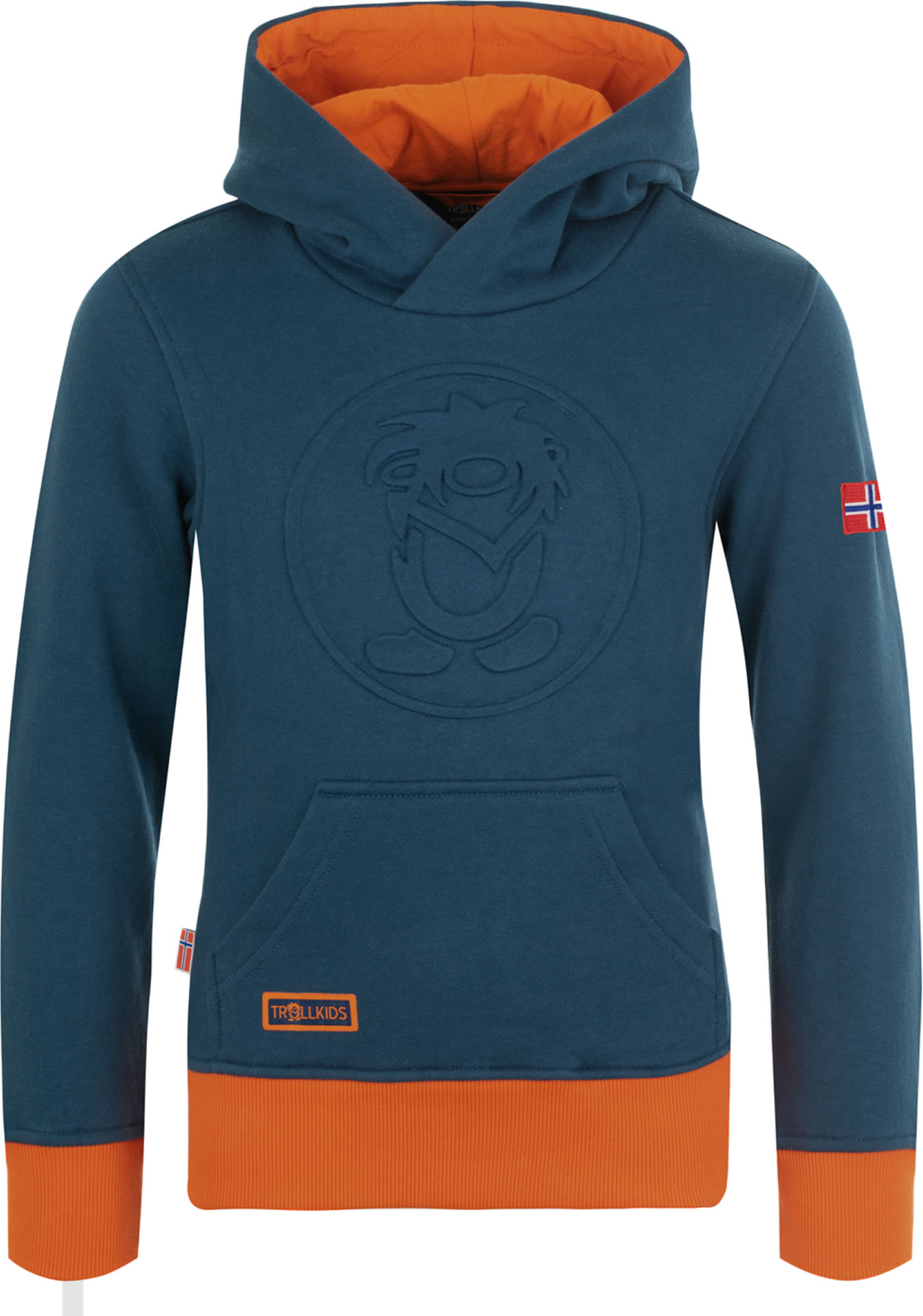 Der gemütliche Kapuzen-Pullover KIDS LILLEHAMMER SWEATER von TROLLKIDS mit Trolllogo-Prägedruck auf der Vorderseite hat farblich abgesetzte Ripp-Bündchen und eine gefütterte Kapuze. Logo-Fähnchen an der Seitennaht.