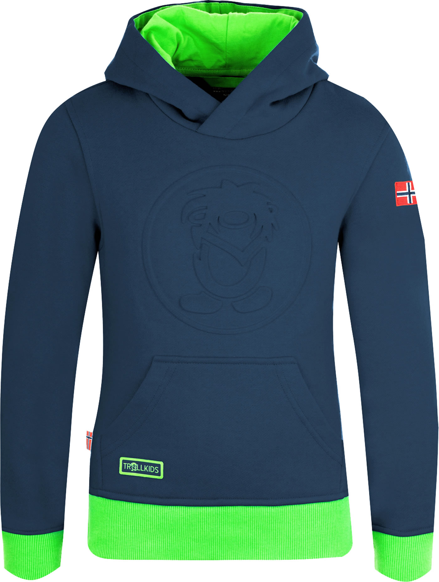 Der gemütliche Kapuzen-Pullover KIDS LILLEHAMMER SWEATER von TROLLKIDS mit Trolllogo-Prägedruck auf der Vorderseite hat farblich abgesetzte Ripp-Bündchen und eine gefütterte Kapuze. Logo-Fähnchen an der Seitennaht.