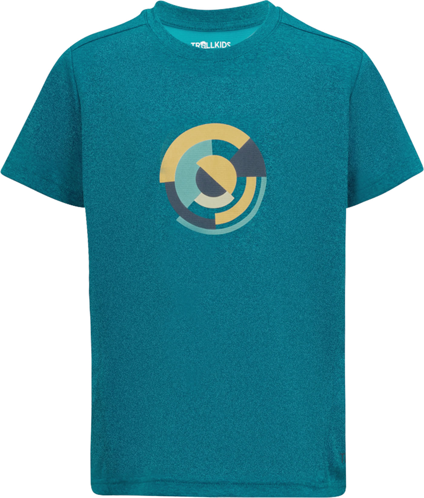 Das KIDS SOGNEFJORD T von TROLLKIDS ist ein leichtes Funktions-T-Shirt mit etwas längerem, körpernahem Schnitt und signifikantem grafischen Print auf der Vorderseite. Der Stoff ist besonders weich und anschmiegsam und trocknet schnell.