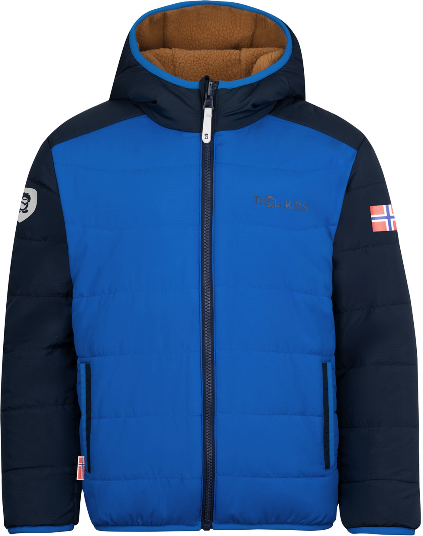 Gleich zwei stylische Jacken von TROLLKIDS in einer - das bietet die winddichte KIDS SANDVIKA TURNOVER JACKET: Ist die glatte, gesteppte Seite der wattierten Jacke außen, so wärmt das kuschelige Sherpa-Fleece von innen. In dem Fall hat die Jacke zwei seitliche Eingrifftaschen und reflektierende Elemente. Ist die Seite mit dem charakteristischen Sherpa-Fleece außen, so besticht die Jacke durch ihren Retro-Look mit zwei seitlichen Reißverschlusstaschen und einer Brusttasche, ebenfalls mit Reißverschluss, die in Farbe und Material abgesetzt ist.