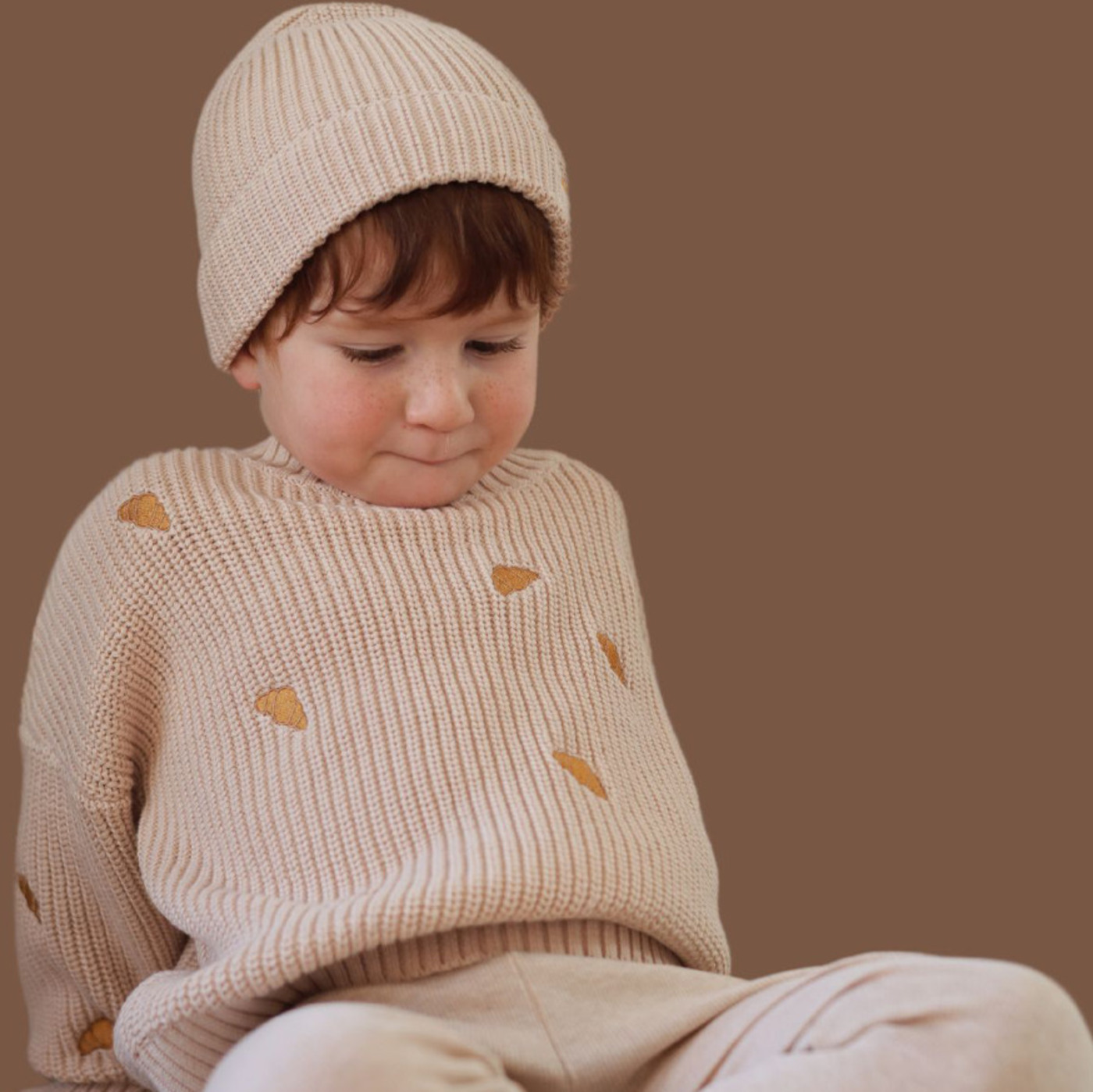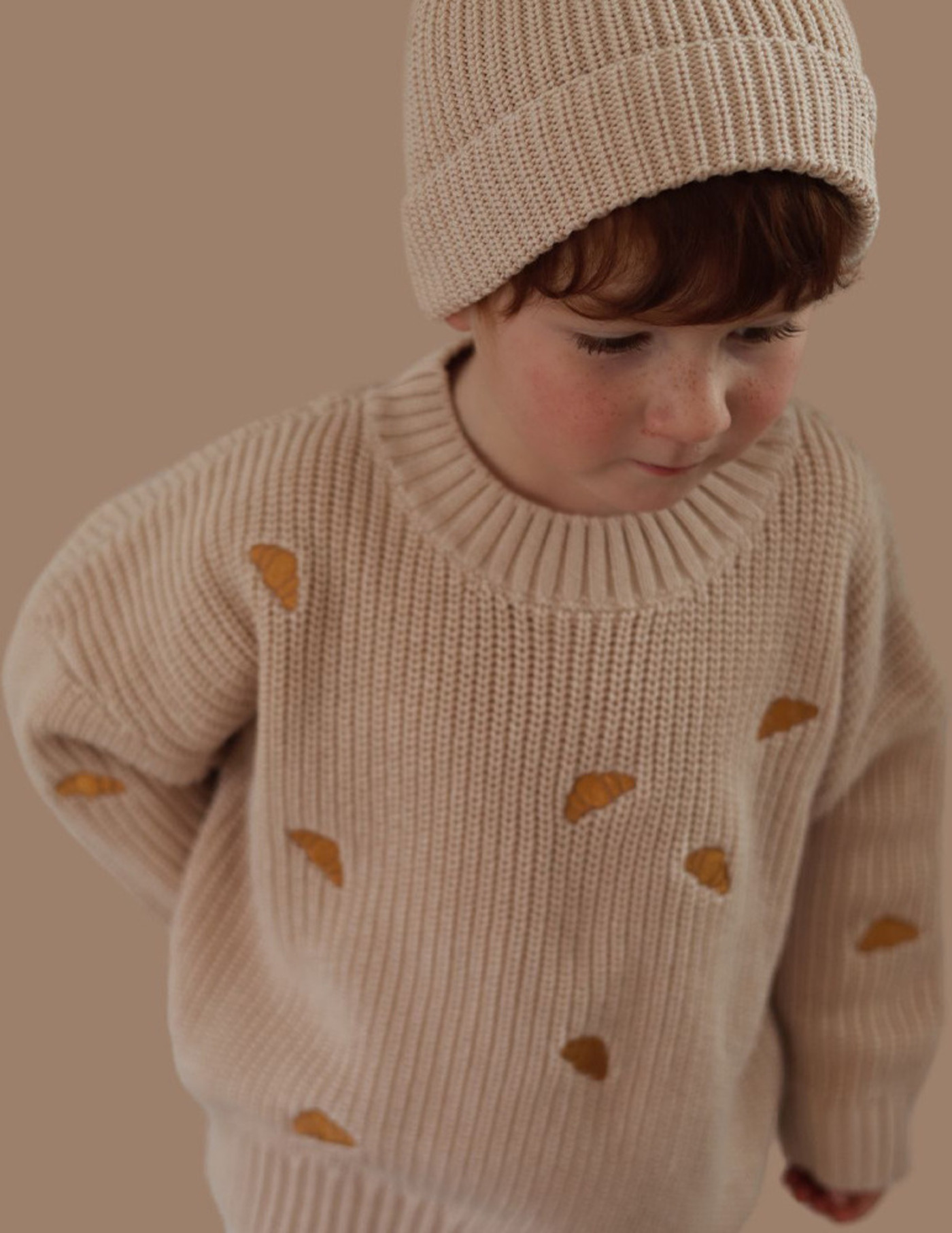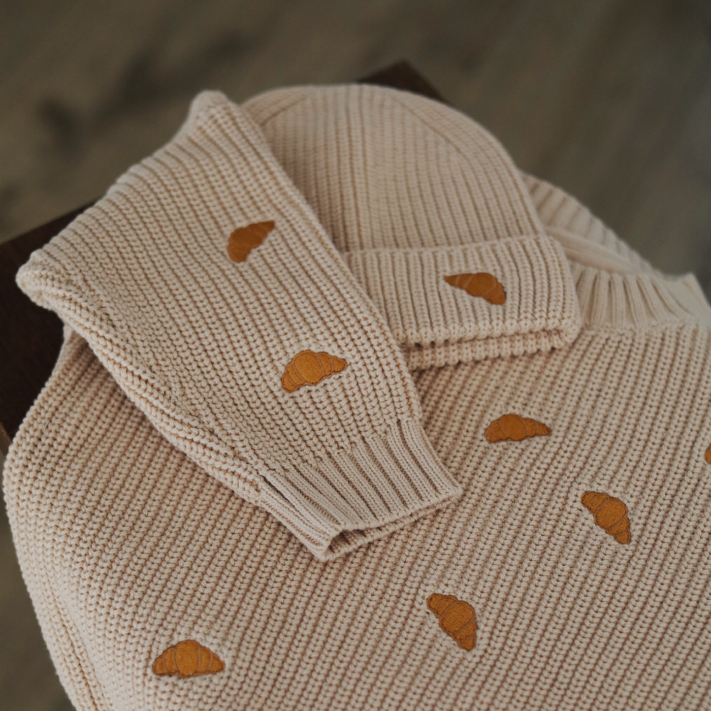 Die aufgestickten Croissants sind sorgfältig auf dem Pullover platziert und sorgen für einen einzigartigen Look 🥐