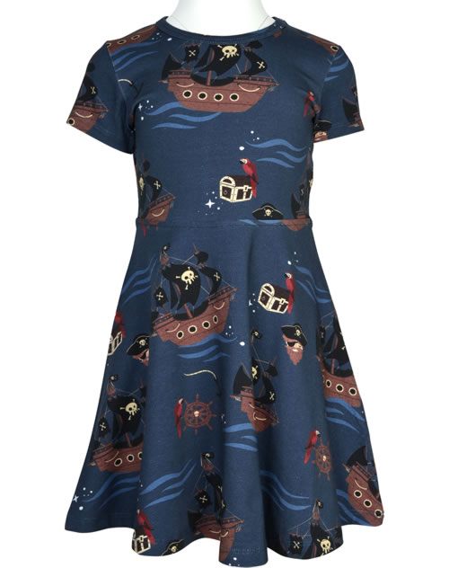 Kurzarm-Kleid aus weichem Baumwoll-Jersey von WALKIDDY. Das tolle Design mit den bunten Piratenschiffen macht dieses Kleid zu einem Hingucker. Das Kleid ist leicht tailliert geschnitten und der weite Rock macht jede Bewegung mit. Der Stoff aus ökologischer Baumwolle bietet einen hohen Tragekomfort.