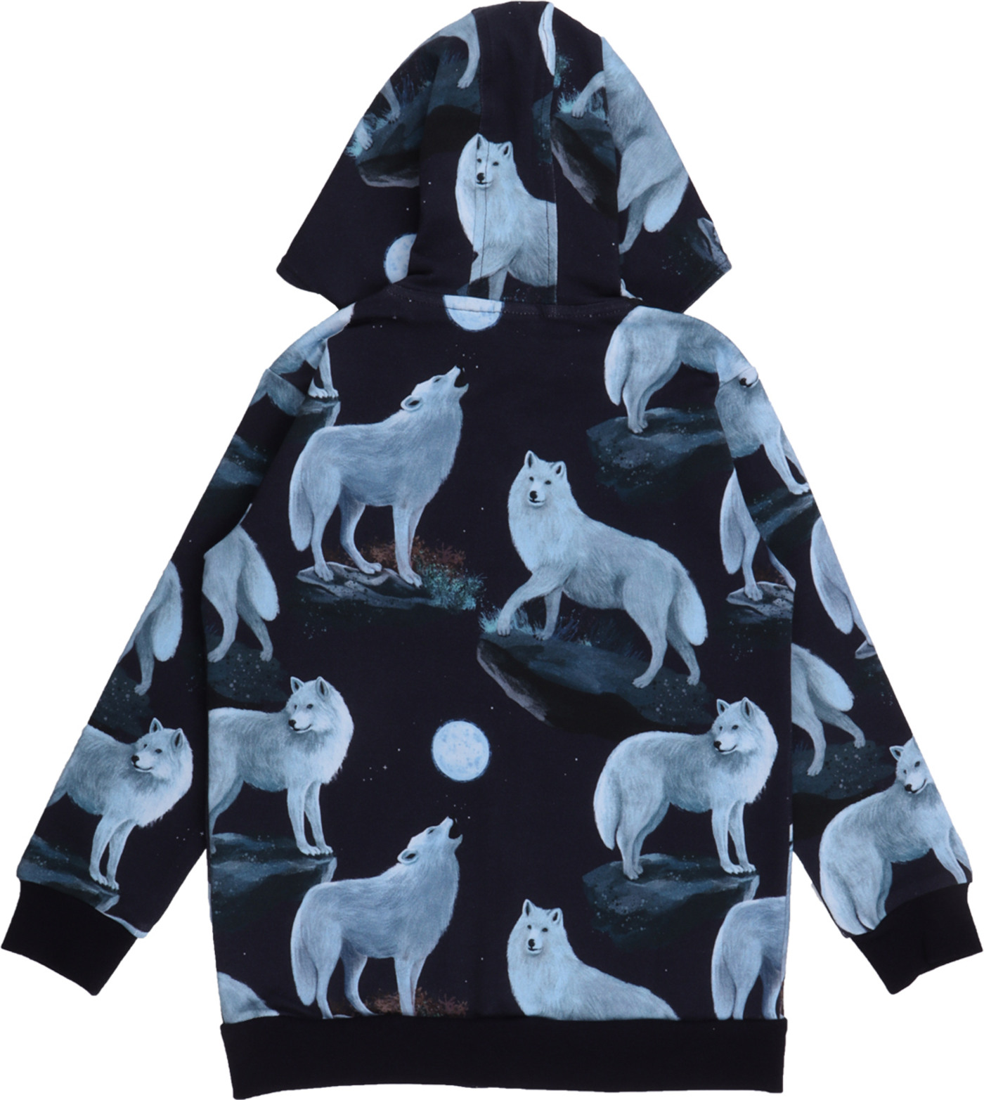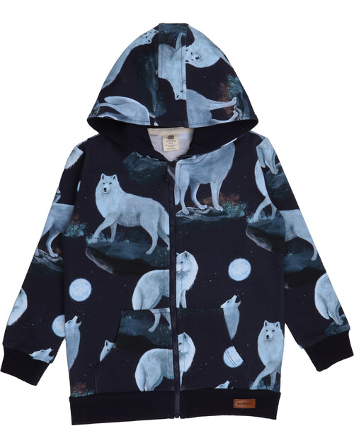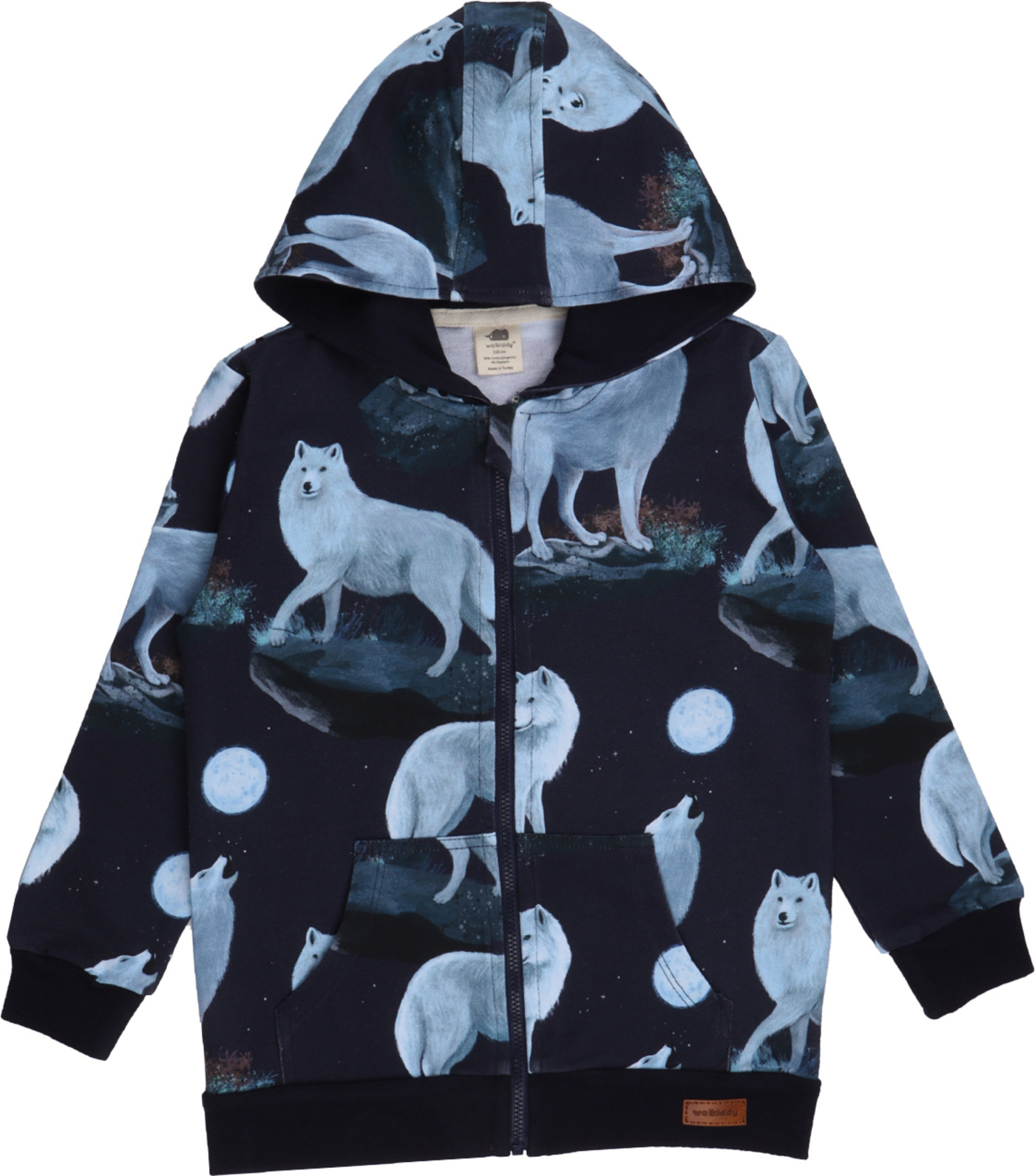 Sweatjacke mit Kapuze von WALKIDDY. Das Design mit den weißen Wölfen ist der absolute Blickfang. Die gefütterte Kapuze und die beiden Taschen auf der Vorderseite sind tolle Details. Das Material aus biologischer Baumwolle und der lockere Schnitt sorgen für einen hohen Tragekomfort. Innen ist die Sweatjacke weich angeraut und dadurch kuschelig warm.