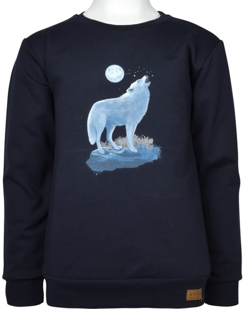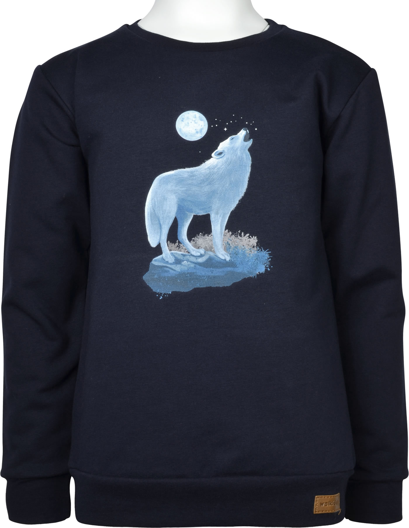 Warmes Sweatshirt mit angerauter Innenseite von WALKIDDY. Der Print mit dem weißen Wolf und dem Vollmond ist der absolute Blickfang. Das Material aus biologischer Baumwolle und der lockere Schnitt sorgen für einen hohen Tragekomfort.