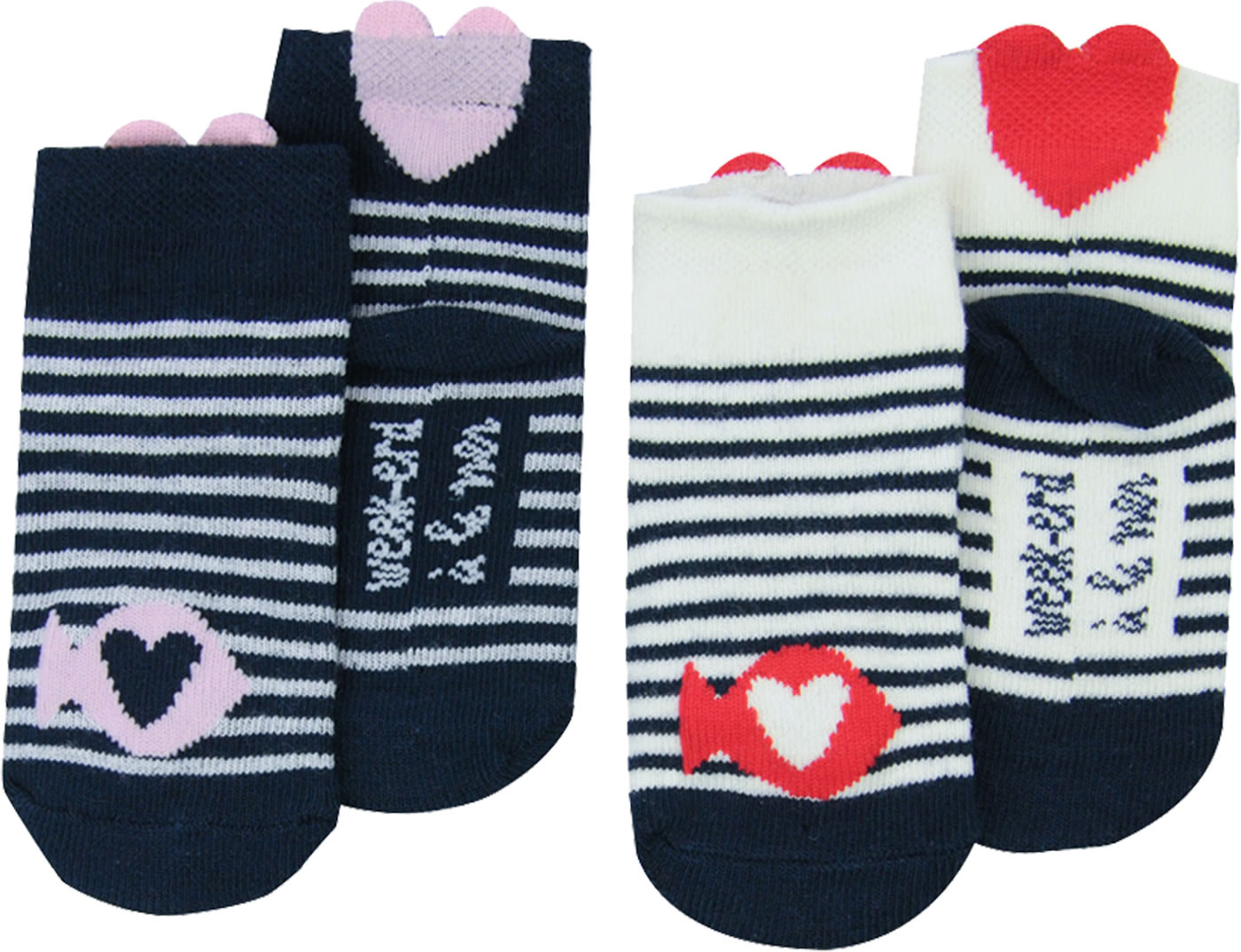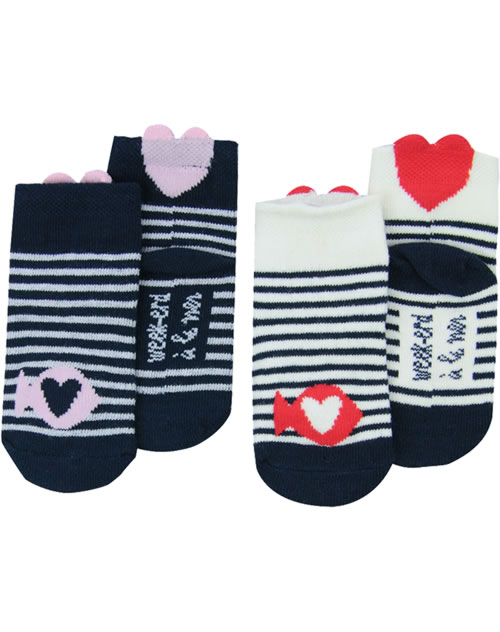 Gestreifte Socken im 2er Pack von WEEKEND A LA MER für Mädchen. Schöne Details sind die kleinen Fische auf der Vorderseite und die Herzen, die über den Rand hinausragen.